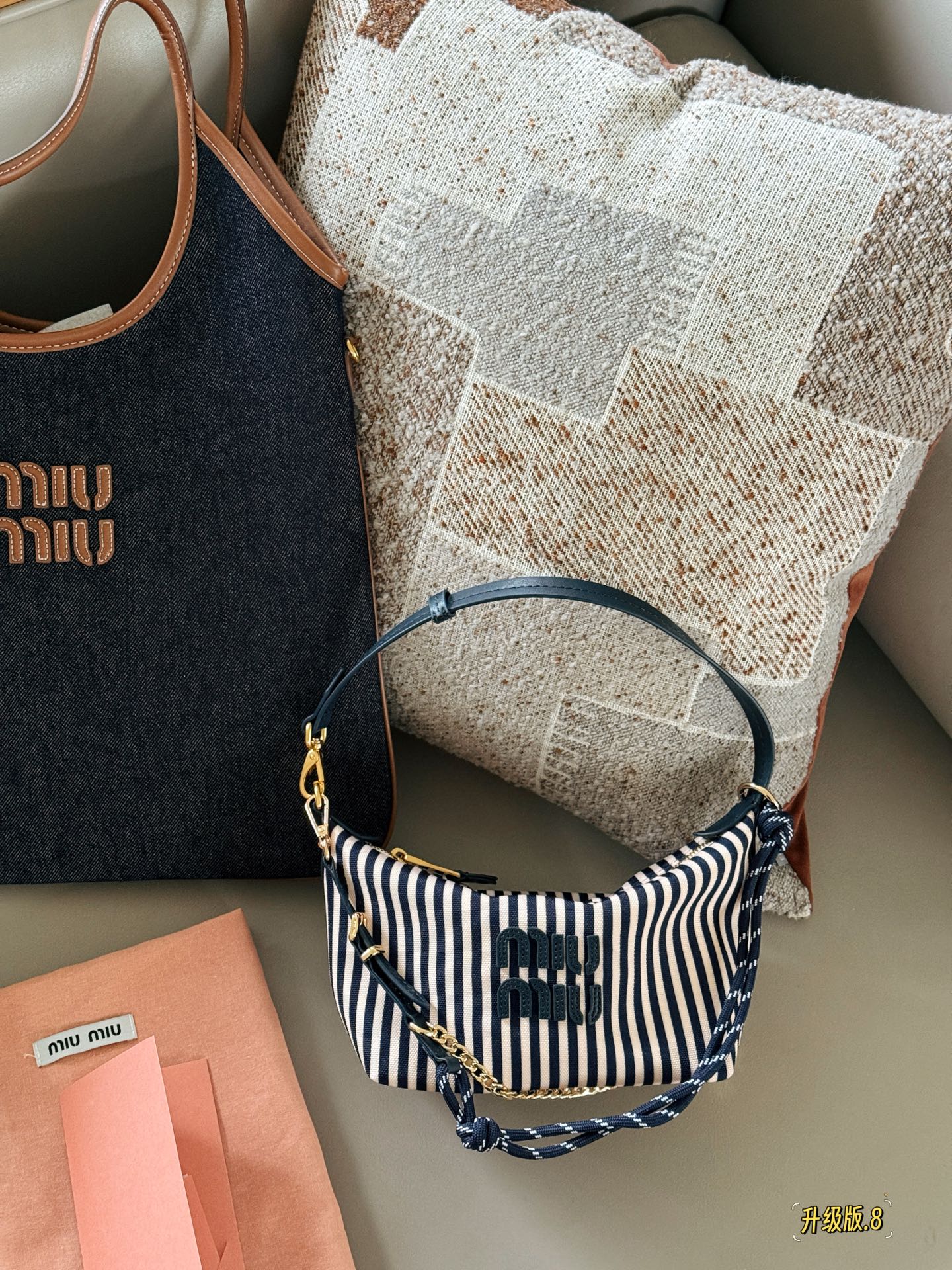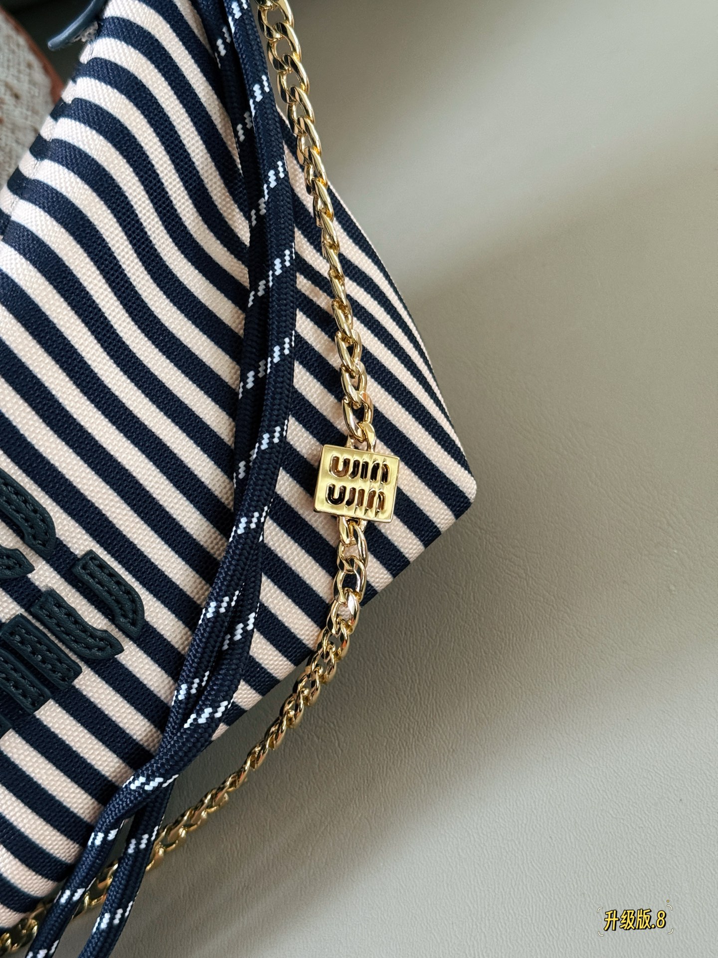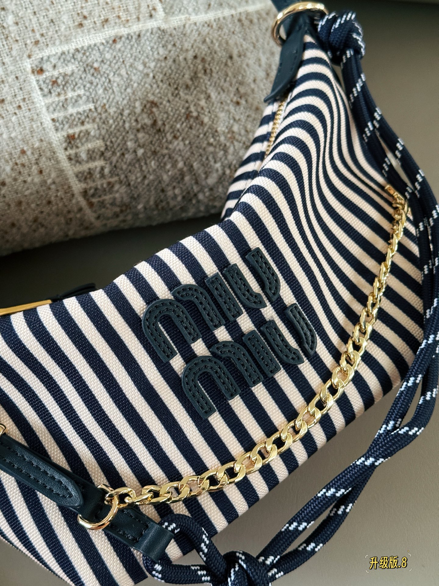 This Miu Miu canvas lunchbox bag features a cool striped design and braided handle. Perfect for adding a touch of summer to any outfit!