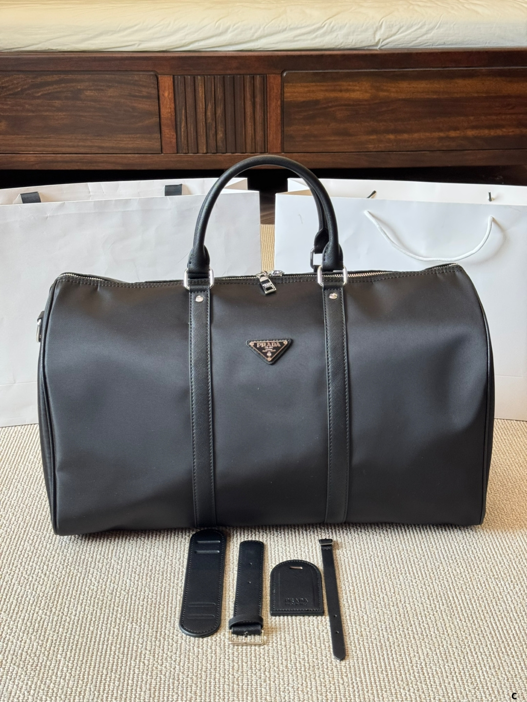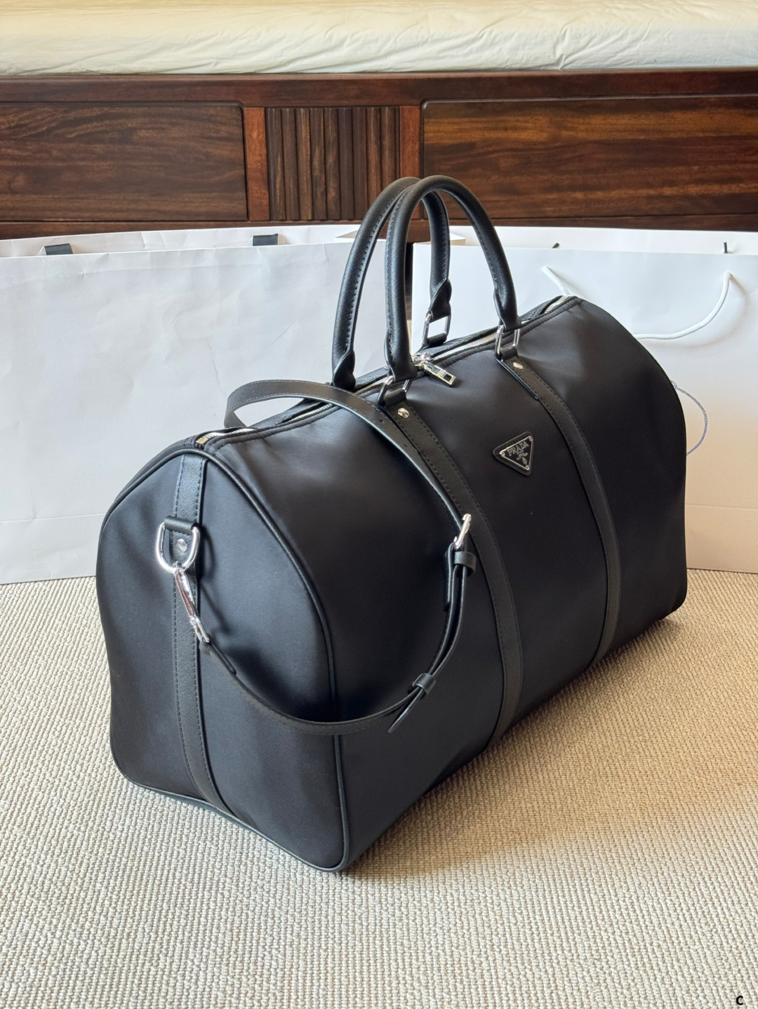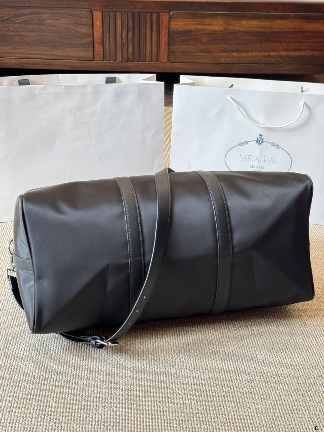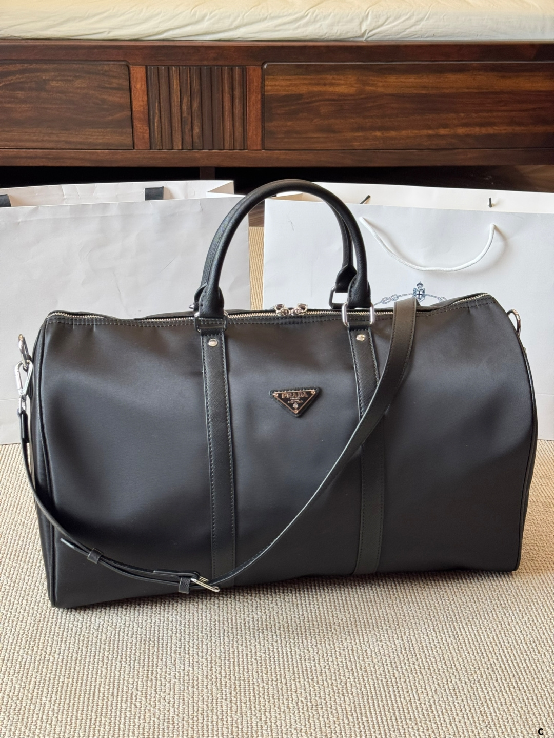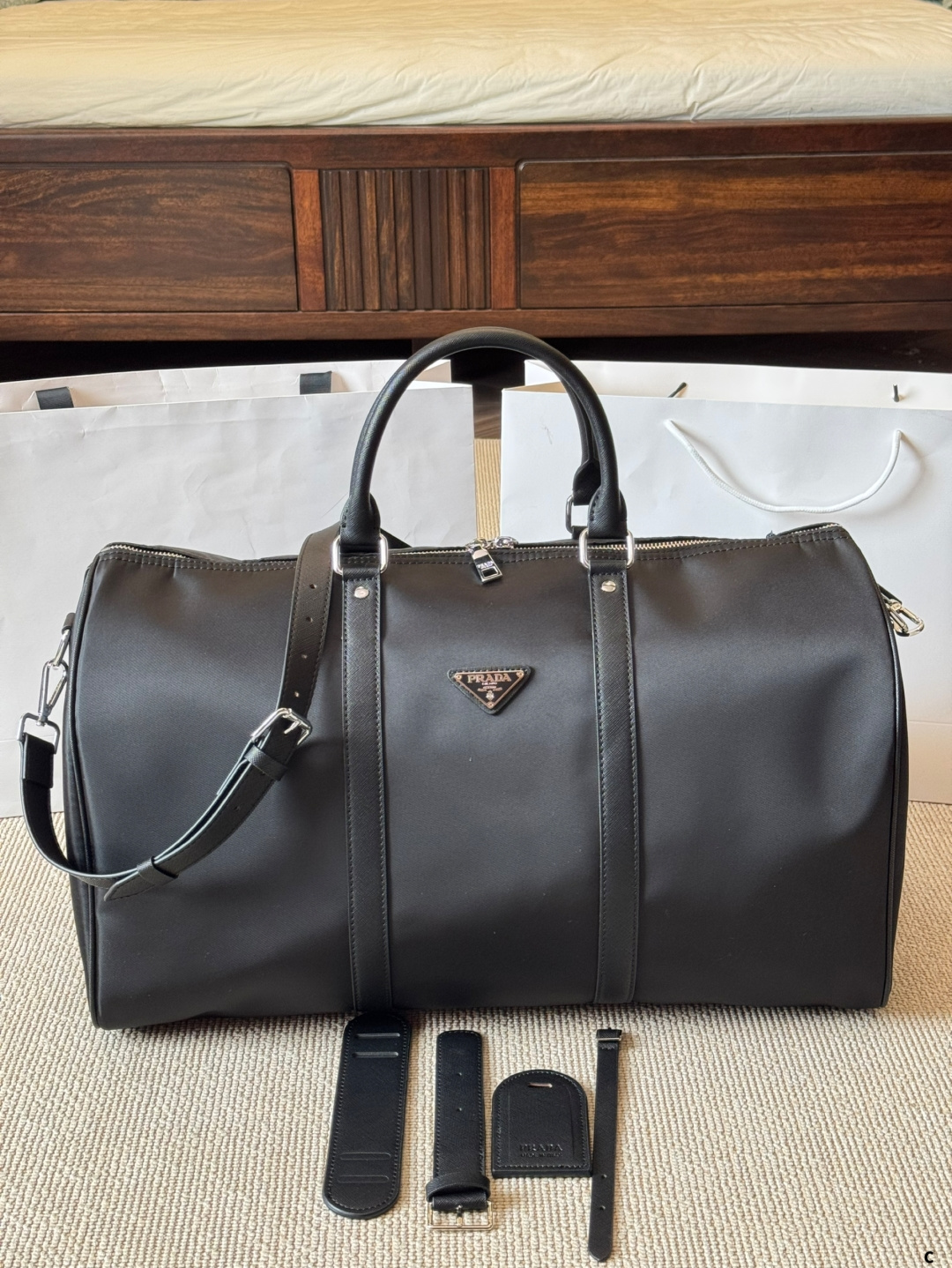 Replica Prada airport bag with impeccable craftsmanship. Same design and materials. Detachable interior, premium fabric, and precise stitching. Size: 50cm.