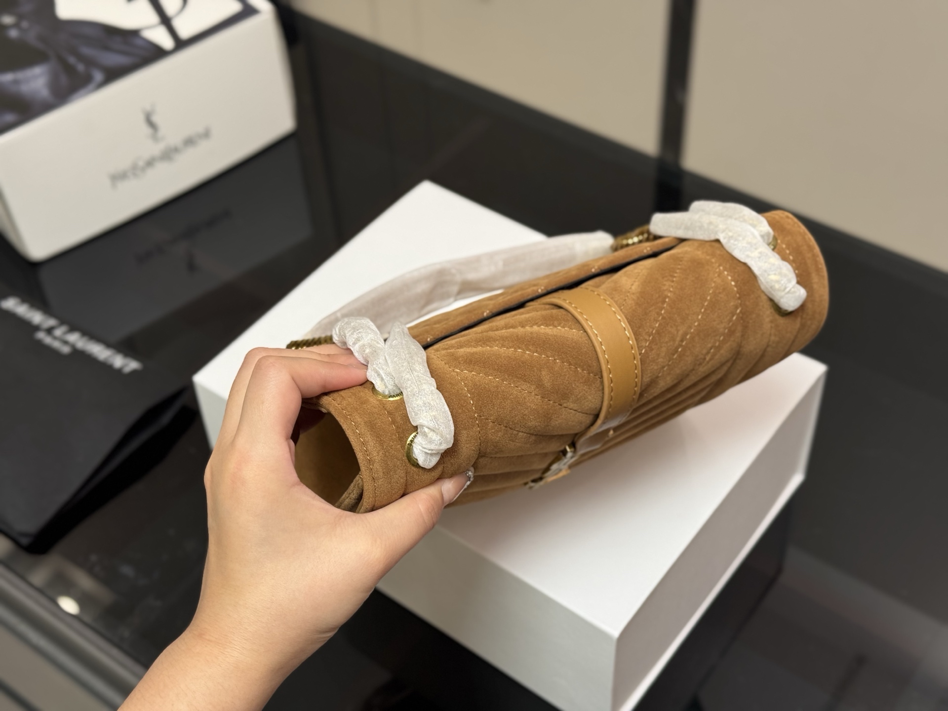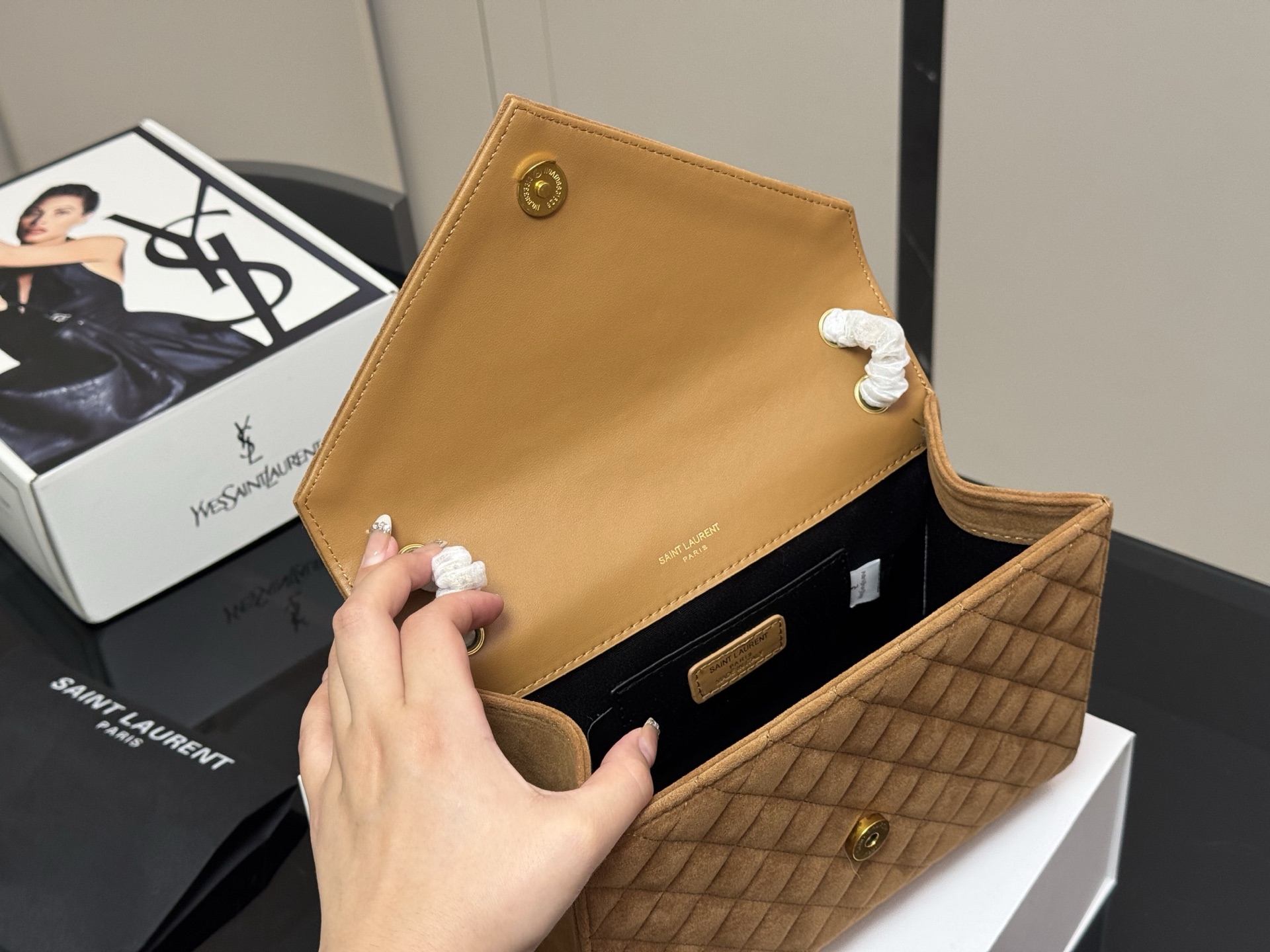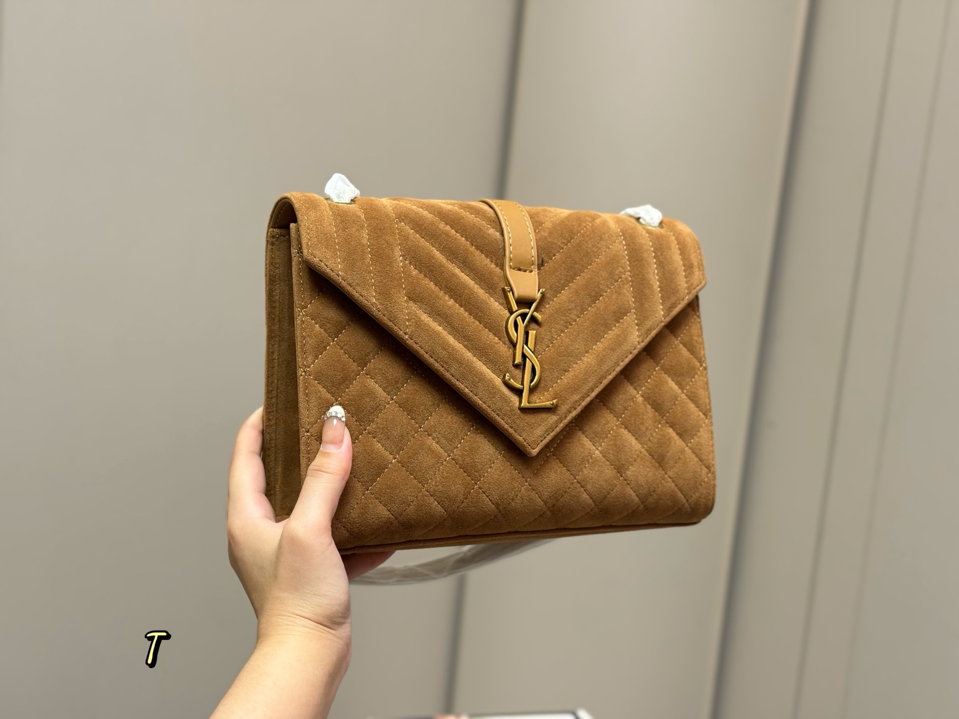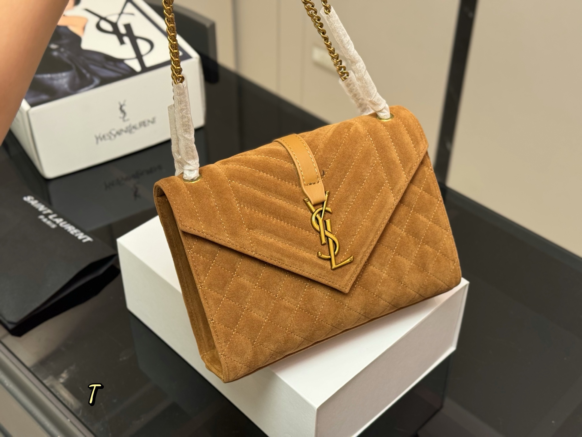 Elevate your style with this Yves Saint Laurent Envelope bag. Crafted in Italy from soft brown suede, it features the iconic gold-tone YSL logo.