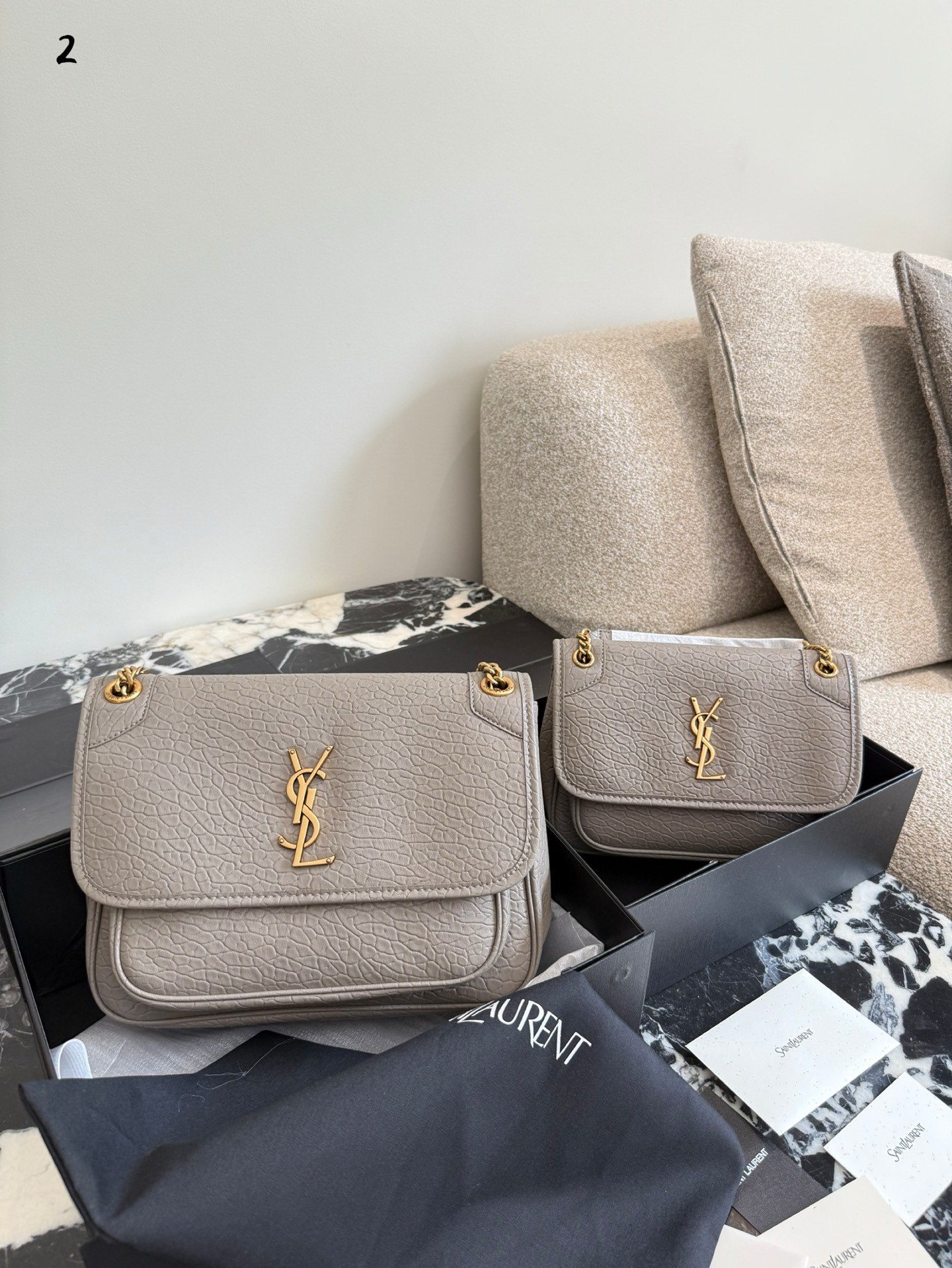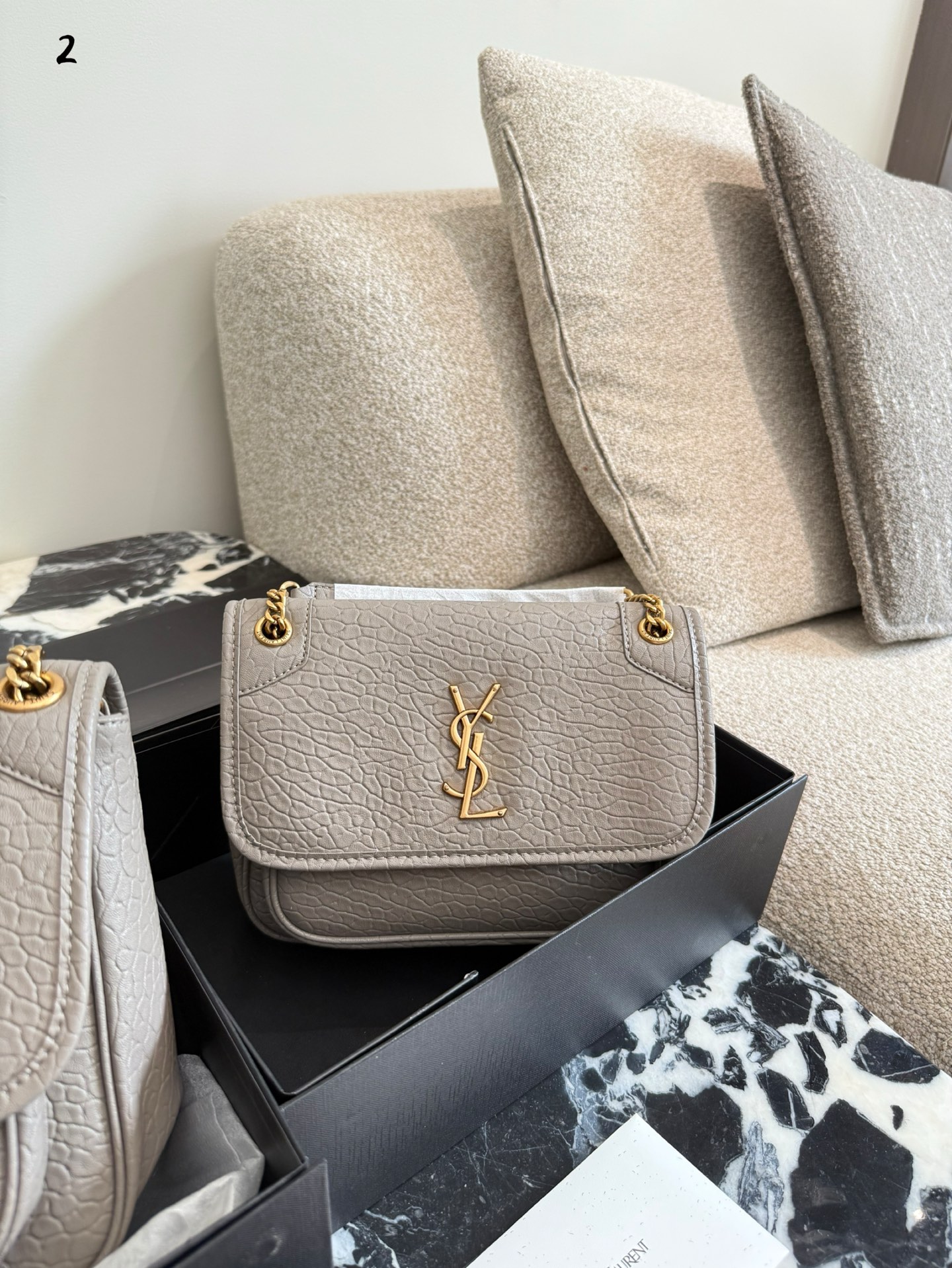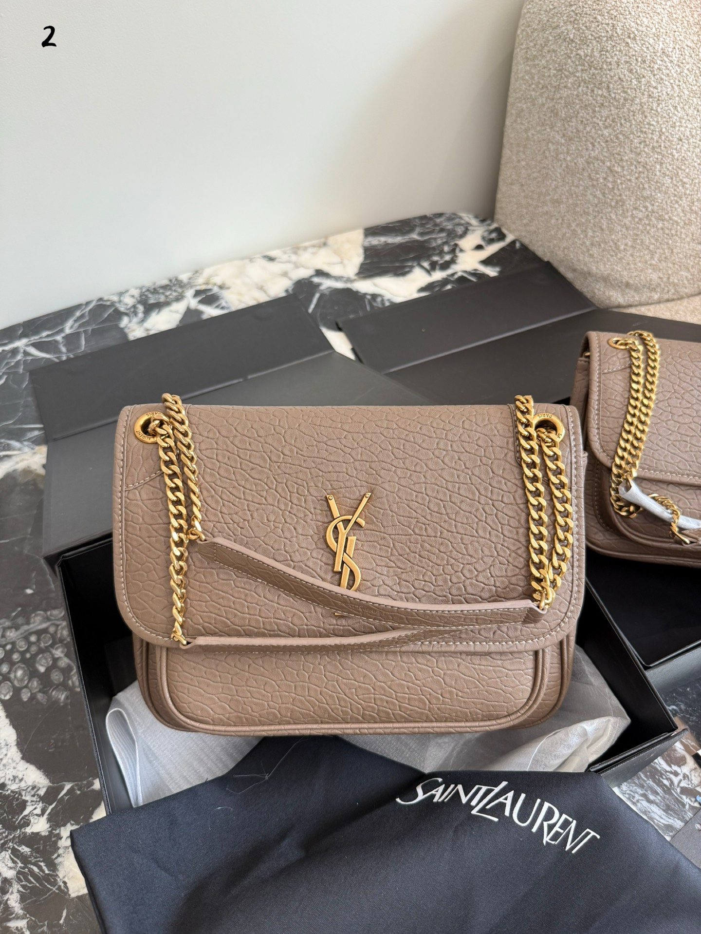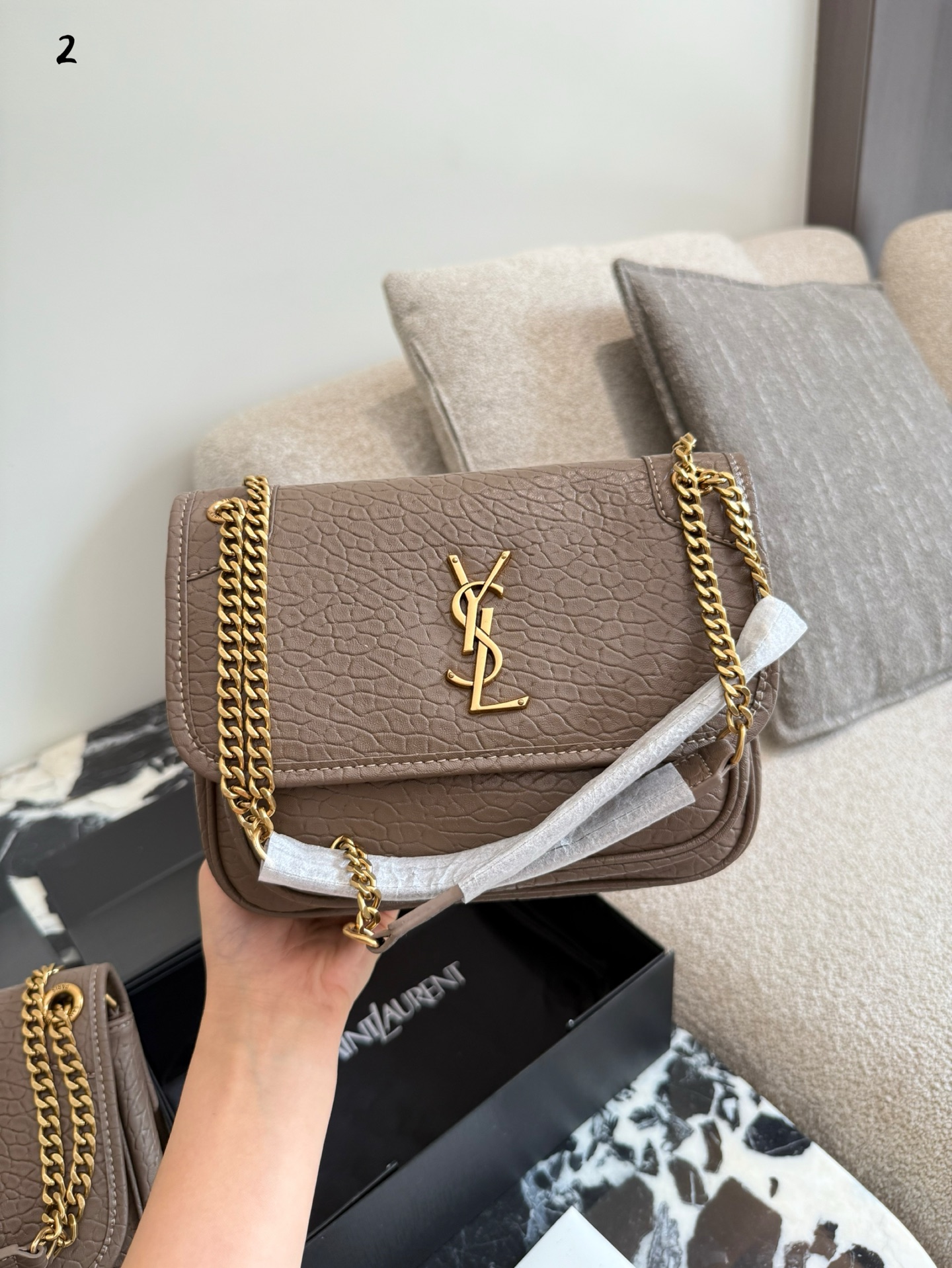New Yves Saint Laurent Niki bag in taupe grained leather. Features a chain strap and YSL signature hardware. Compact and stylish.