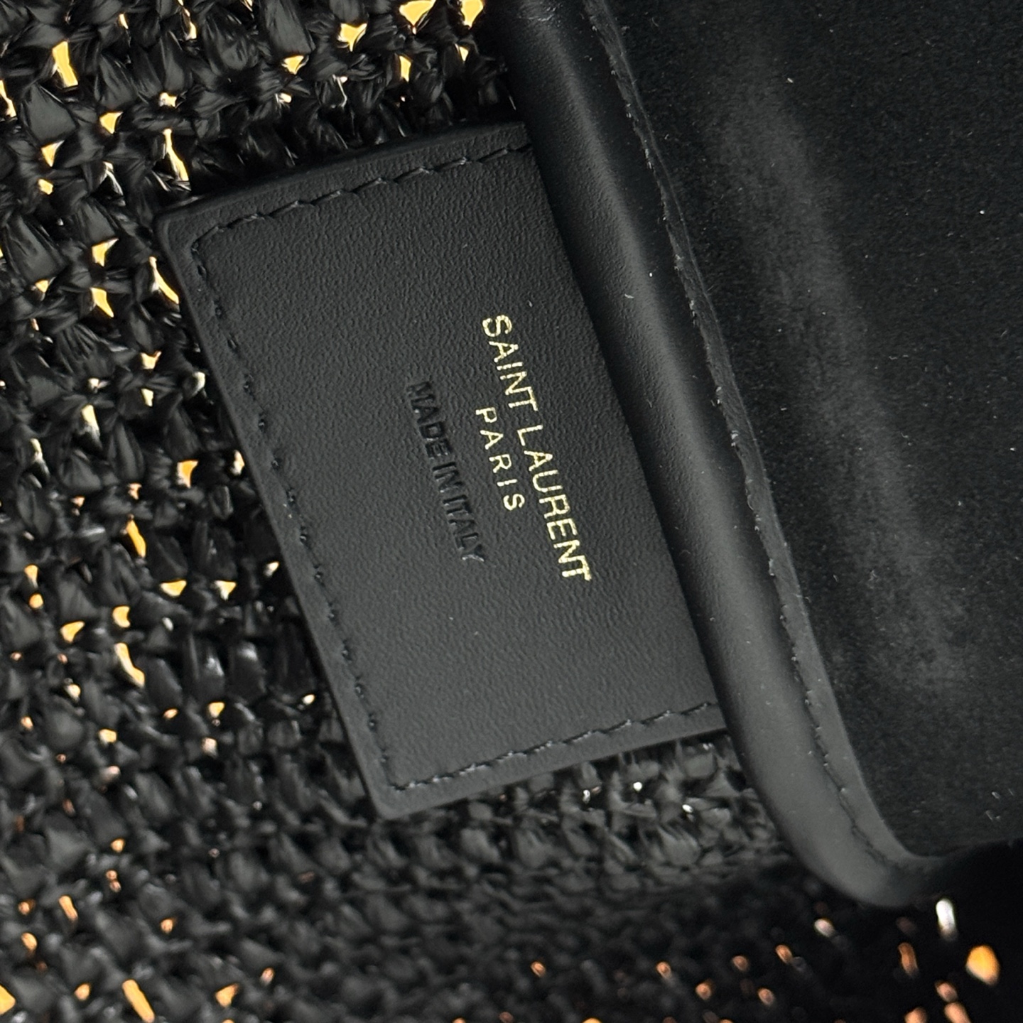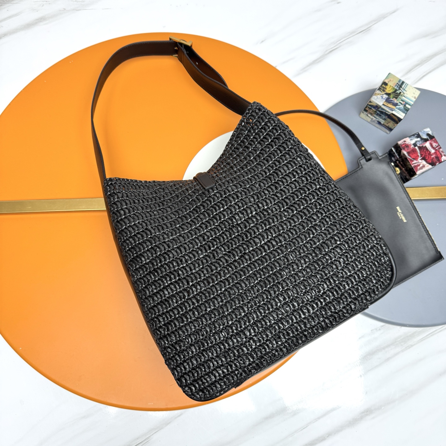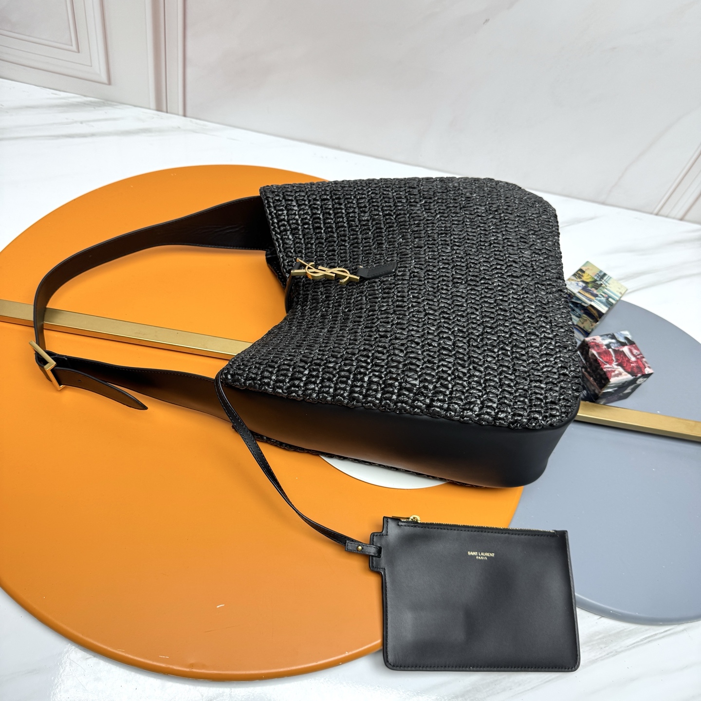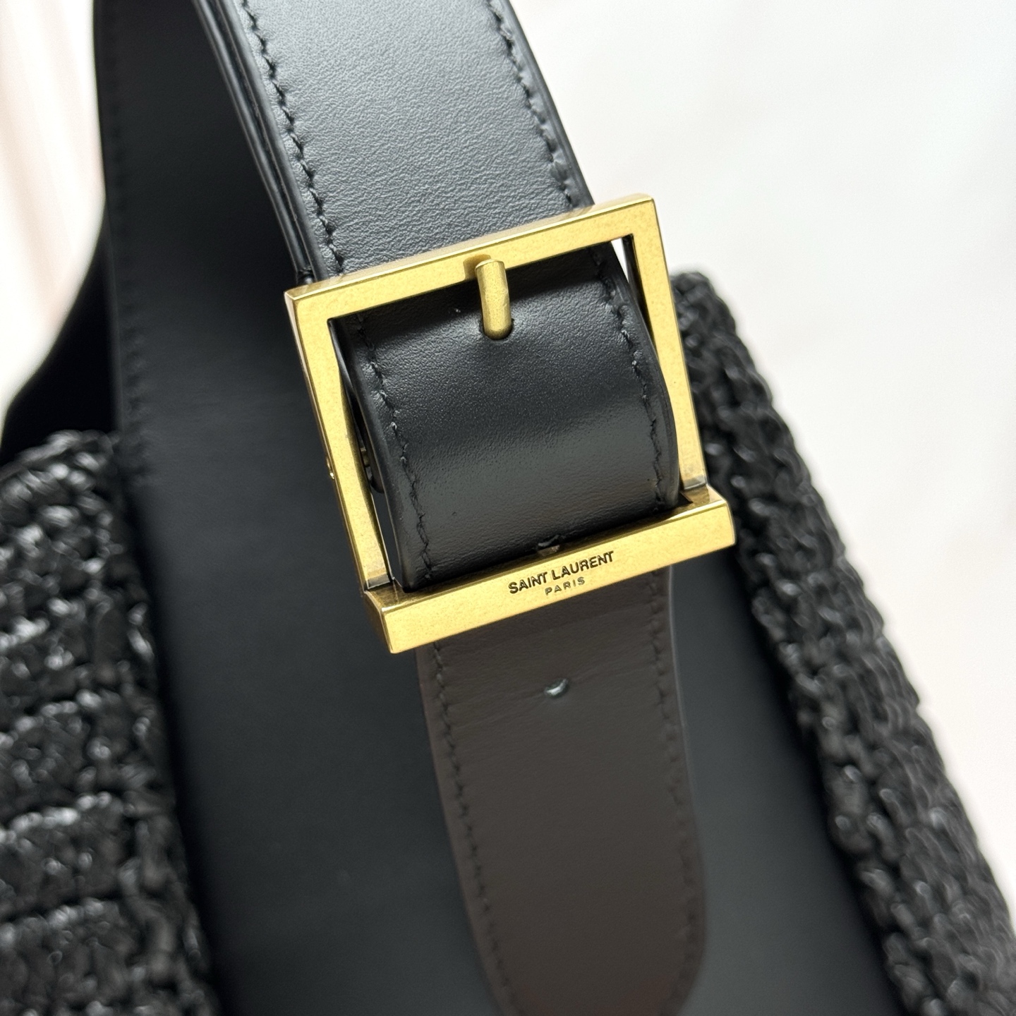 Elevate your style with this black woven raffia Hobo bag. Features a gold-tone metal YSL signature and a distinctive silhouette.