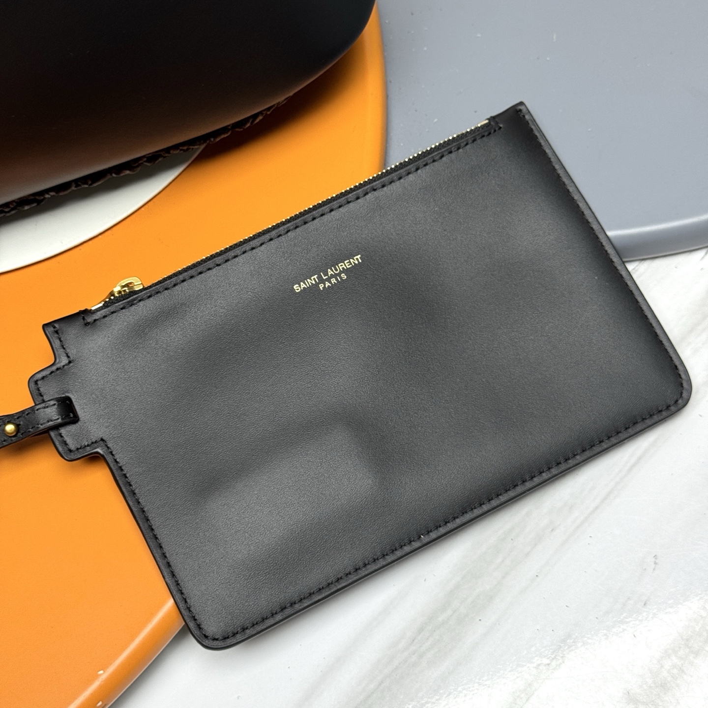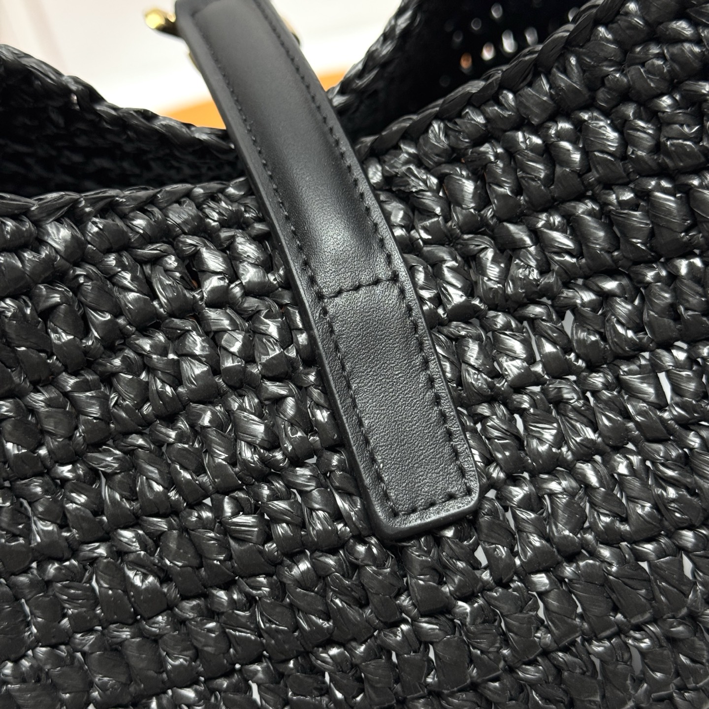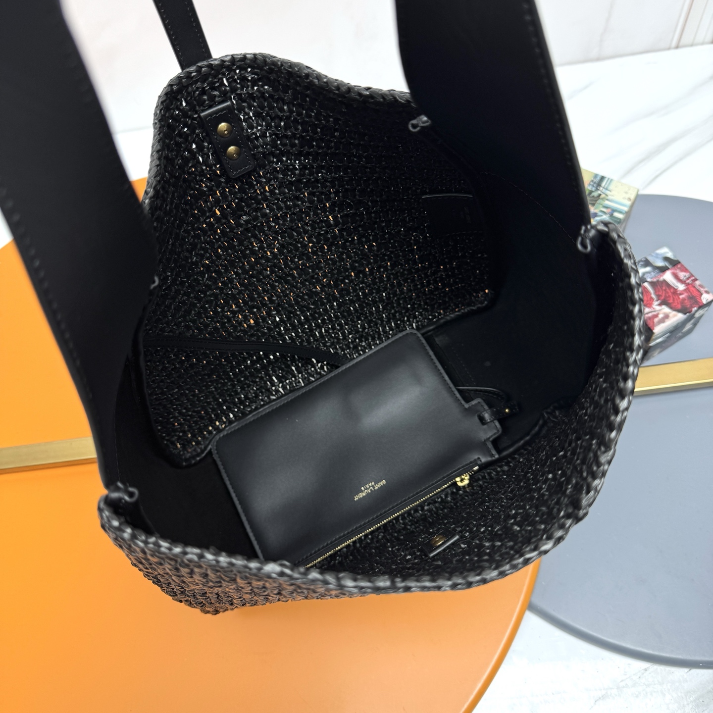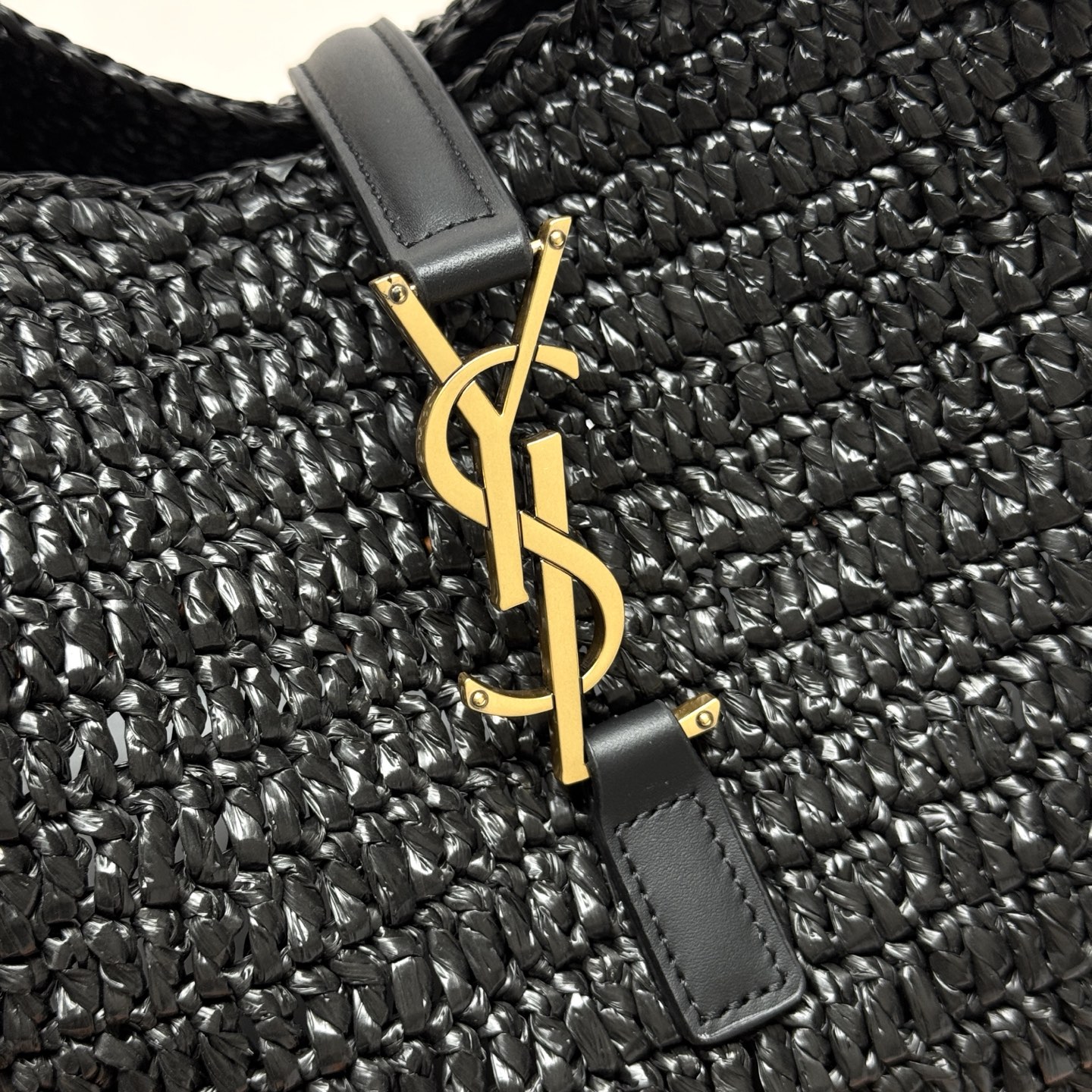 Elevate your style with this black woven raffia Hobo bag. Features a gold-tone metal YSL signature and a distinctive silhouette.