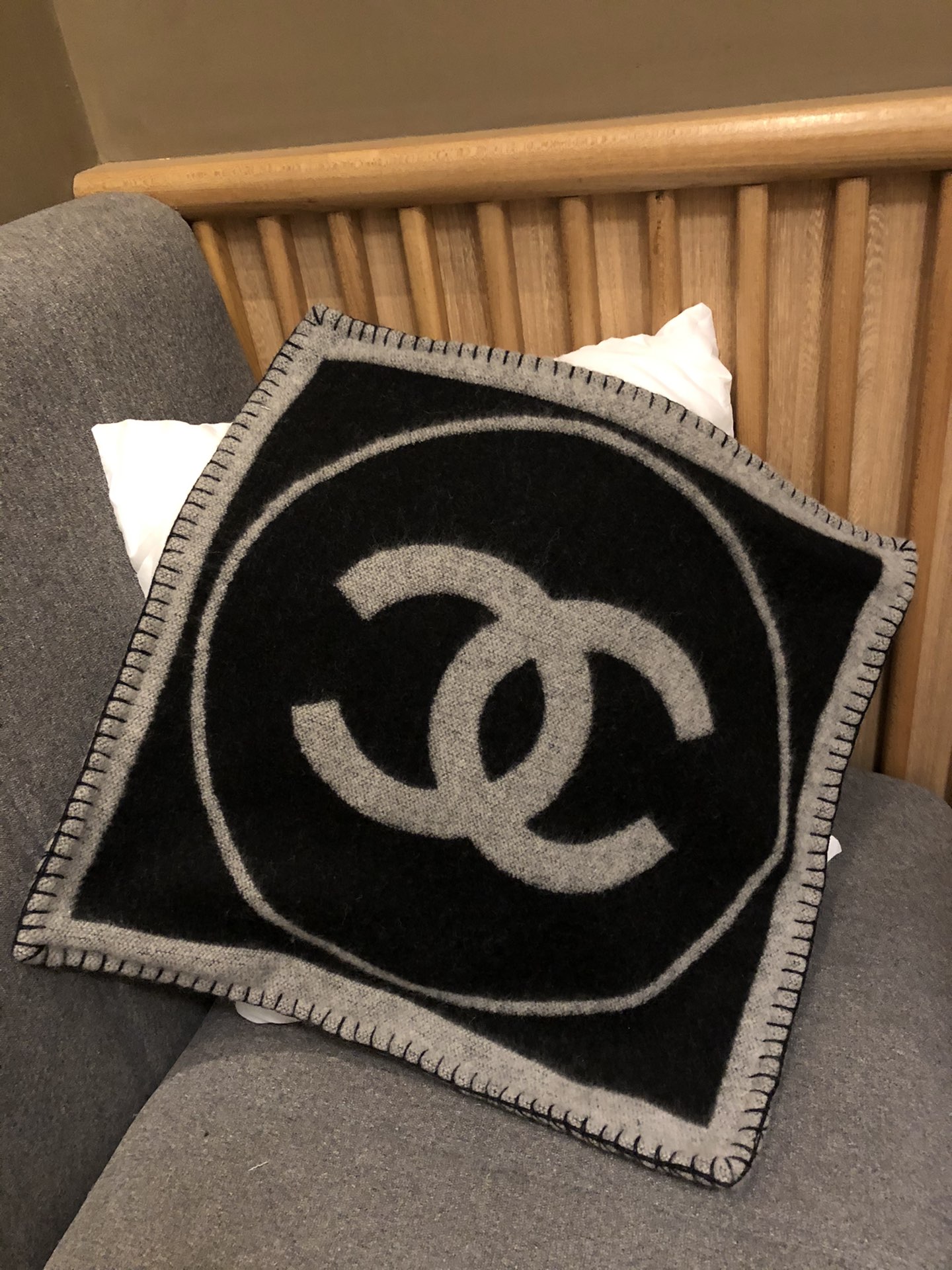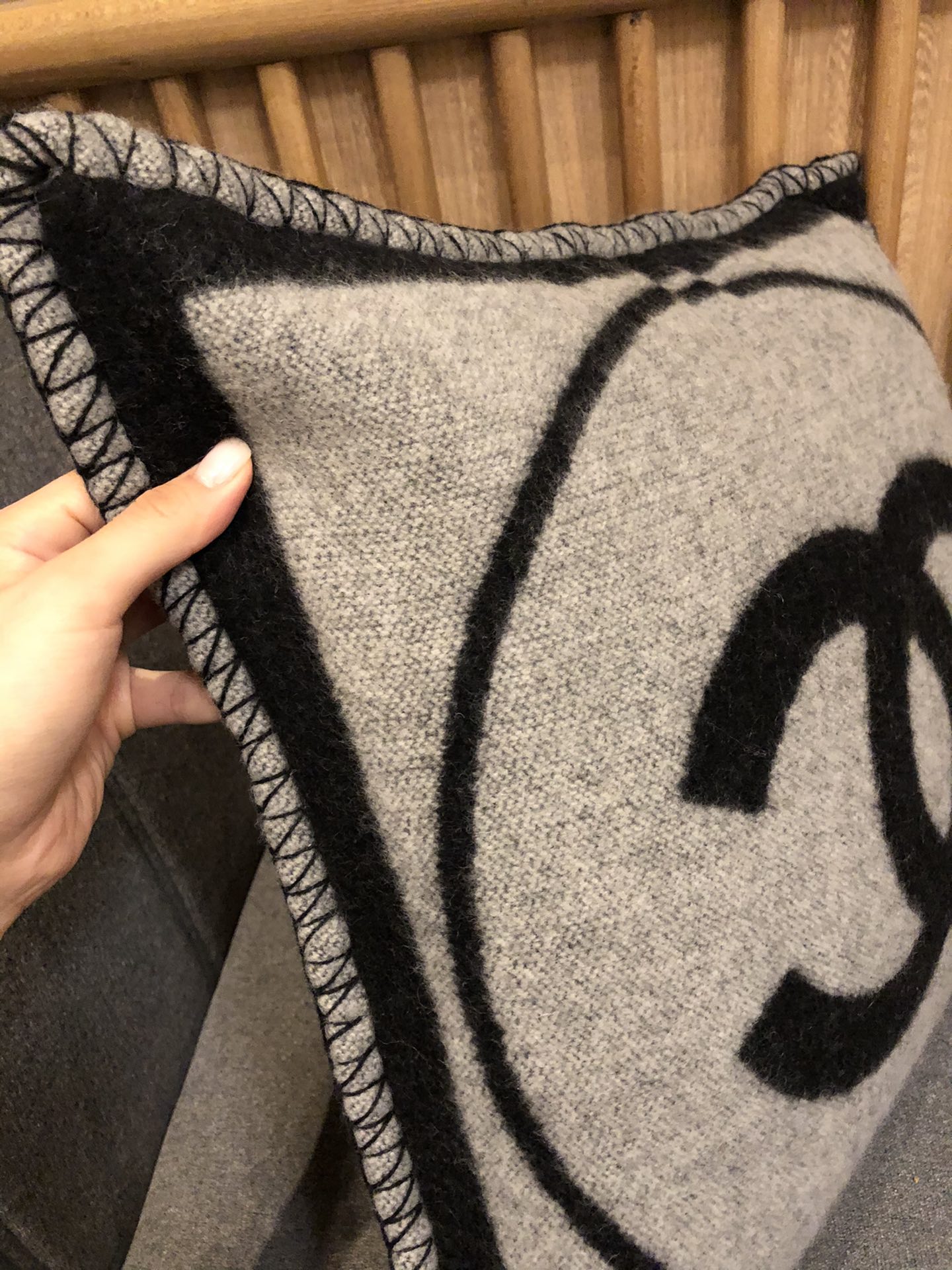 Elevate your home decor with this luxurious Chanel throw pillow, crafted from merino wool and cashmere. Features double-sided design and hand-stitched details.