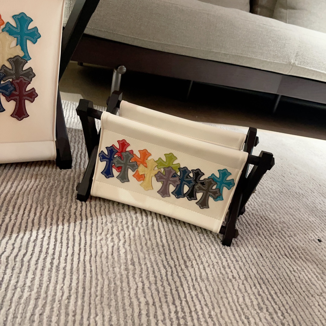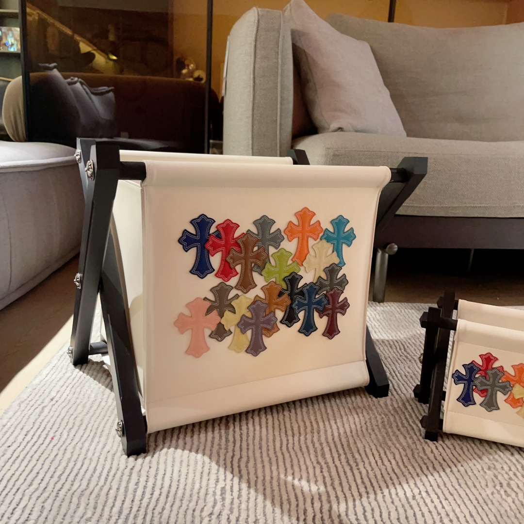 This Chrome Hearts wooden folding storage rack basket combines fashion and functionality, featuring the brand's iconic cross design and black & multi-color cross leather embroidery.