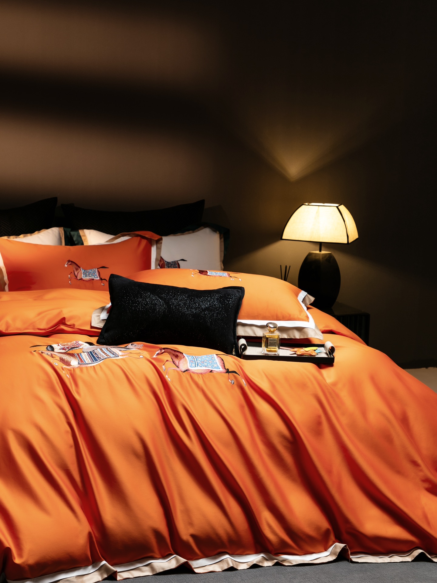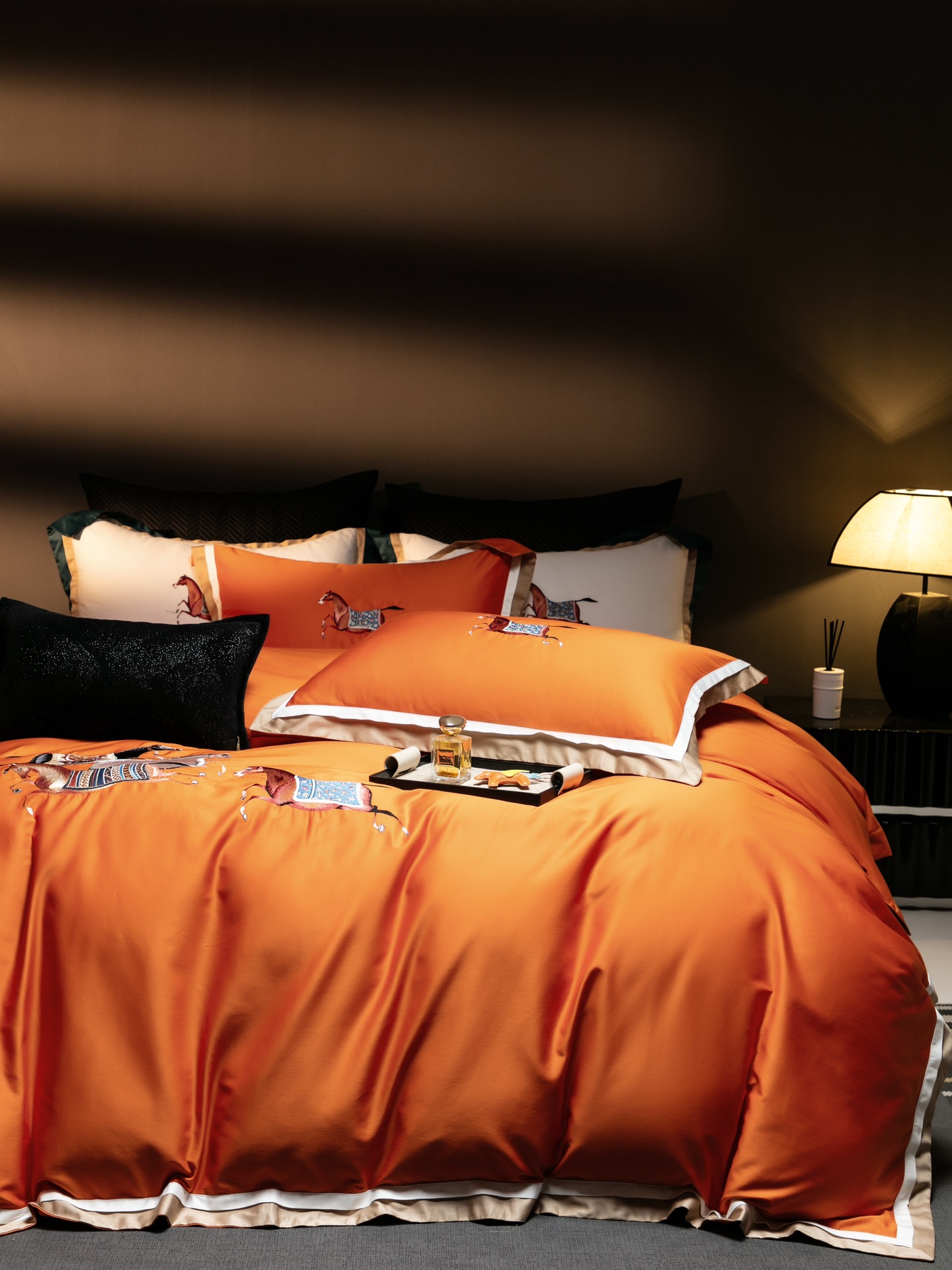 Indulge in the luxury of our 100s cotton sateen bedding set featuring intricate horse embroidery. Includes a duvet cover, flat sheet, and pillowcases.