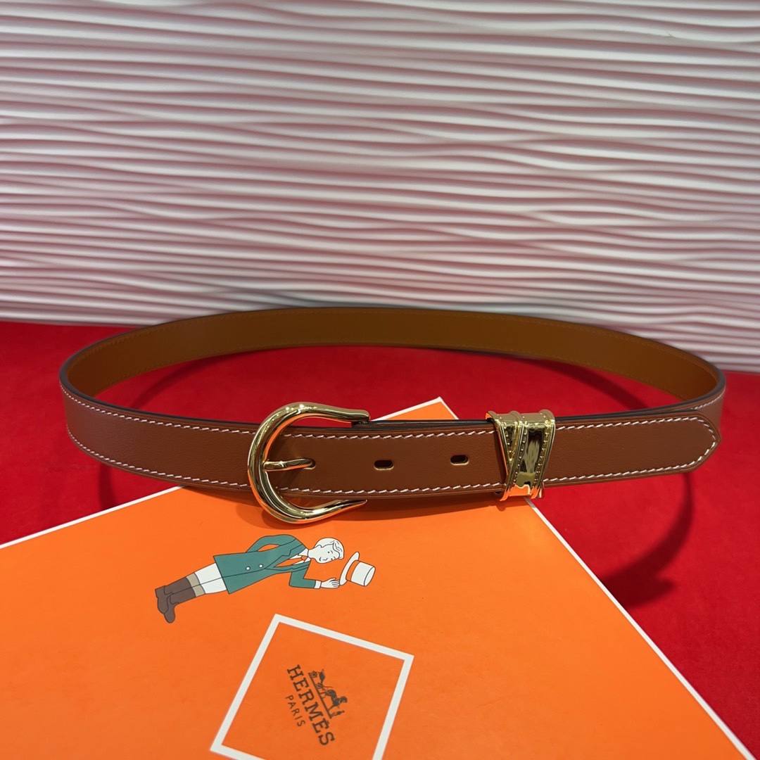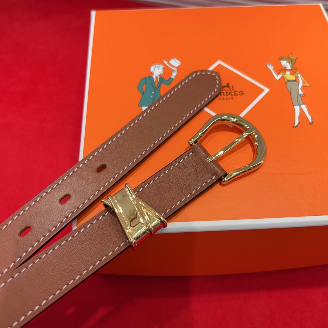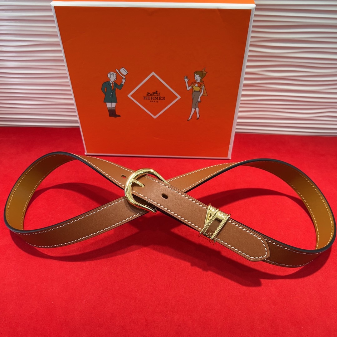 Hermès Inspired Brown Leather Belt with Gold Buckle, 2.4cm Width