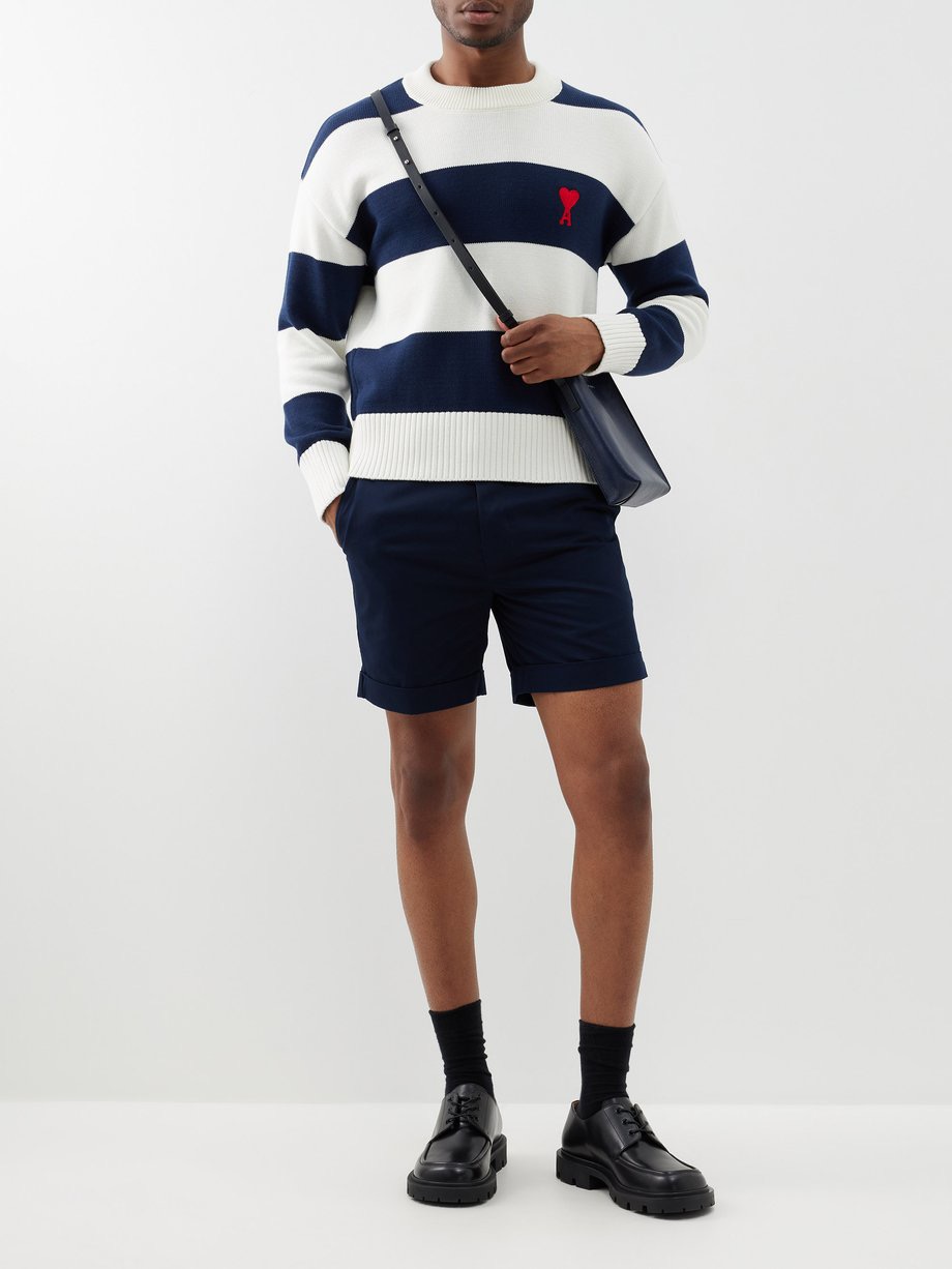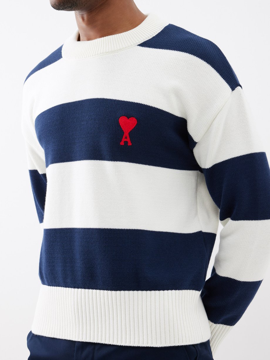 Stay cozy in this AMI Paris striped wool sweater. Features the signature Ami de Coeur logo, a relaxed fit, and is perfect for any wardrobe.