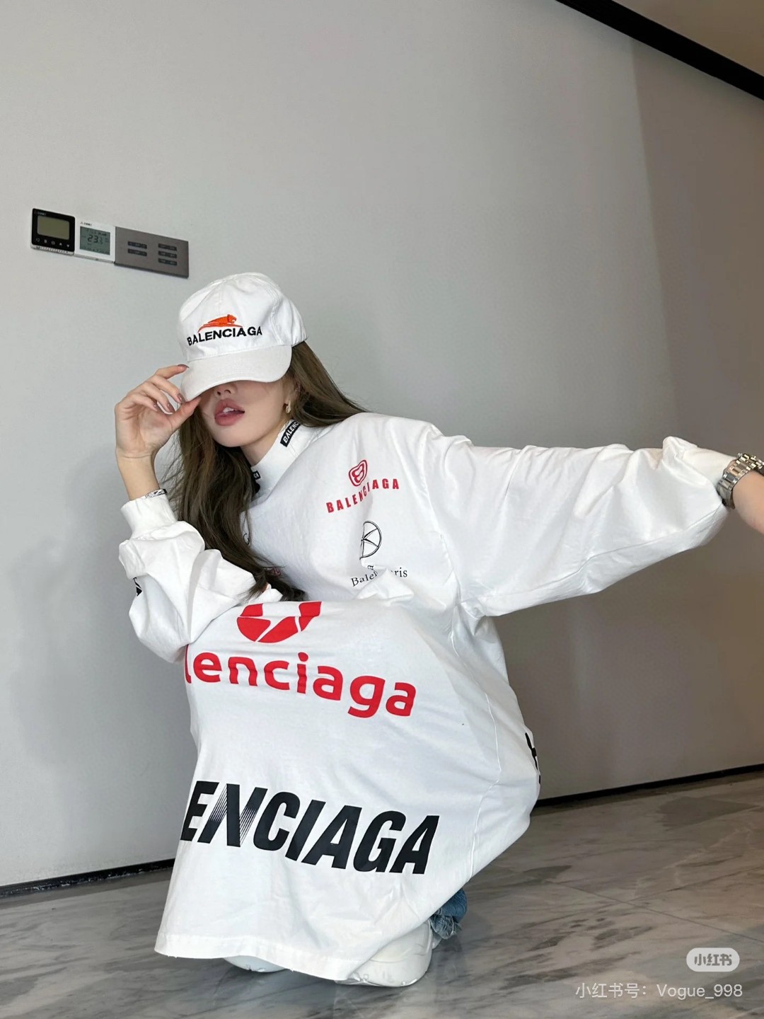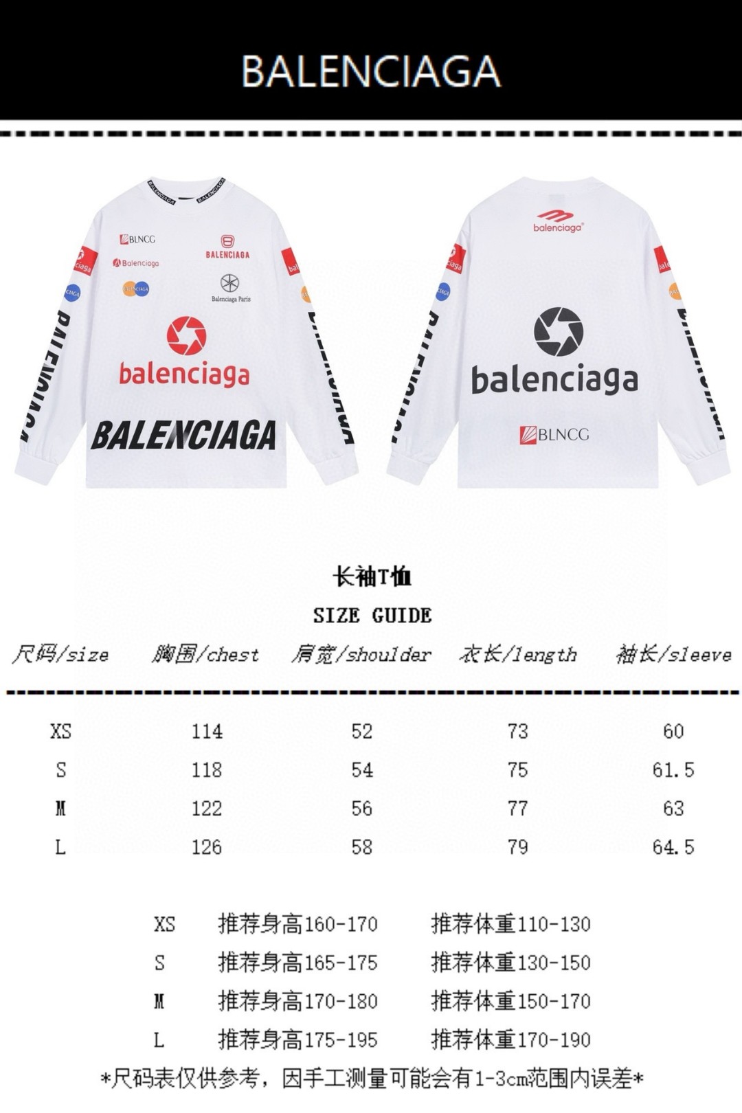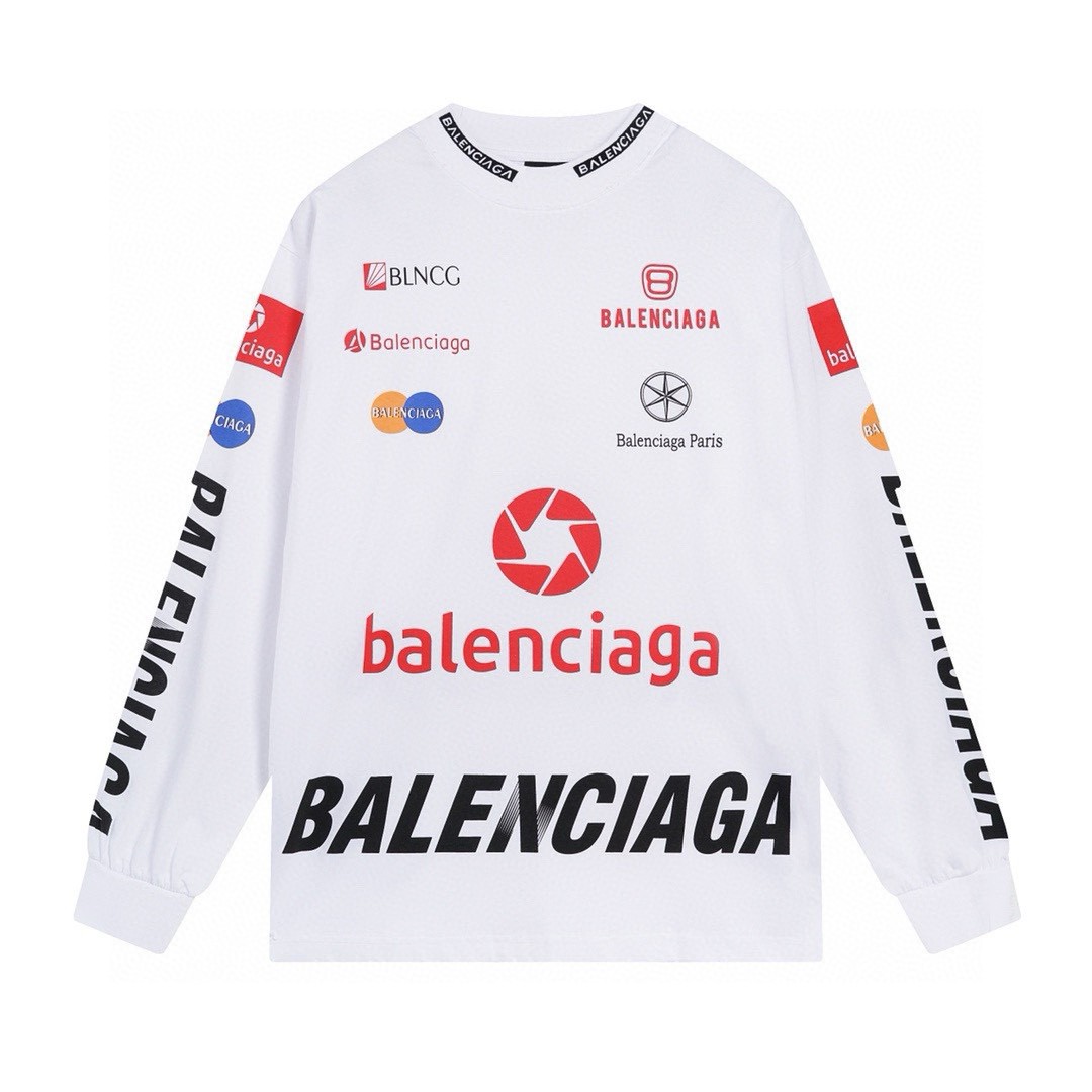 This Balenciaga long-sleeve T-shirt, part of the 2025 Spring/Summer collection, showcases the brand's iconic logo in a repeated print design. Crafted from high-quality cotton and boasting a unique distressed finish, this piece offers both style and comfort.