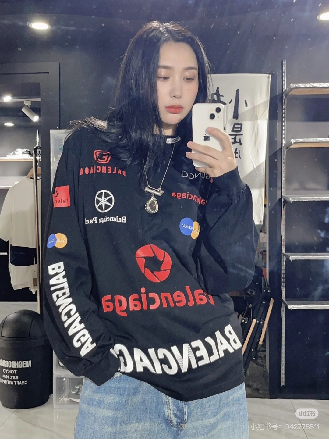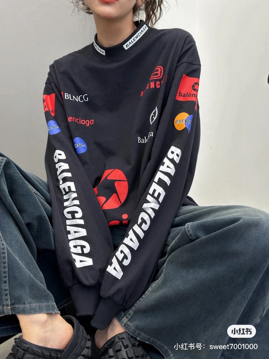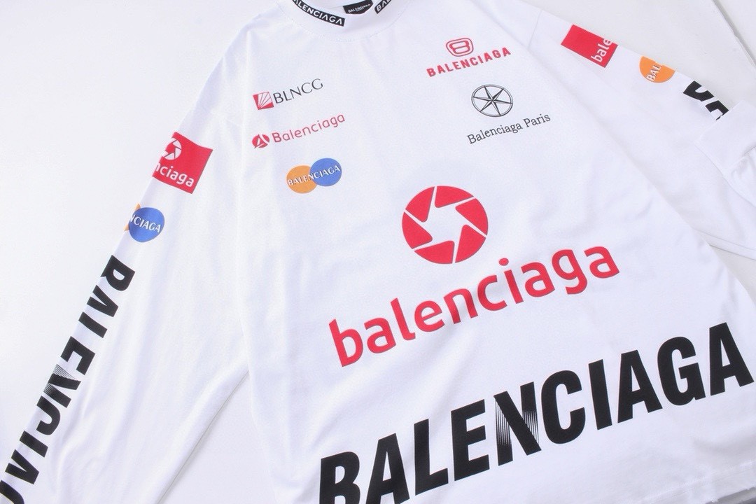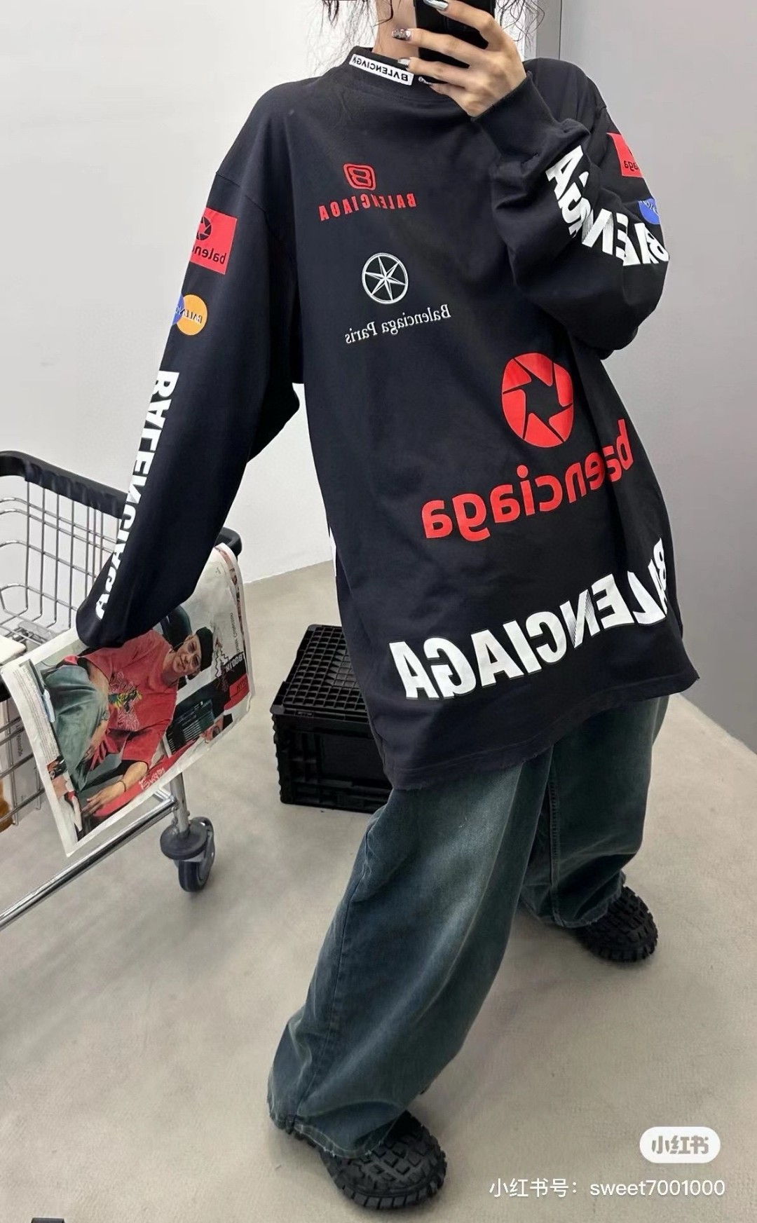 Elevate your wardrobe with this Balenciaga long sleeve tee featuring multiple logos, embroidery, and a vintage-inspired distressed finish. Soft, comfy cotton.