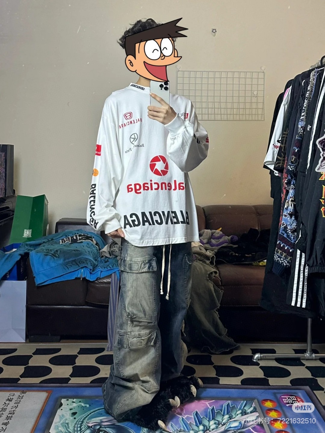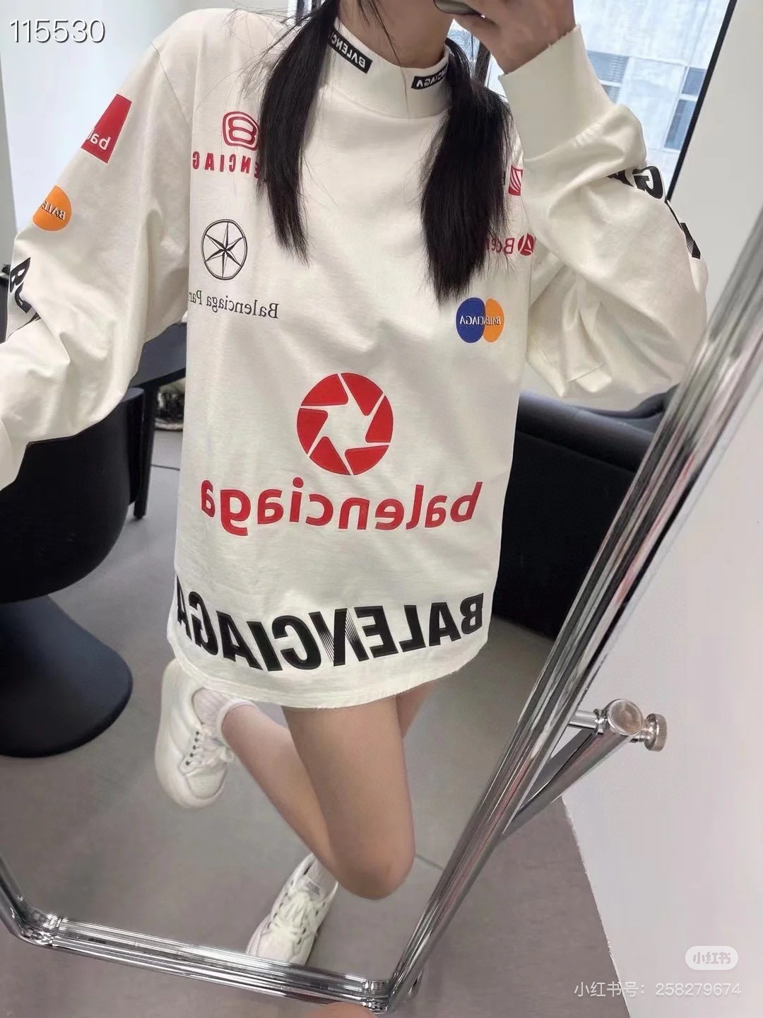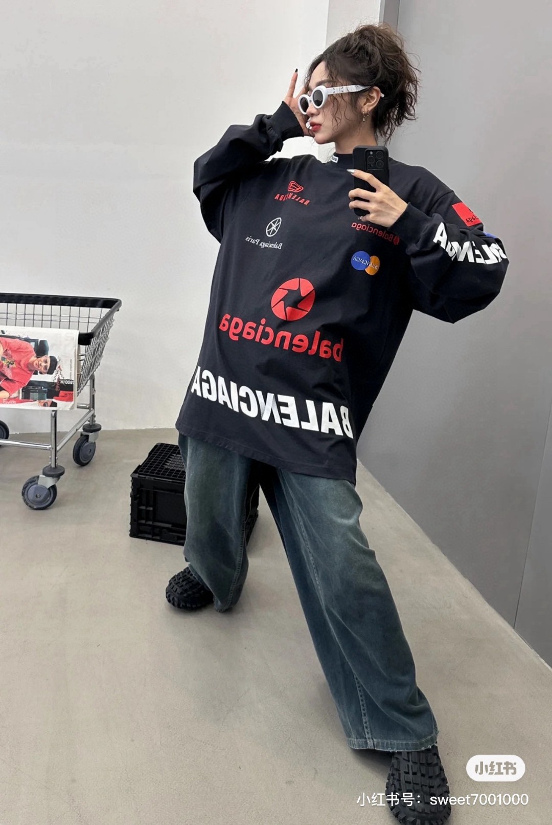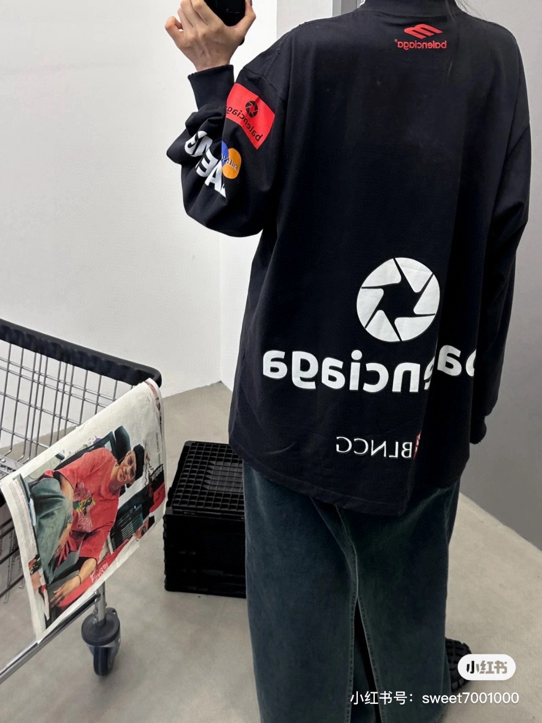 Elevate your wardrobe with this Balenciaga long sleeve tee featuring multiple logos, embroidery, and a vintage-inspired distressed finish. Soft, comfy cotton.