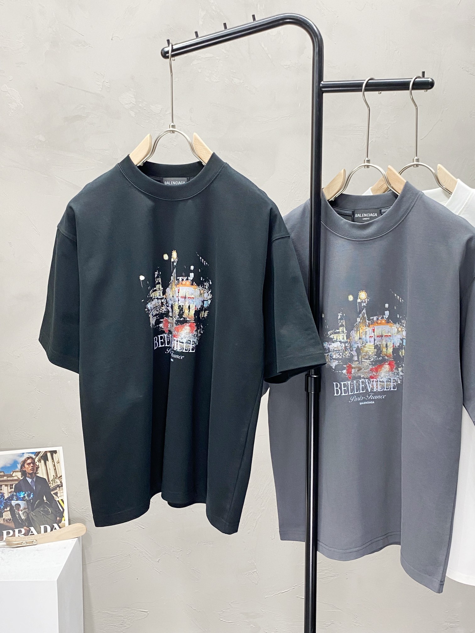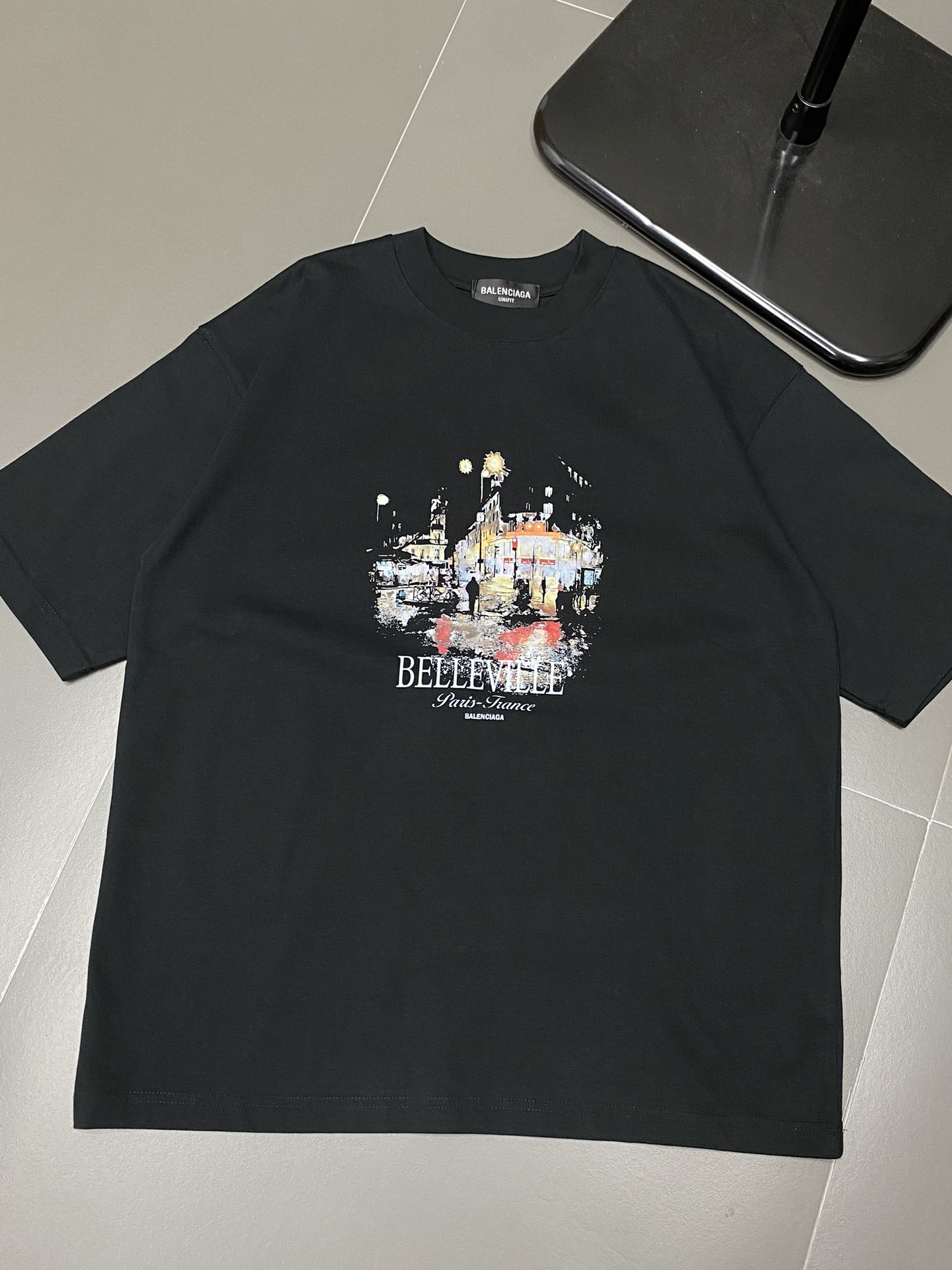 Elevate your wardrobe with this Balenciaga men's tee. Crafted from soft, imported fabric with a Belleville graphic print, it offers comfort and style.