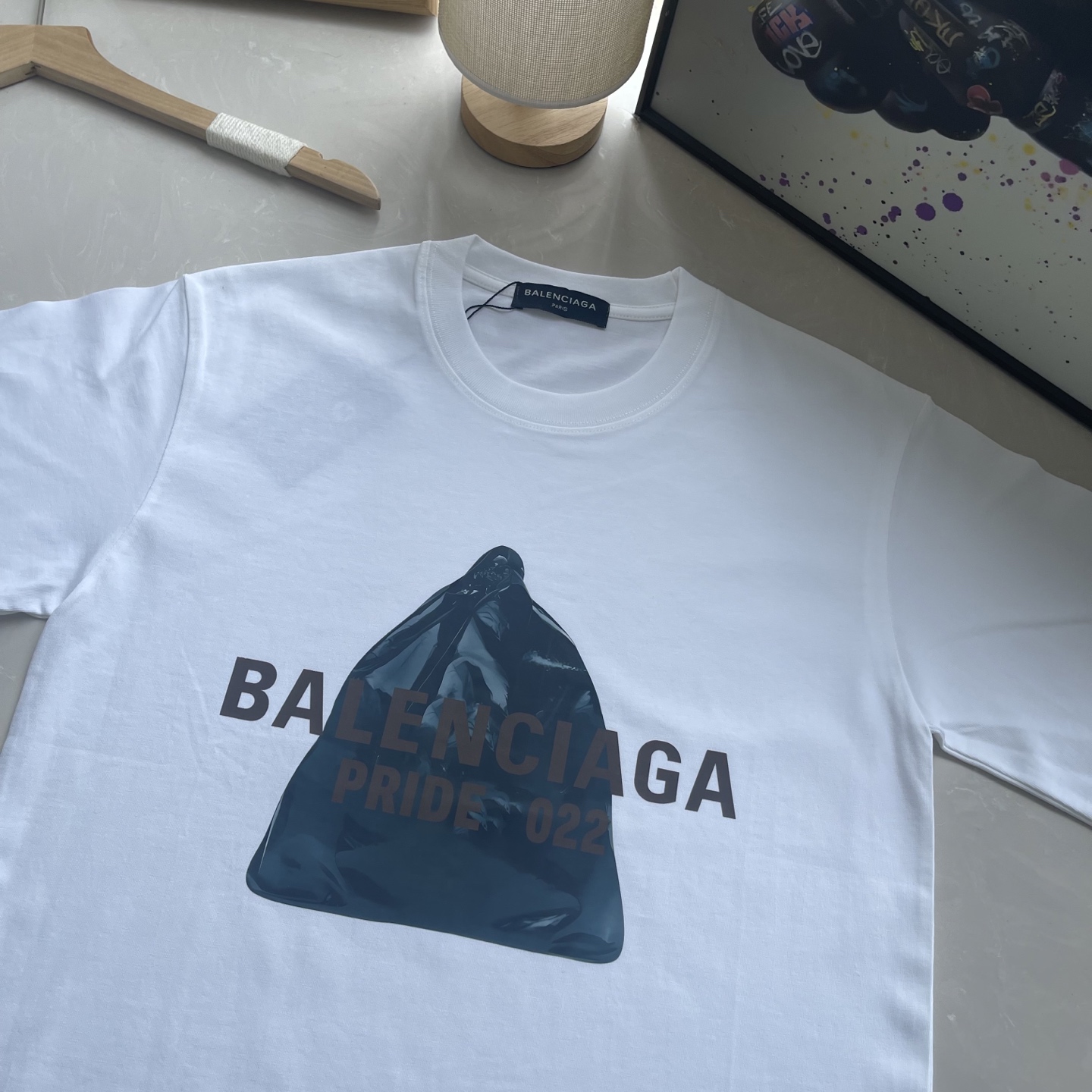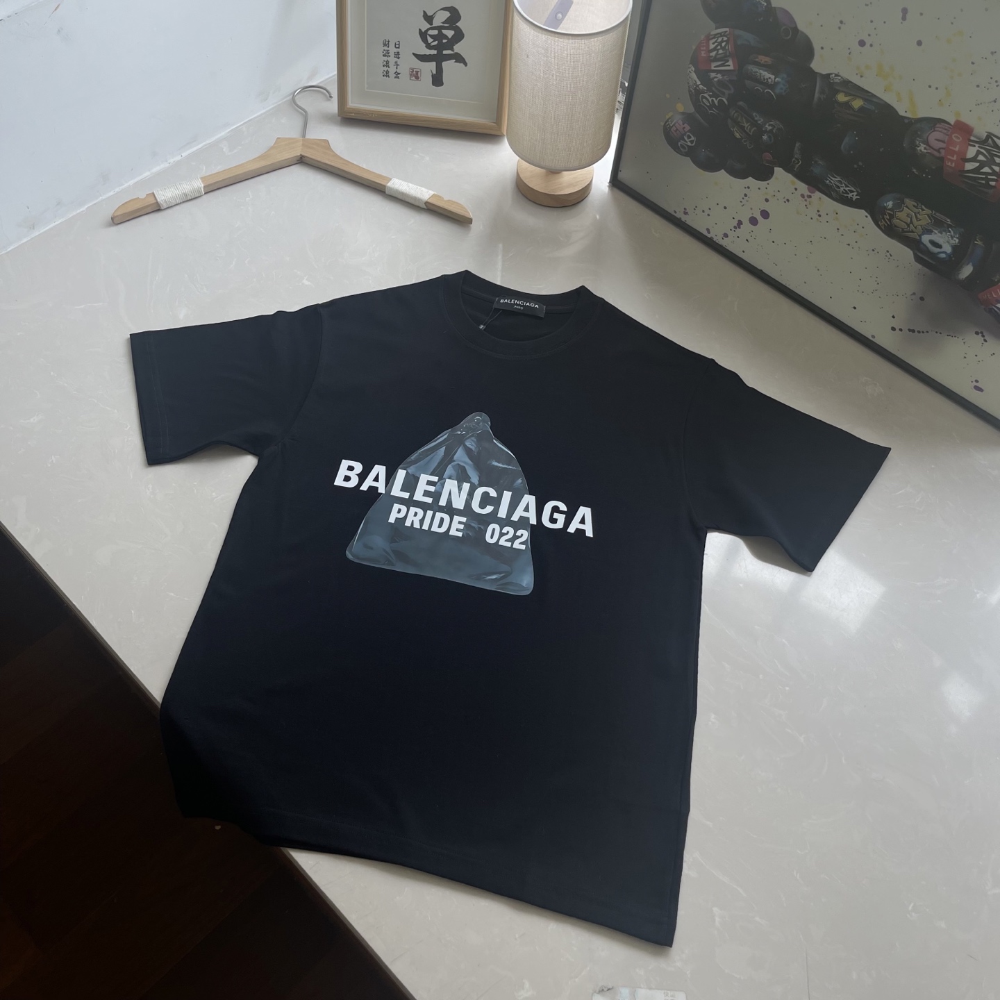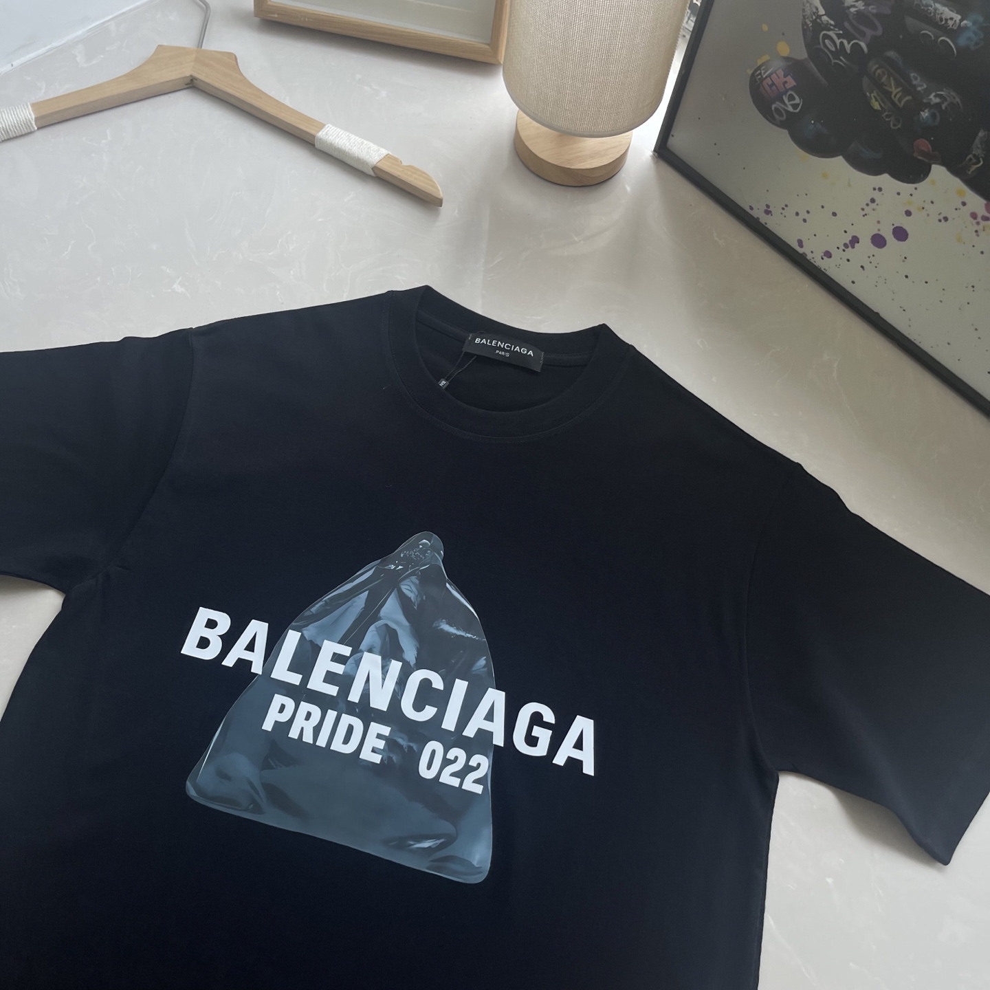 This Balenciaga short-sleeve T-shirt is a must-have for any fashion-forward individual or couple. The classic graphic print and high-quality fabric make it perfect for creating a unique street style look.