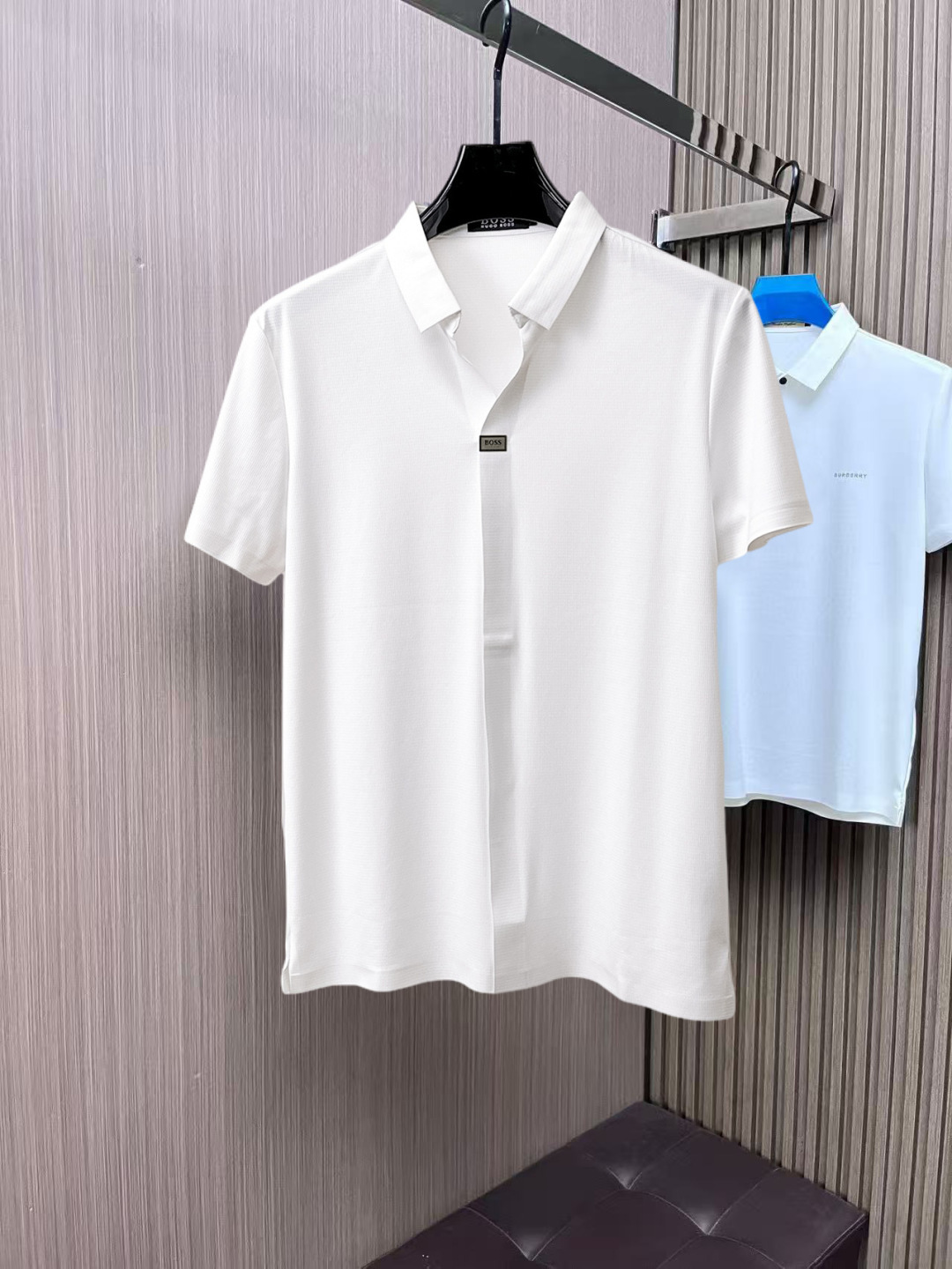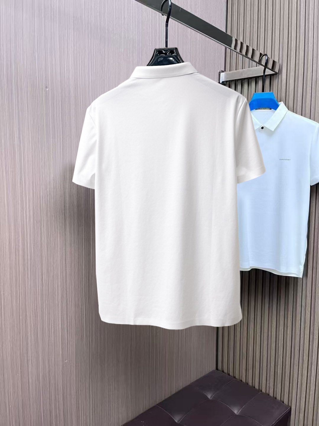 - Collar: Classic polo collar with button placket