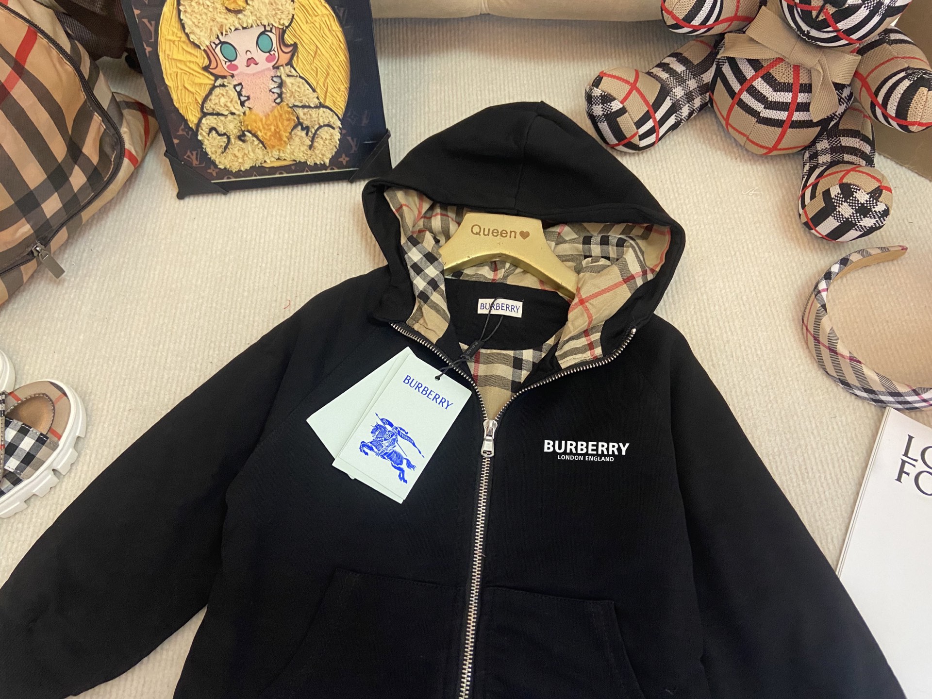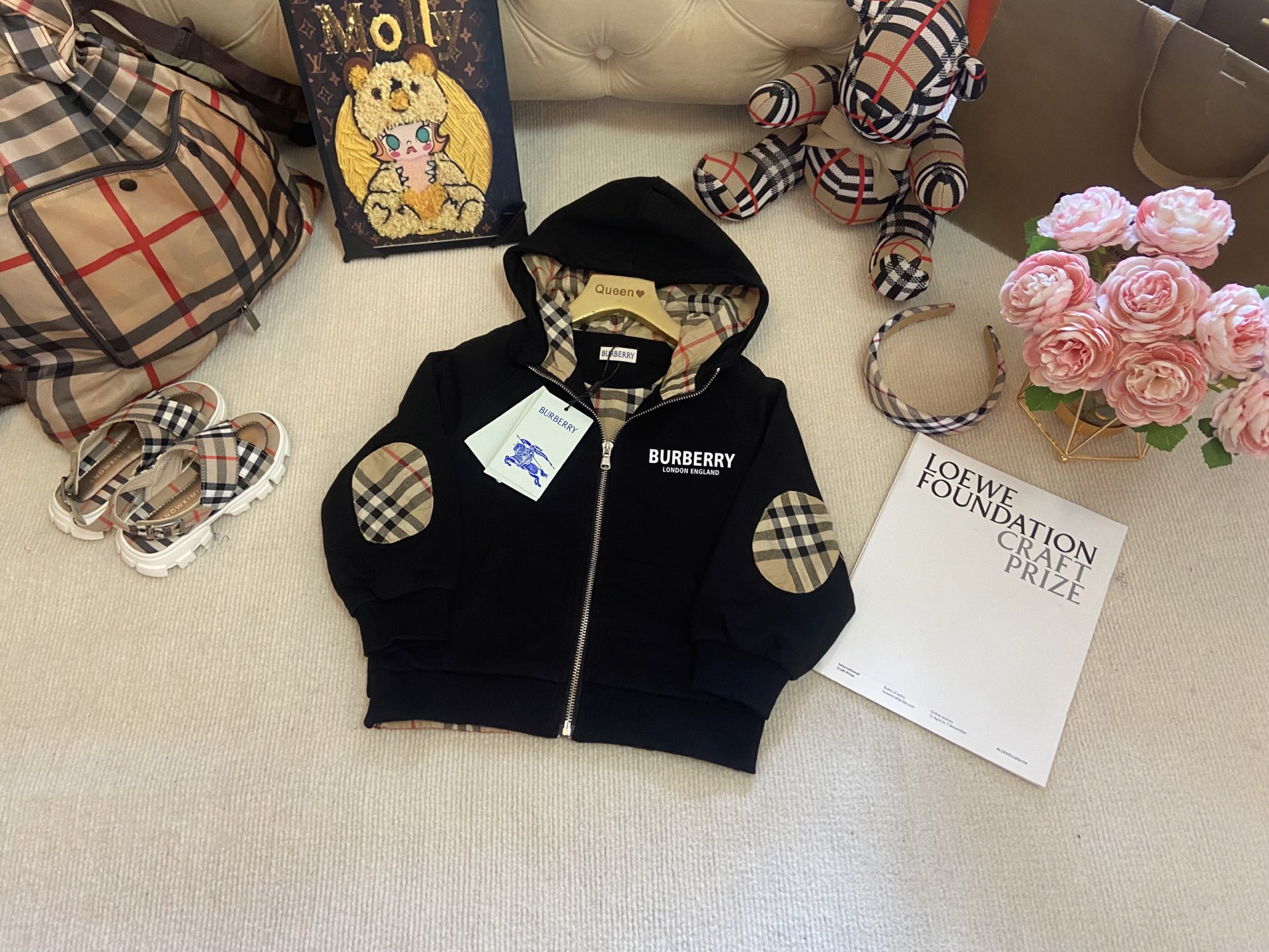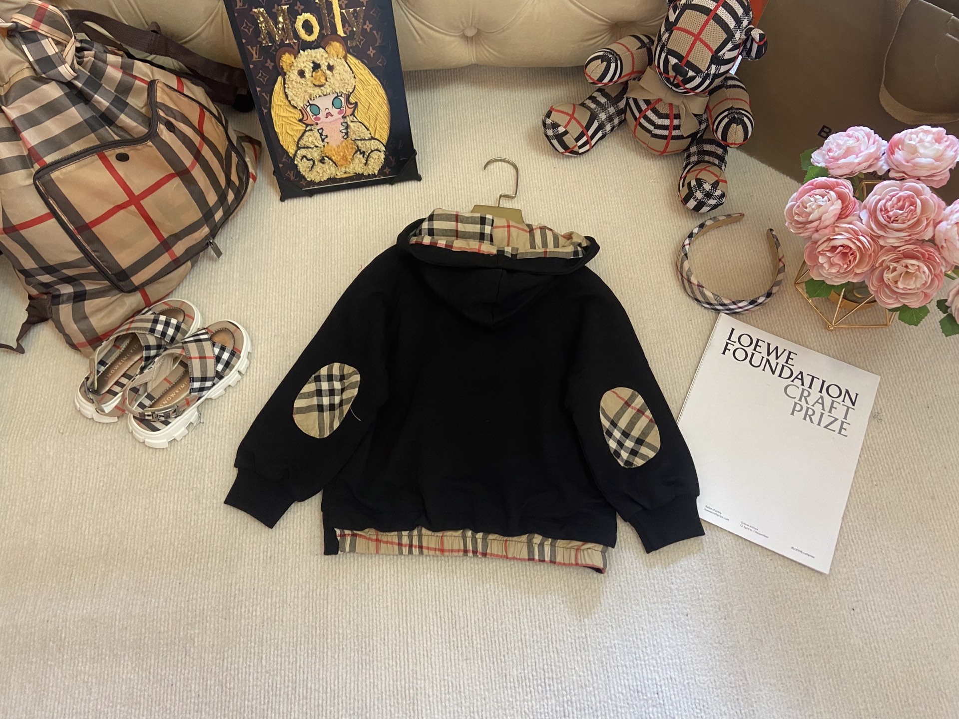 Cozy and stylish Burberry kids' black zip-up hoodie. Crafted from soft cotton, featuring the iconic check lining. Perfect for layering!