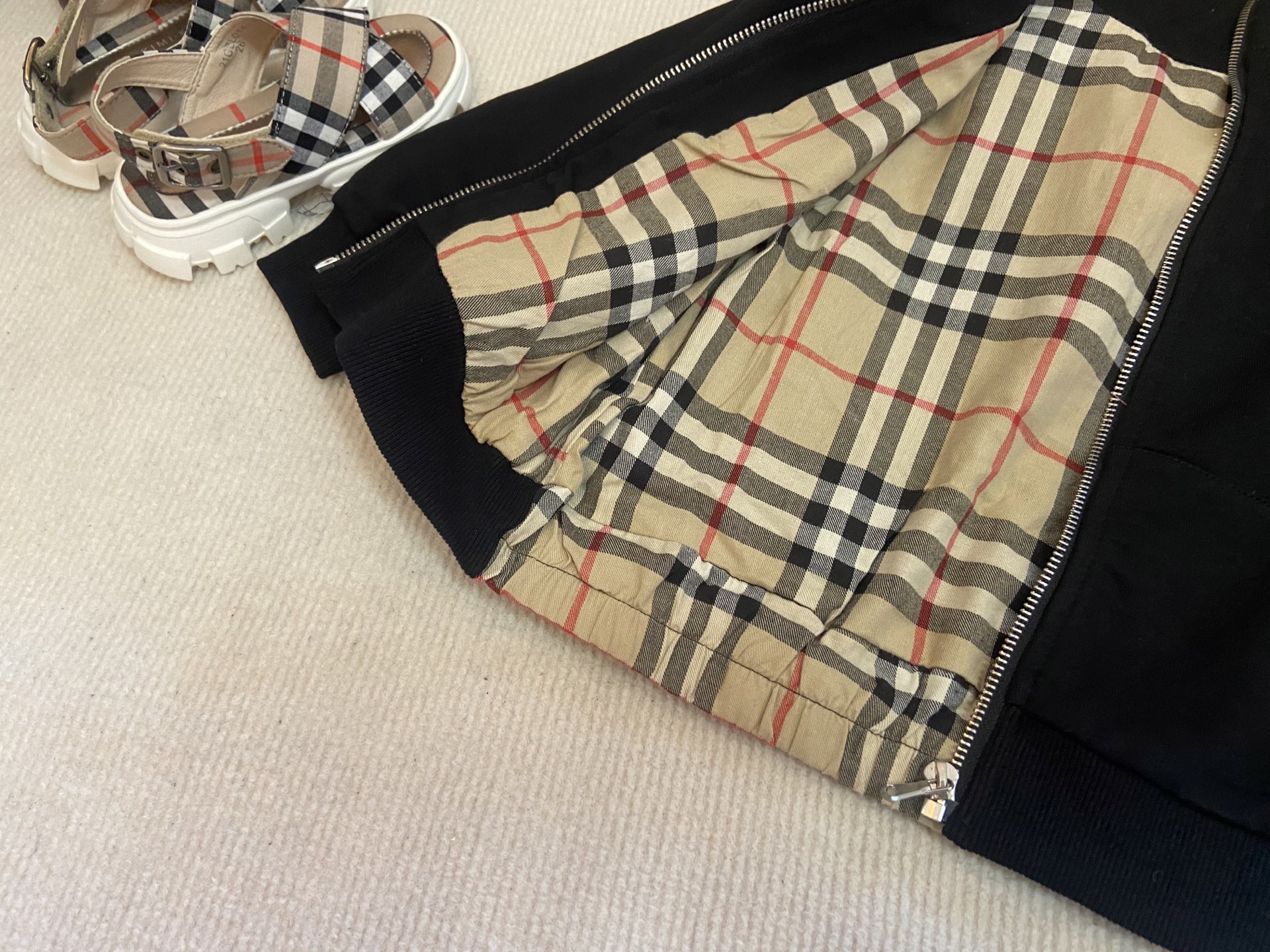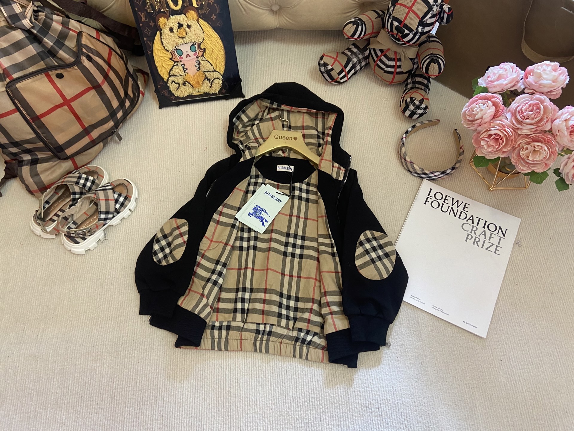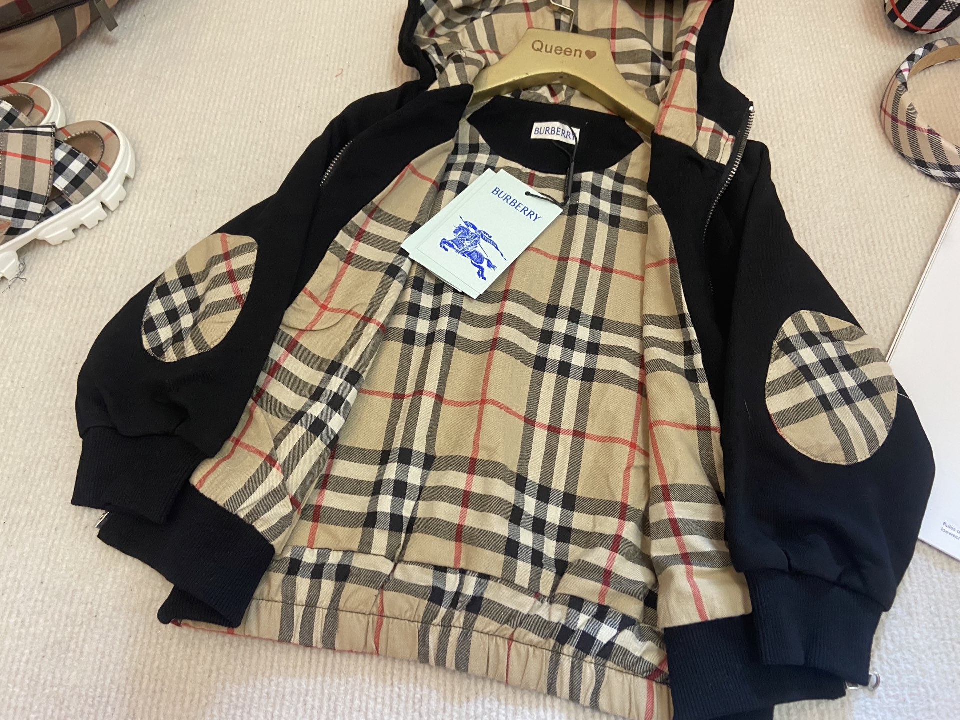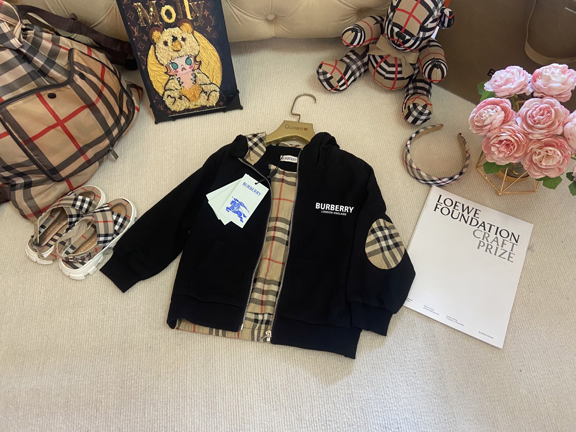 Cozy and stylish Burberry kids' black zip-up hoodie. Crafted from soft cotton, featuring the iconic check lining. Perfect for layering!