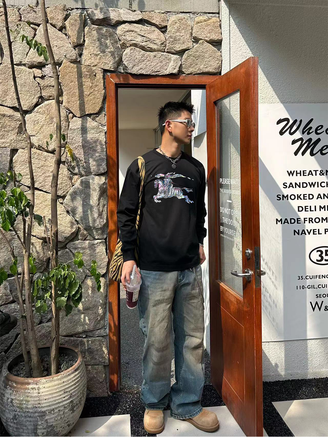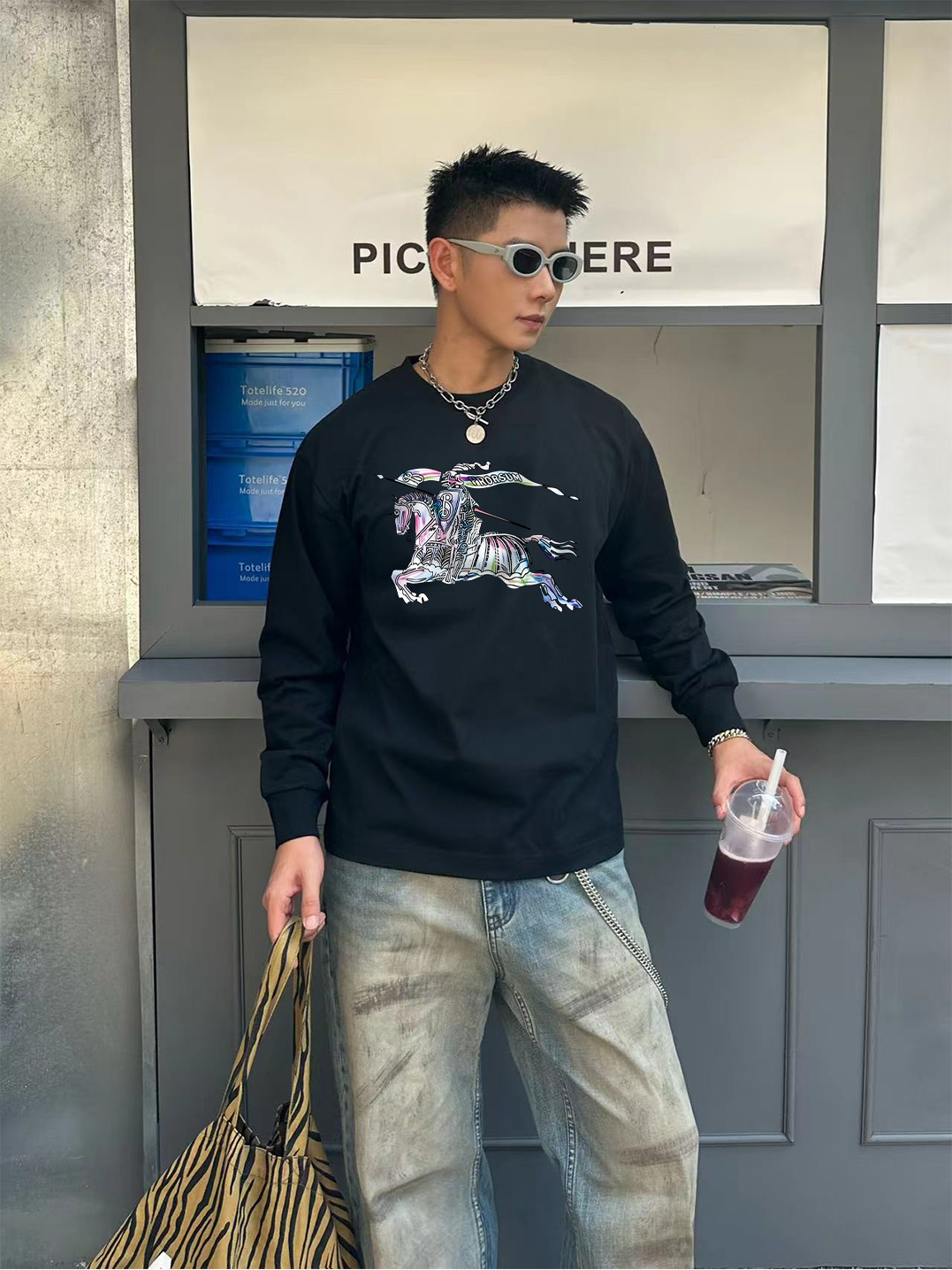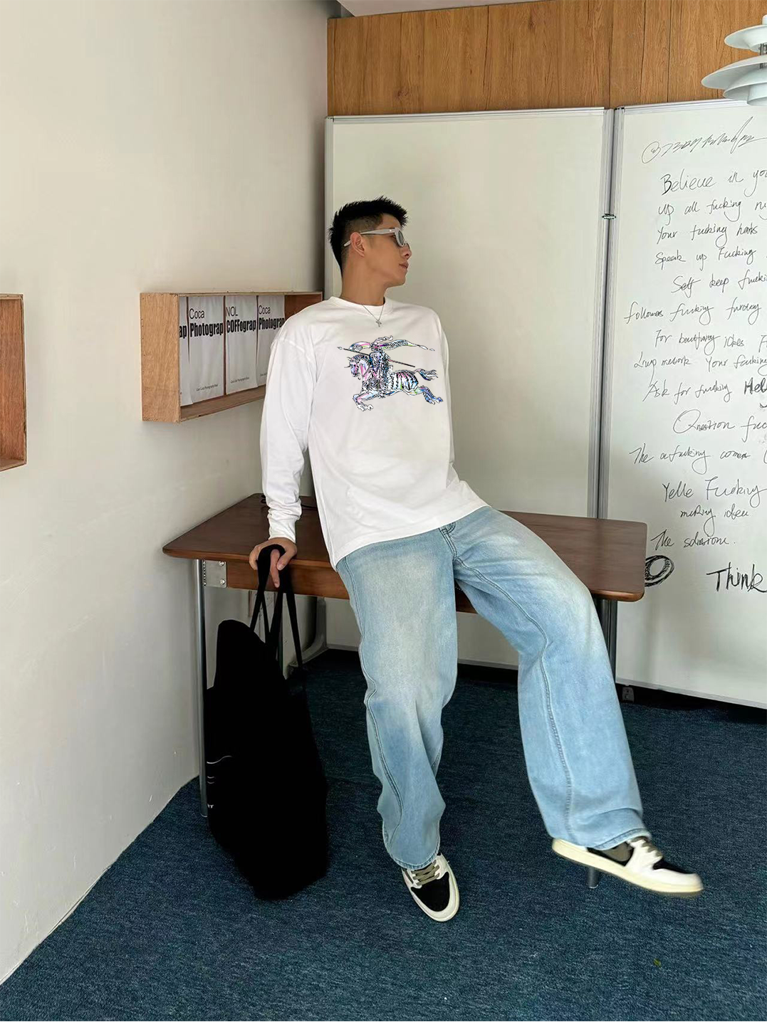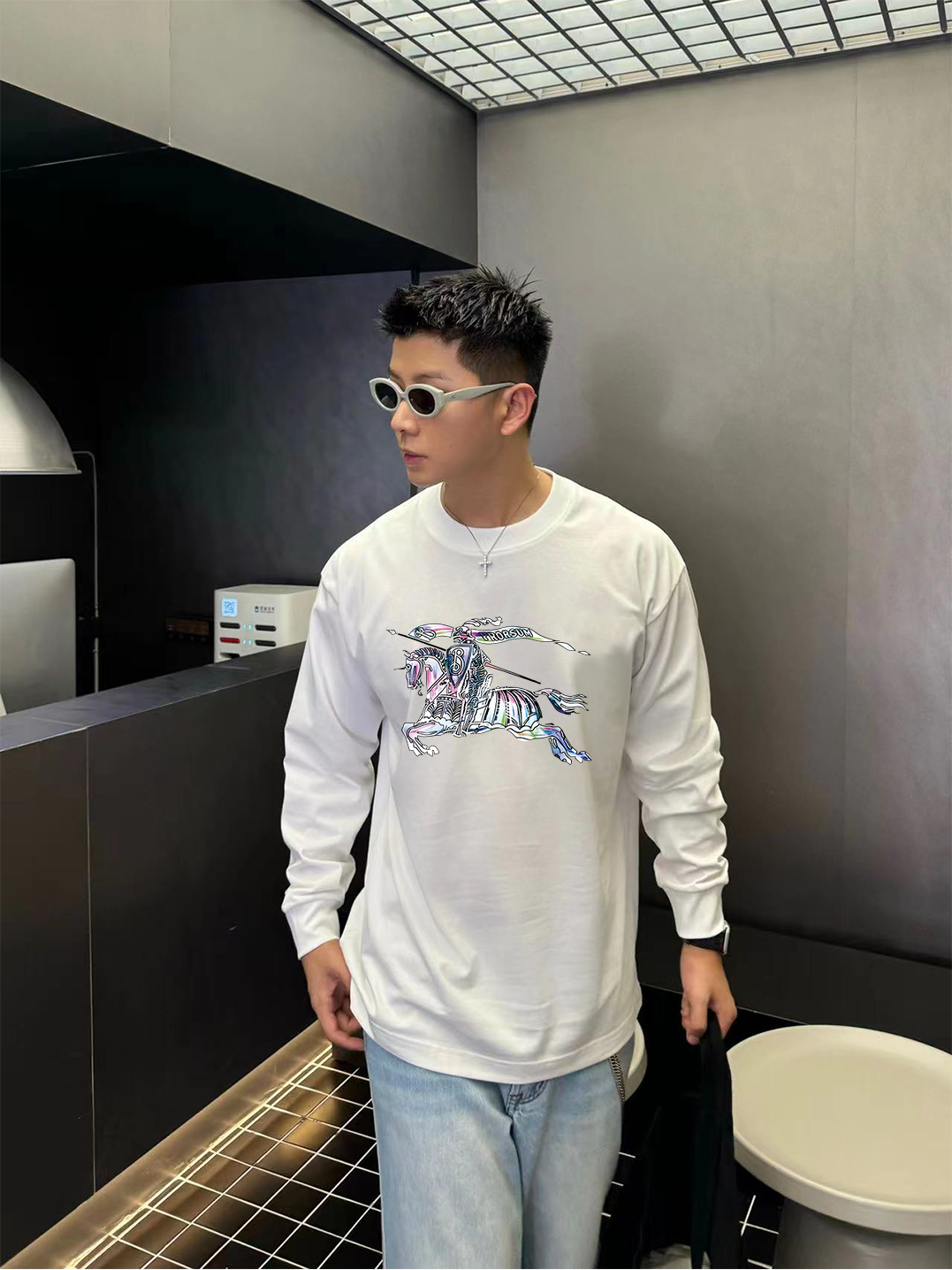 Elevate your casual style with this Burberry long-sleeve T-shirt. Featuring the iconic Equestrian Knight design, this tee offers a blend of luxury and comfort.
