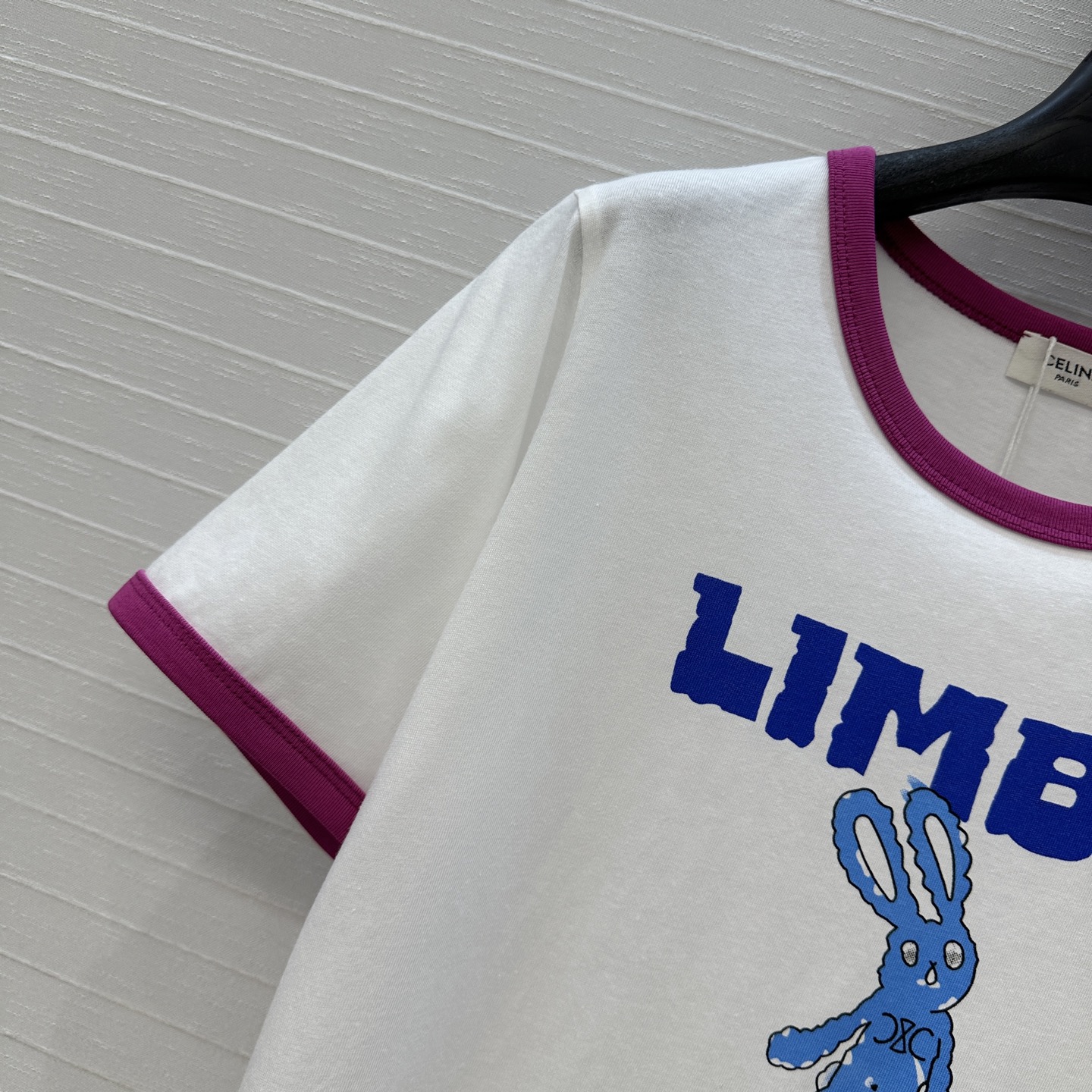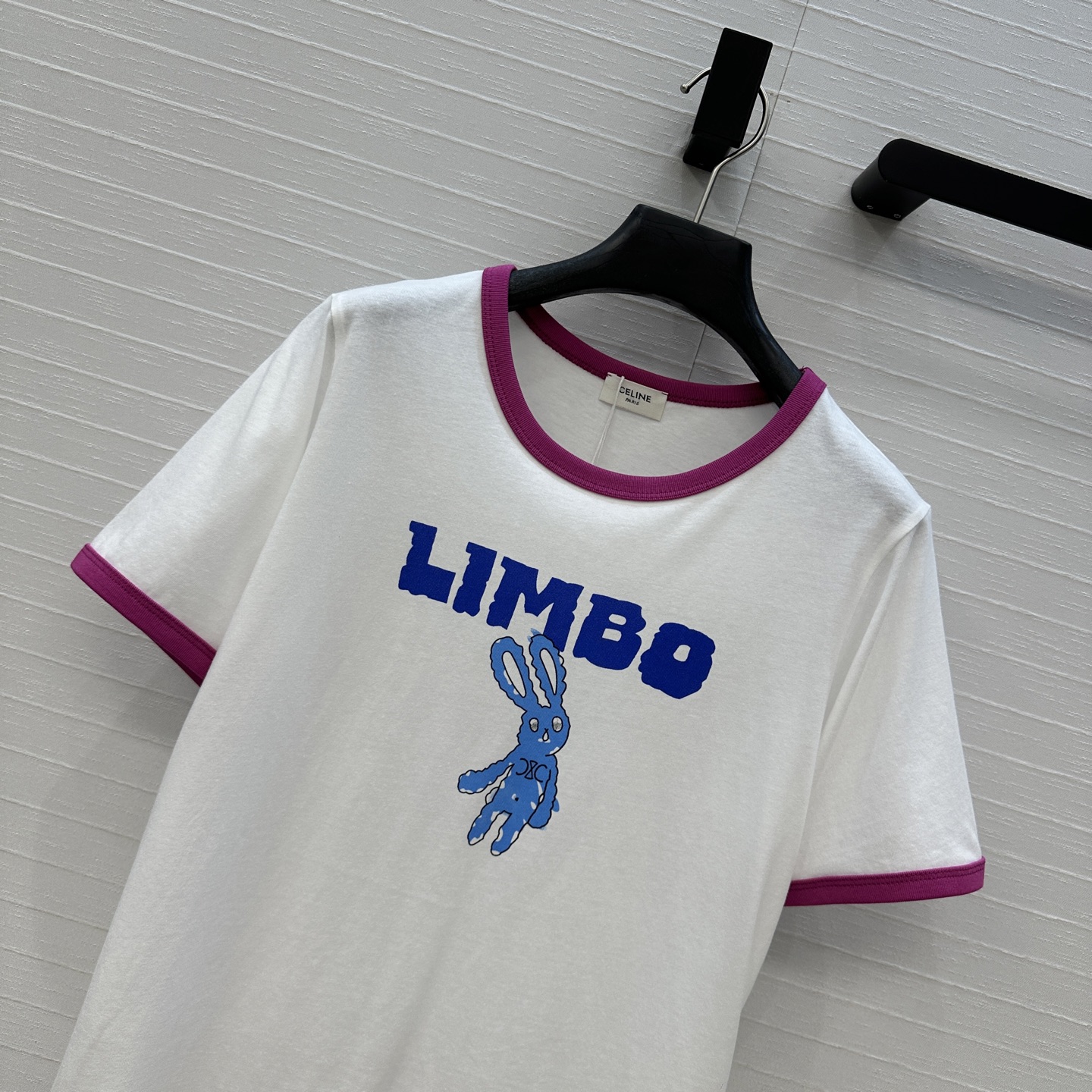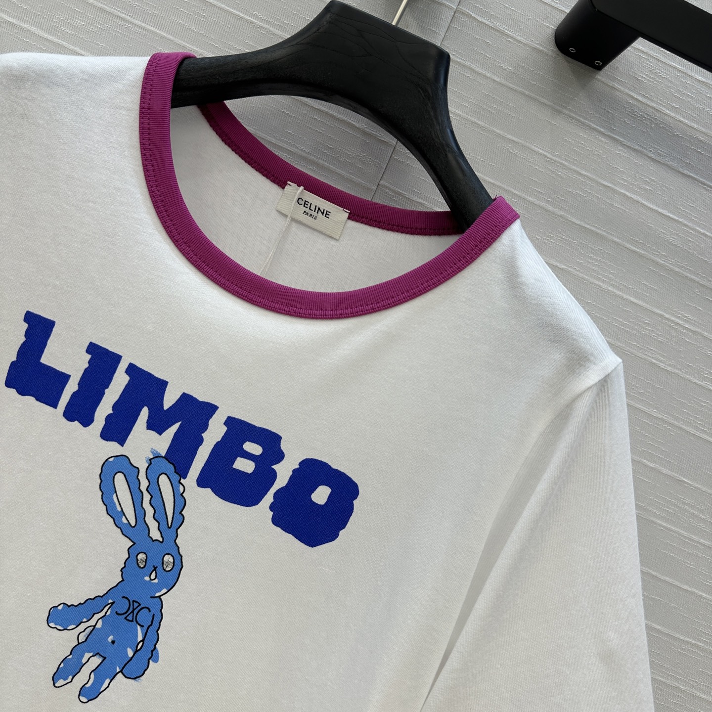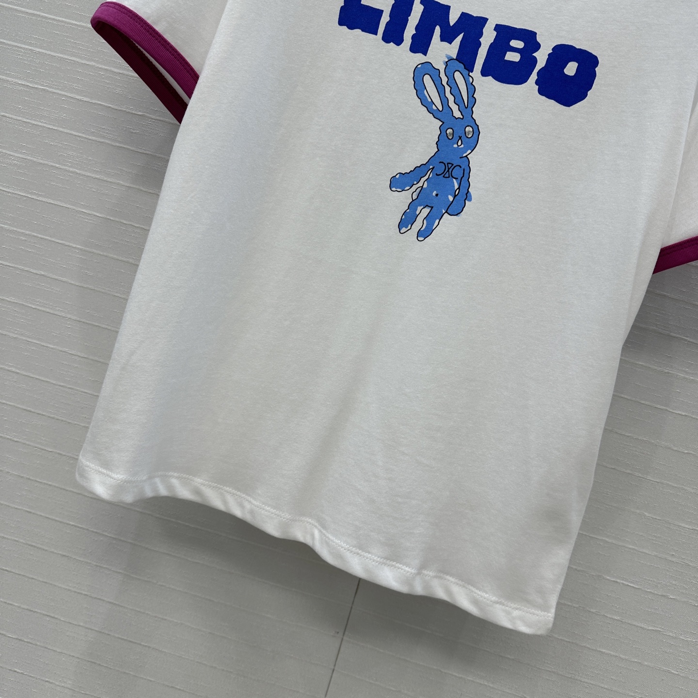 Celine White Cotton T-Shirt with Blue 'Limbo' Bunny Print and Ringer Trim
