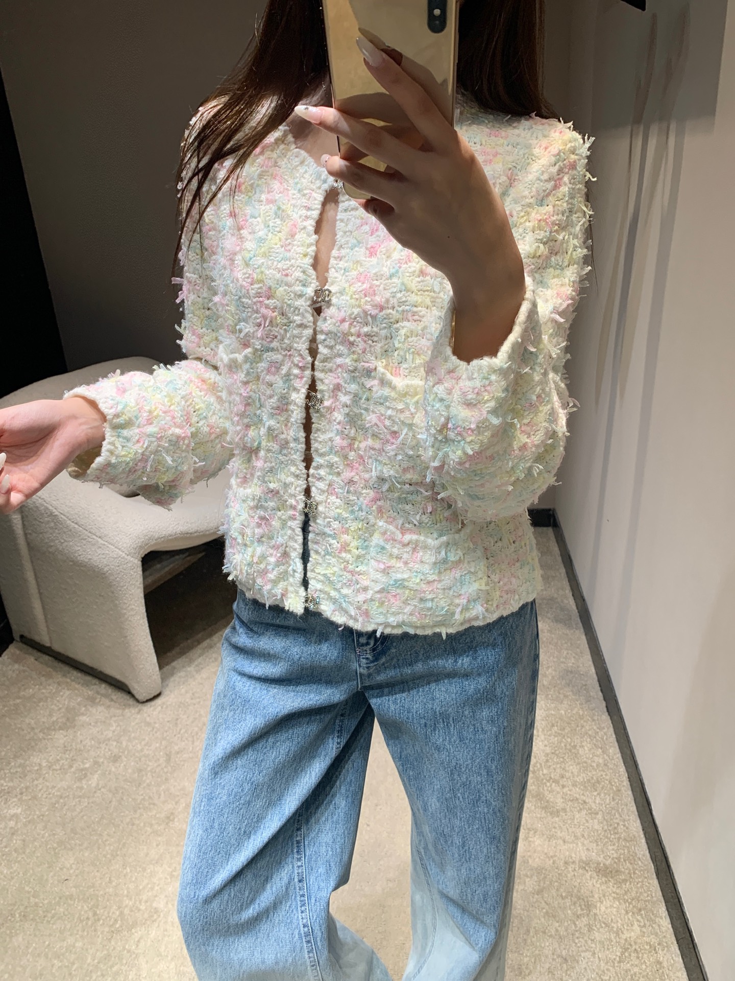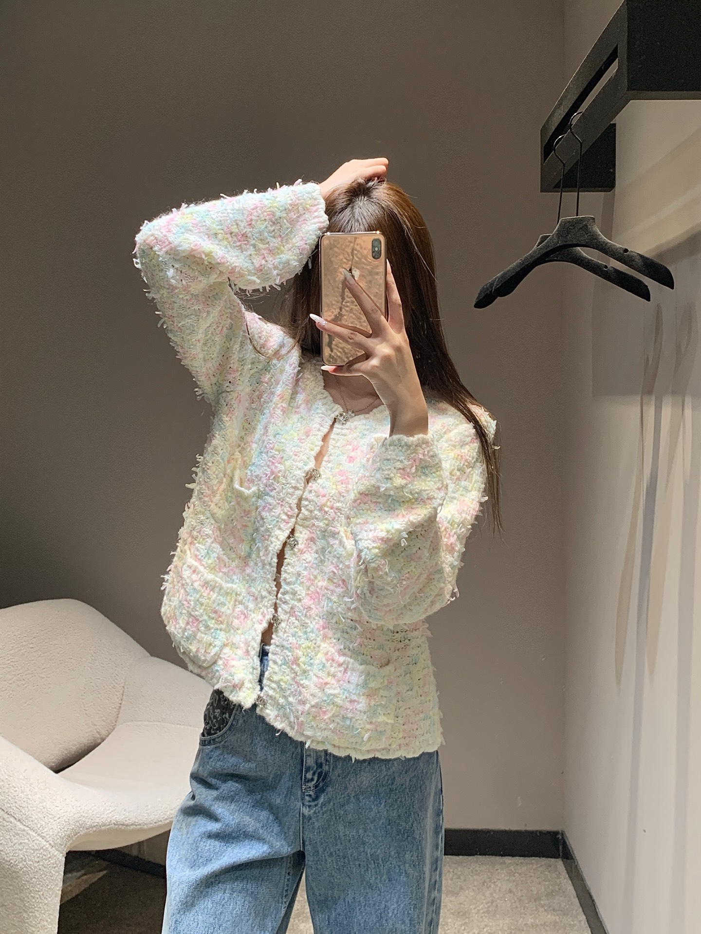 Elevate your wardrobe with this Chanel-inspired knit cardigan. Features include jewel-like metal buttons, four pockets, and a flattering short cut.
