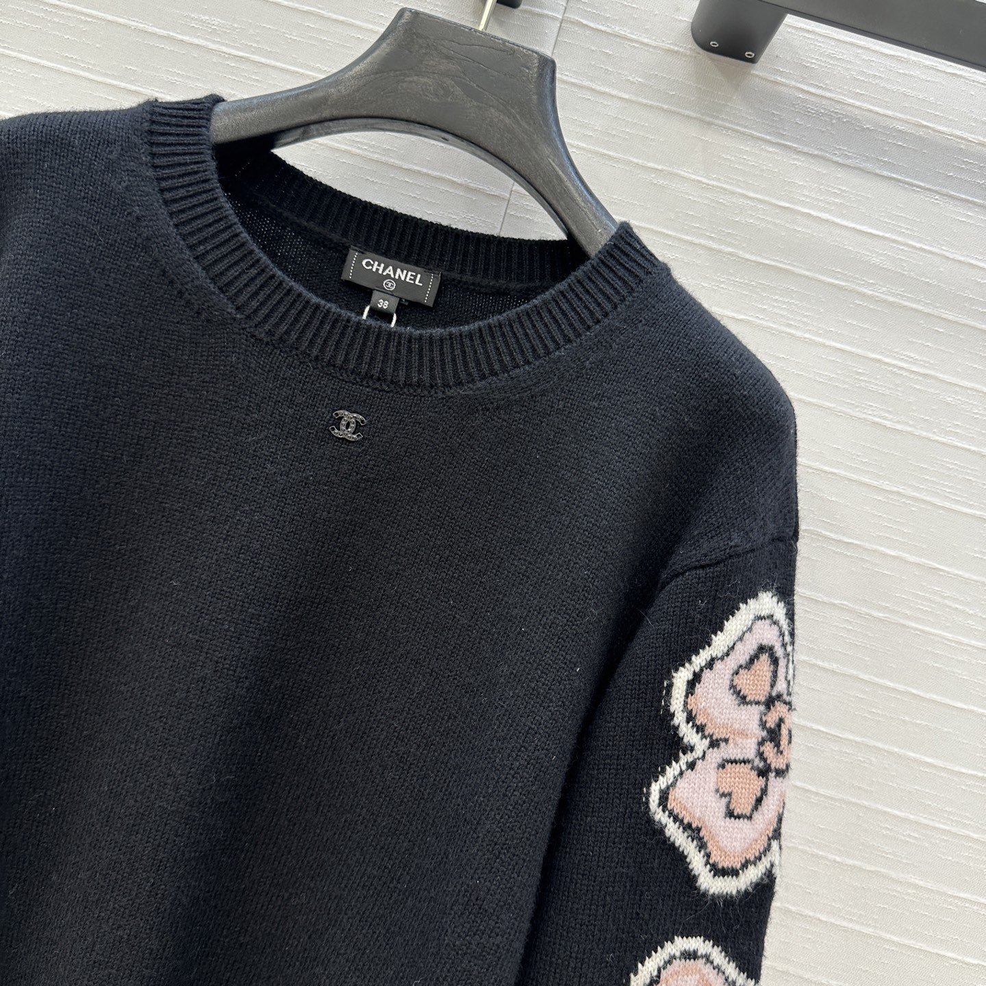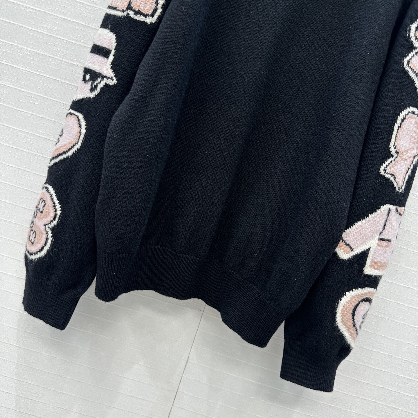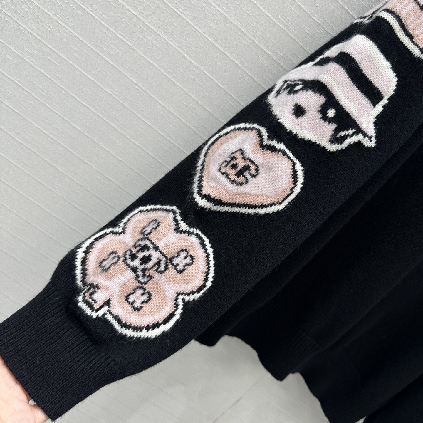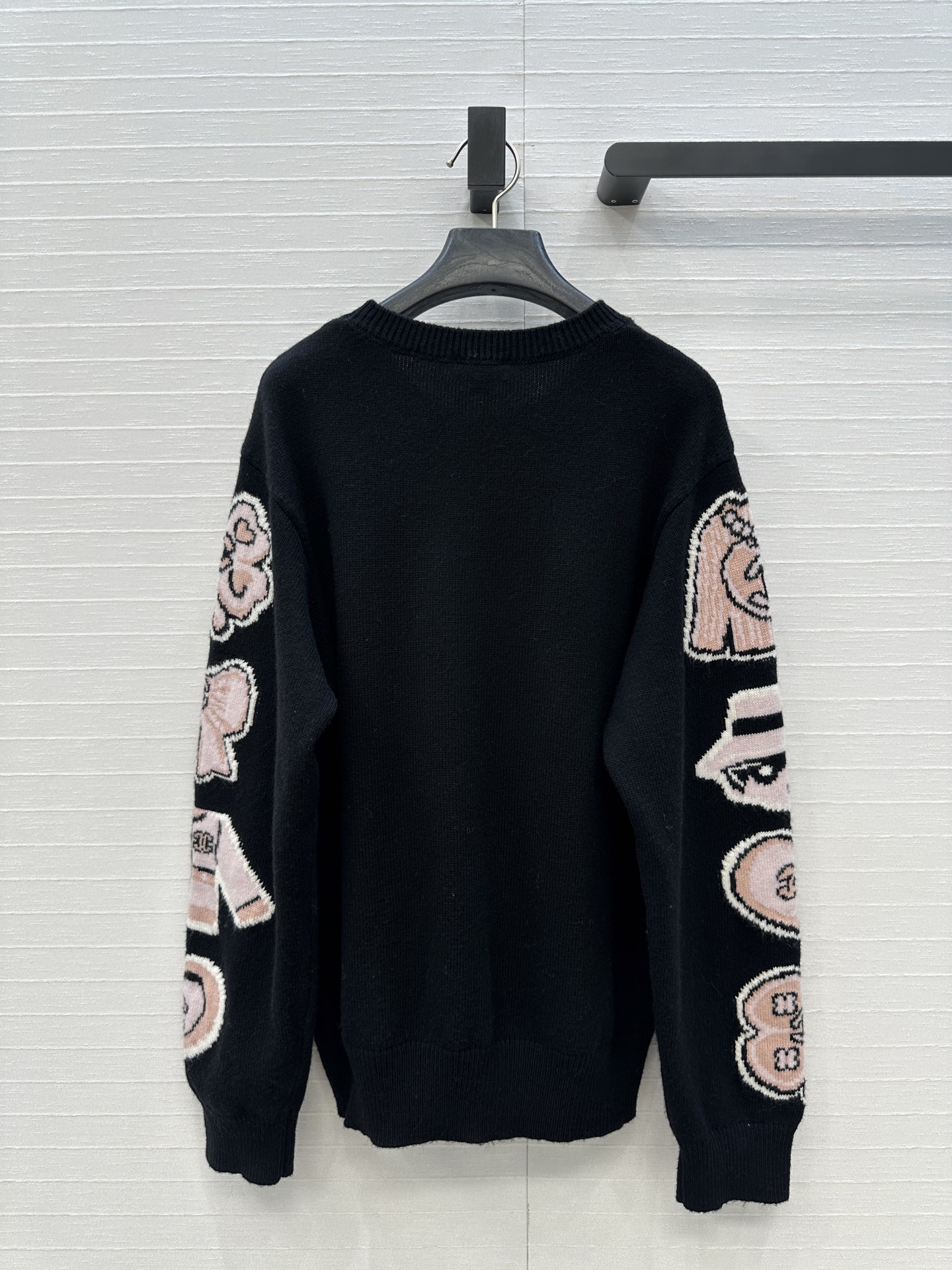 Chic Chanel black knit sweater with pink cartoon embellishments. Inspired by Jennie, this relaxed fit sweater is both cute and stylish. Perfect for any casual look.