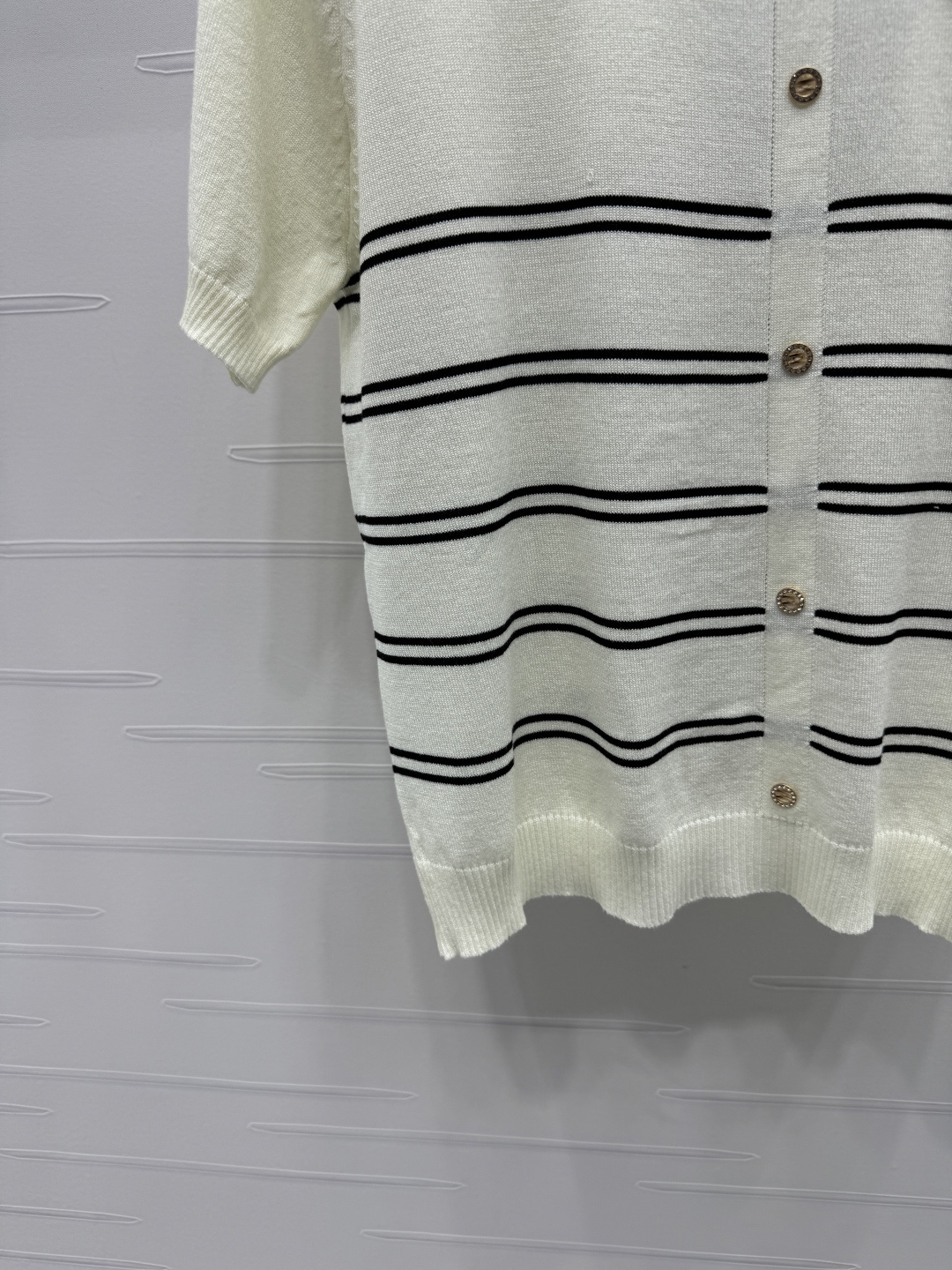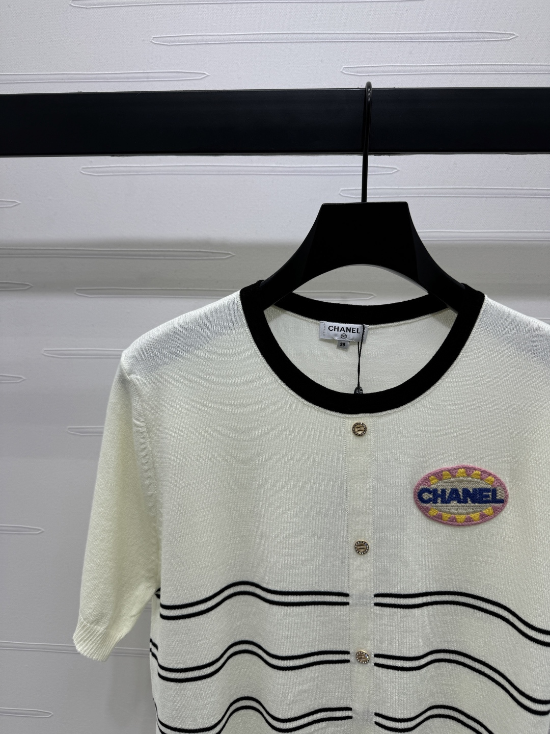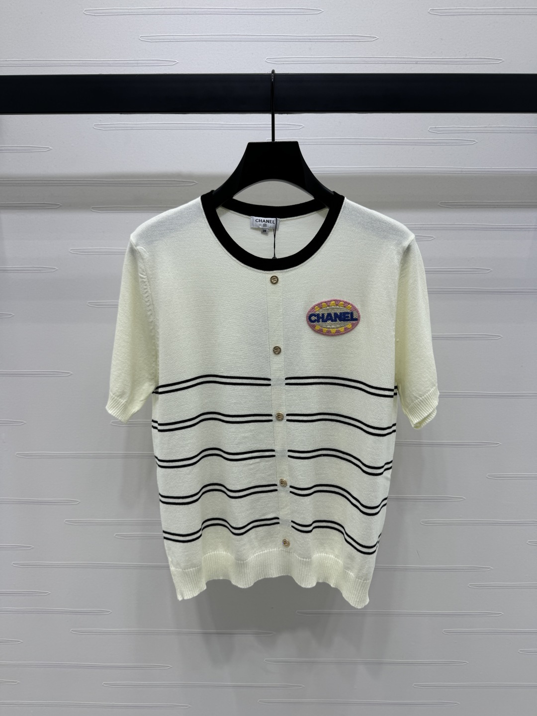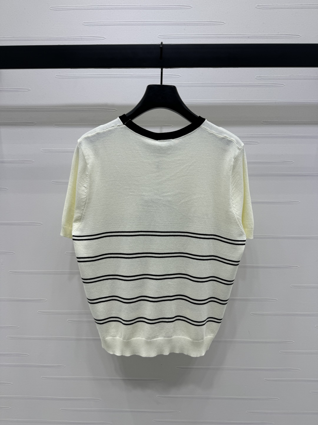 Chanel Striped Knit Short Sleeve Top with Button Detail