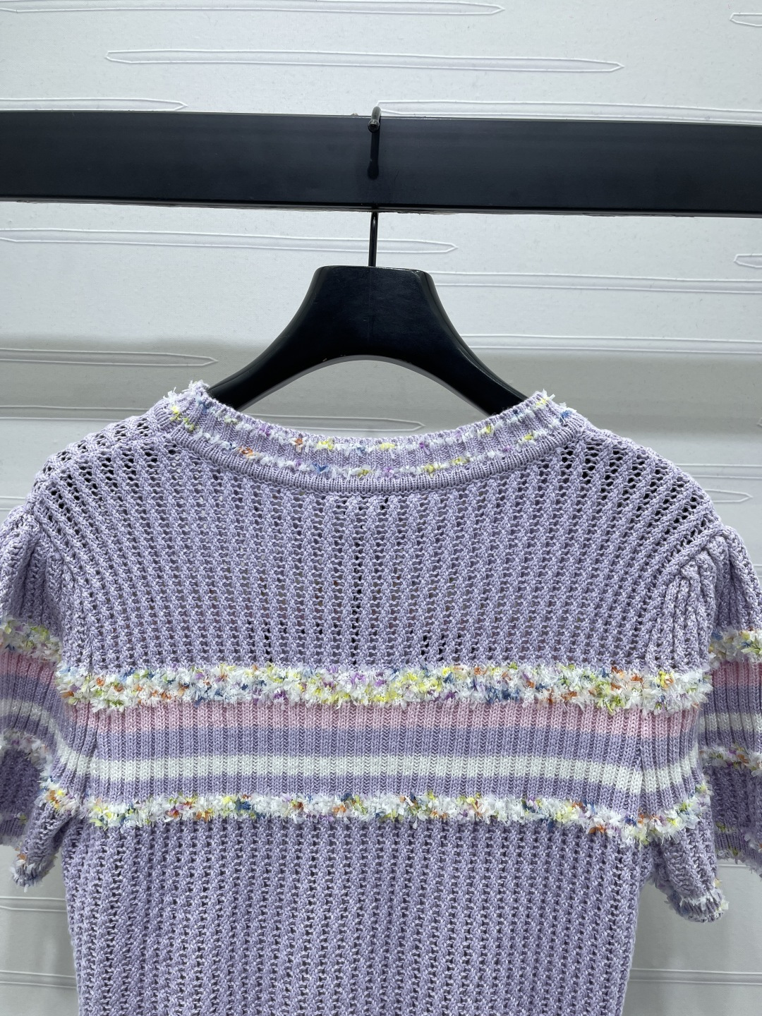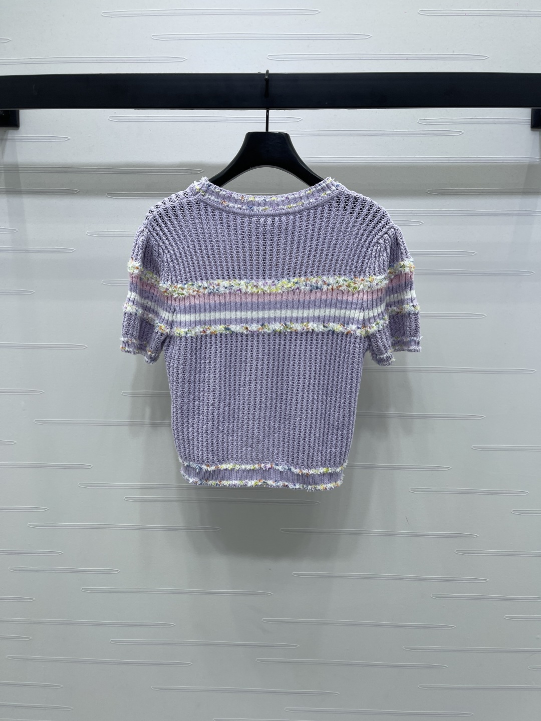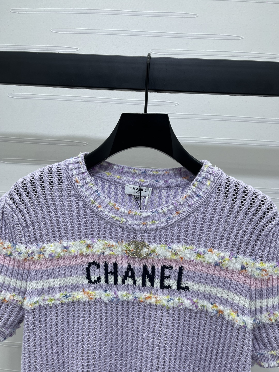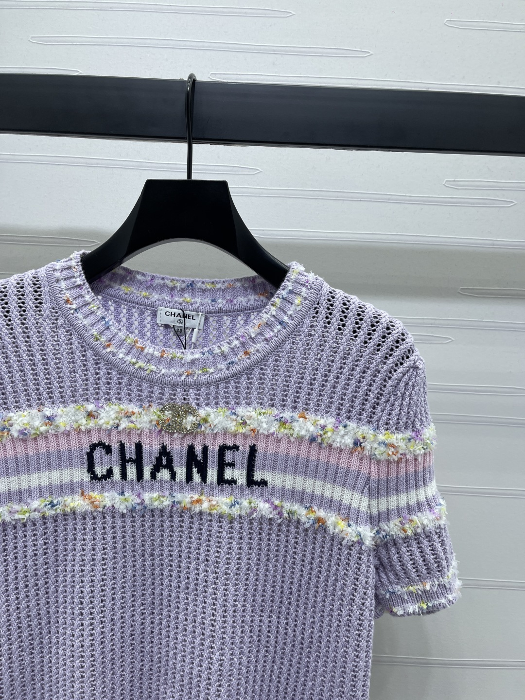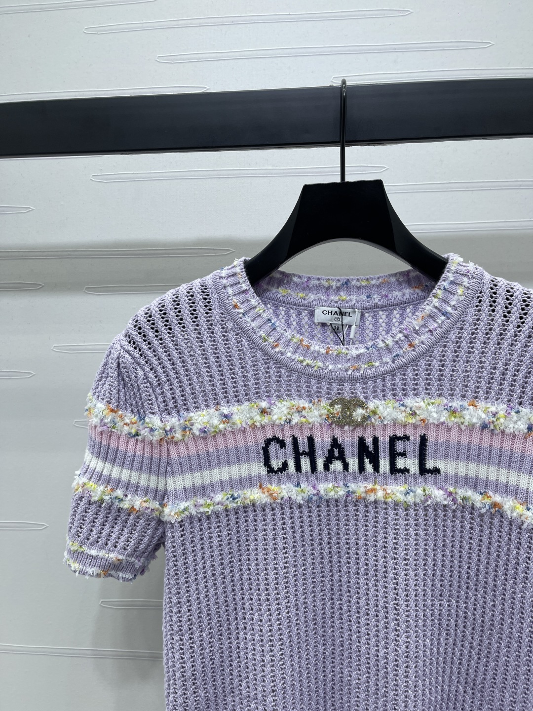 Elevate your wardrobe with this iconic Chanel knitted top. Features a crewneck, short sleeves, and a stylish logo, perfect for adding a touch of elegance to any outfit.