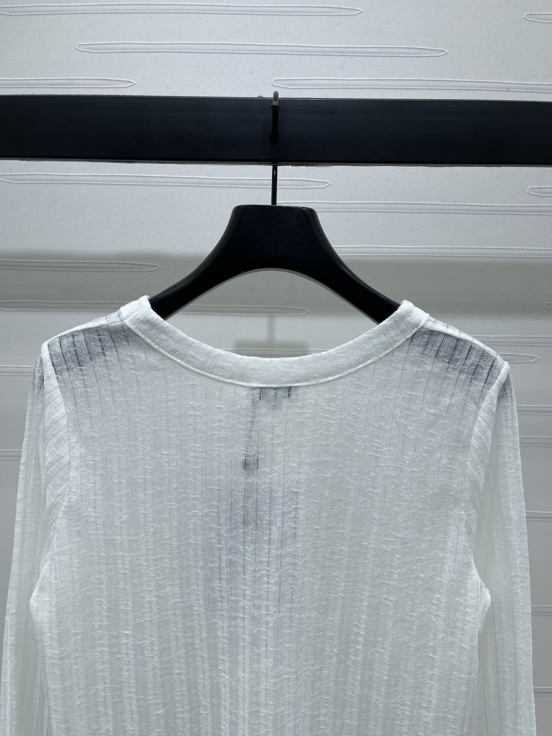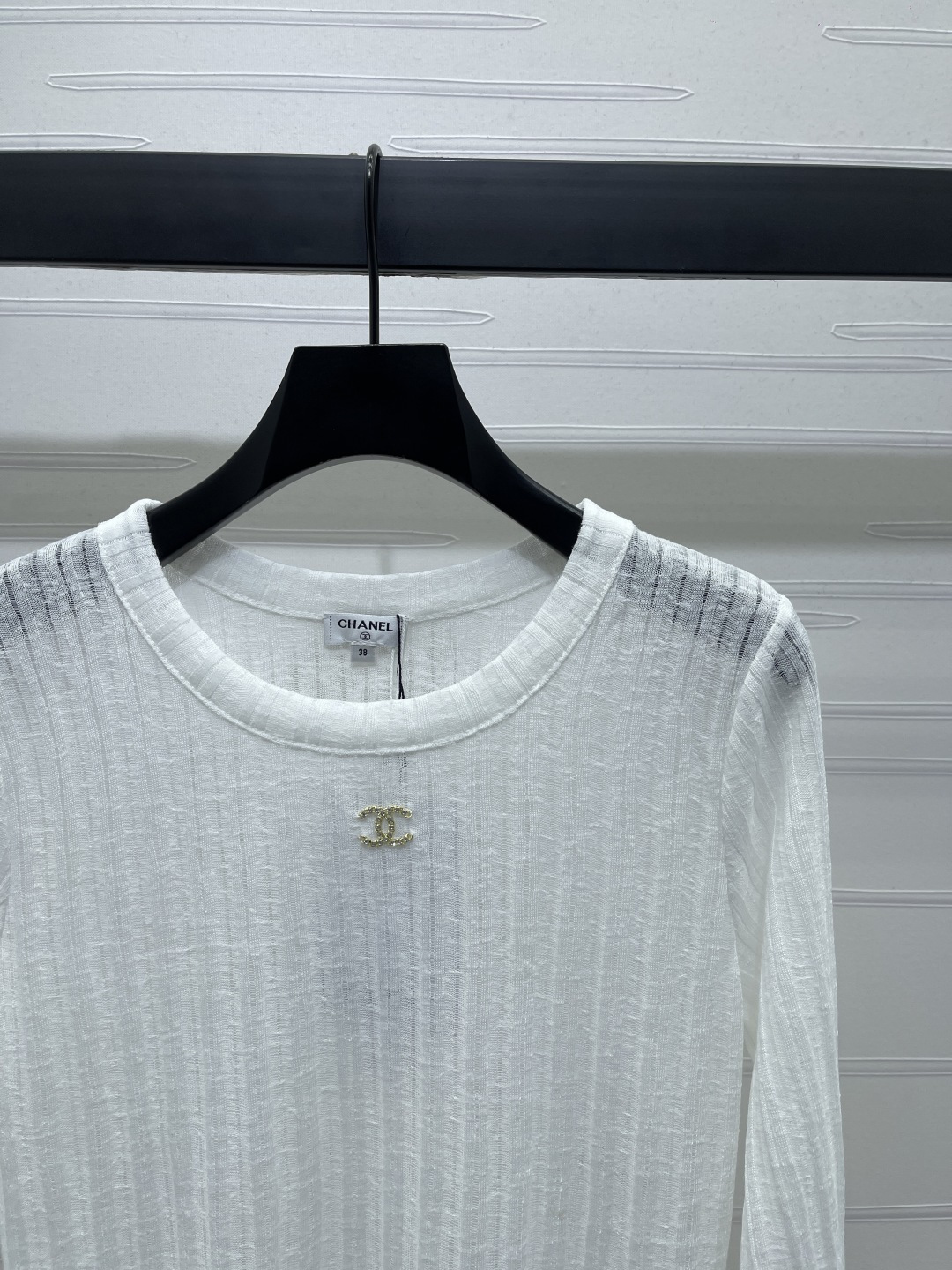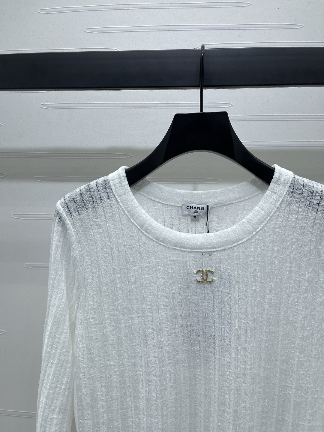 Elevate your wardrobe with this Chanel knitted long sleeve top. Features a round neck, vertical ribbed design, and the iconic CC logo.