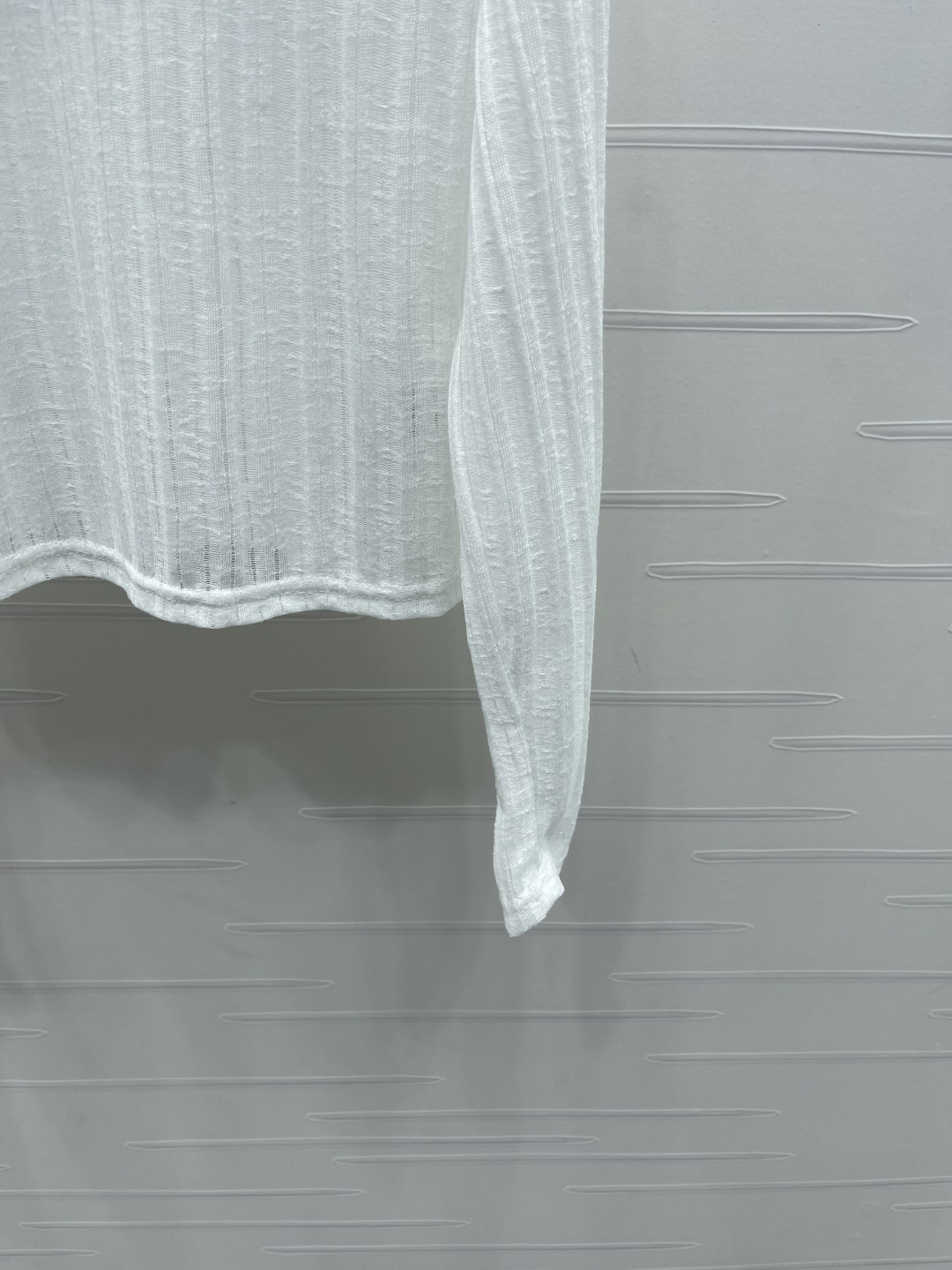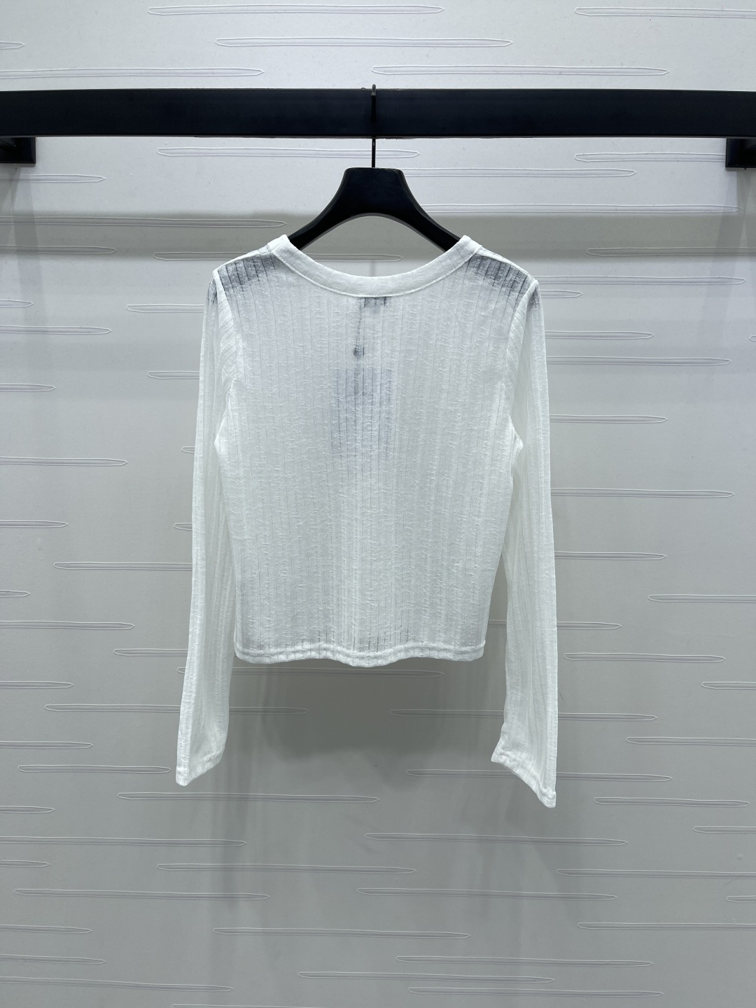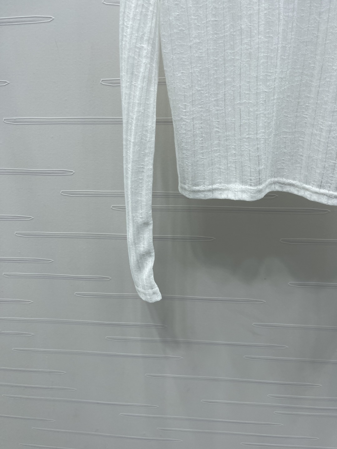 Elevate your wardrobe with this Chanel knitted long sleeve top. Features a round neck, vertical ribbed design, and the iconic CC logo.