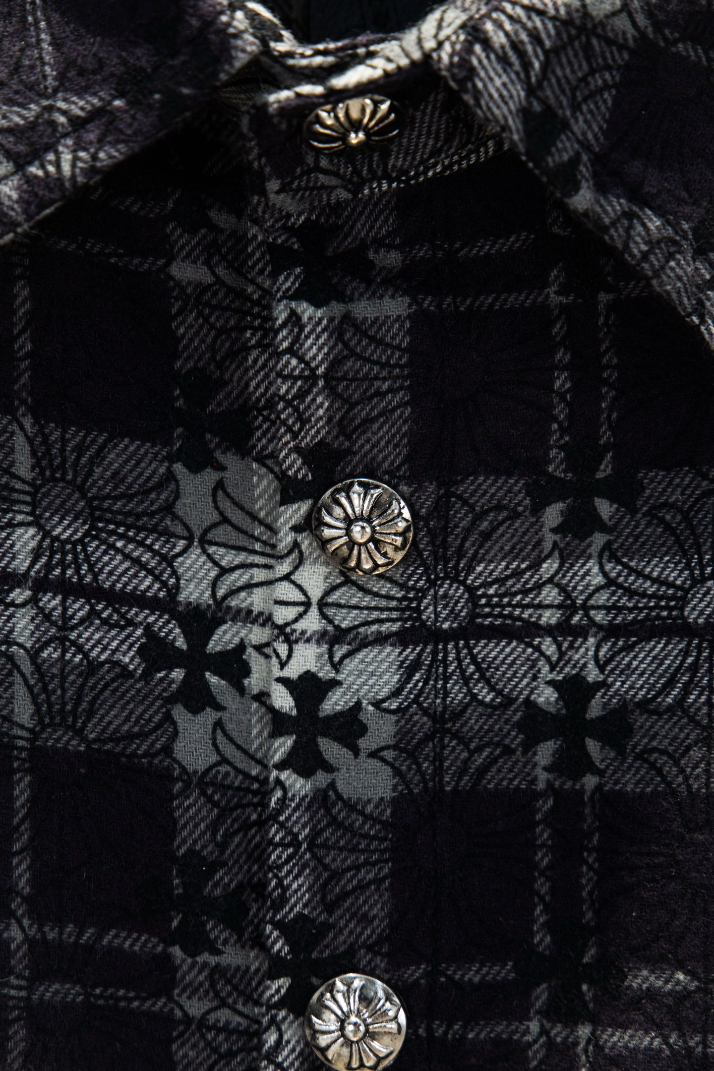 Elevate your wardrobe with this Chrome Hearts plaid shirt. Features custom jacquard fabric and leather appliqué cuffs. A versatile, unisex design for a stylish statement.