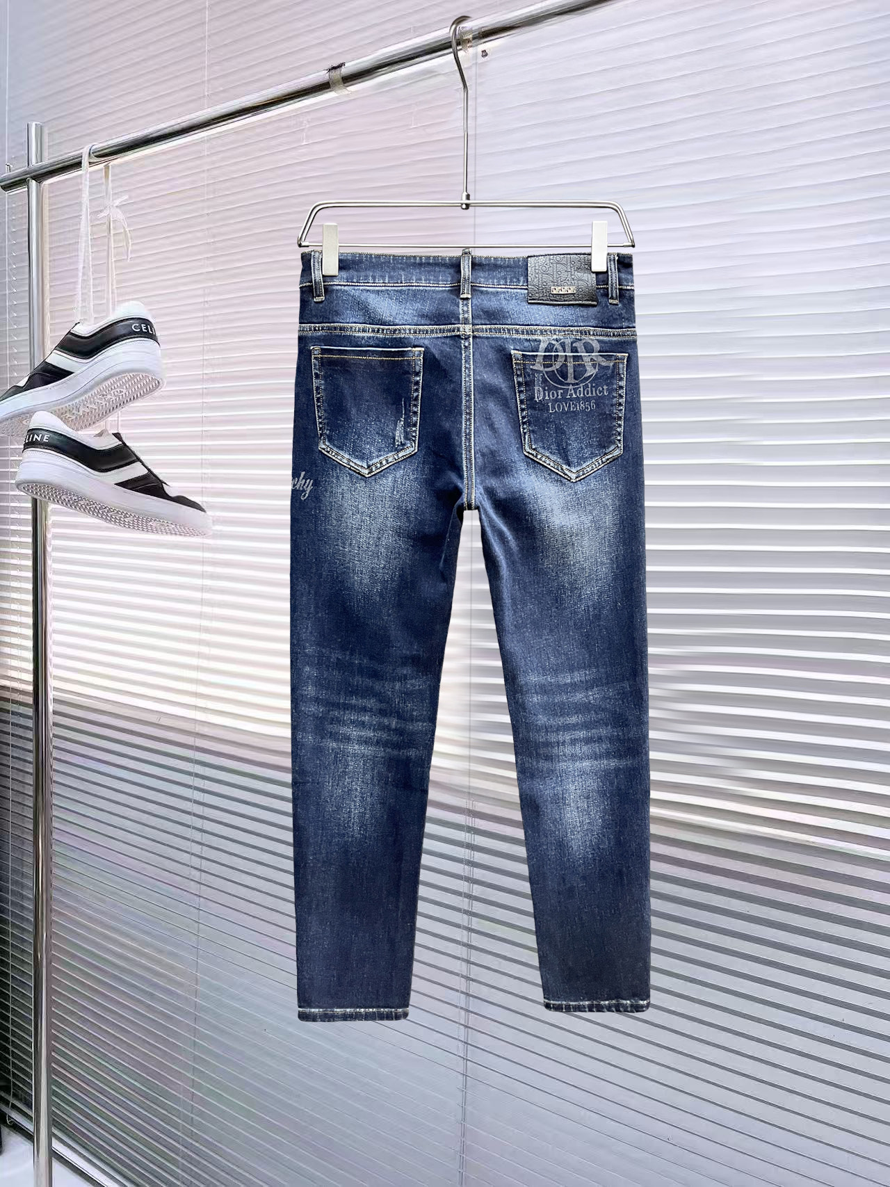 These Dior slim-fit jeans are a stylish and comfortable addition to any man's wardrobe. Made with high-quality denim, these jeans feature a unique 'Dior Addict' logo, adding a touch of luxury to a casual look.