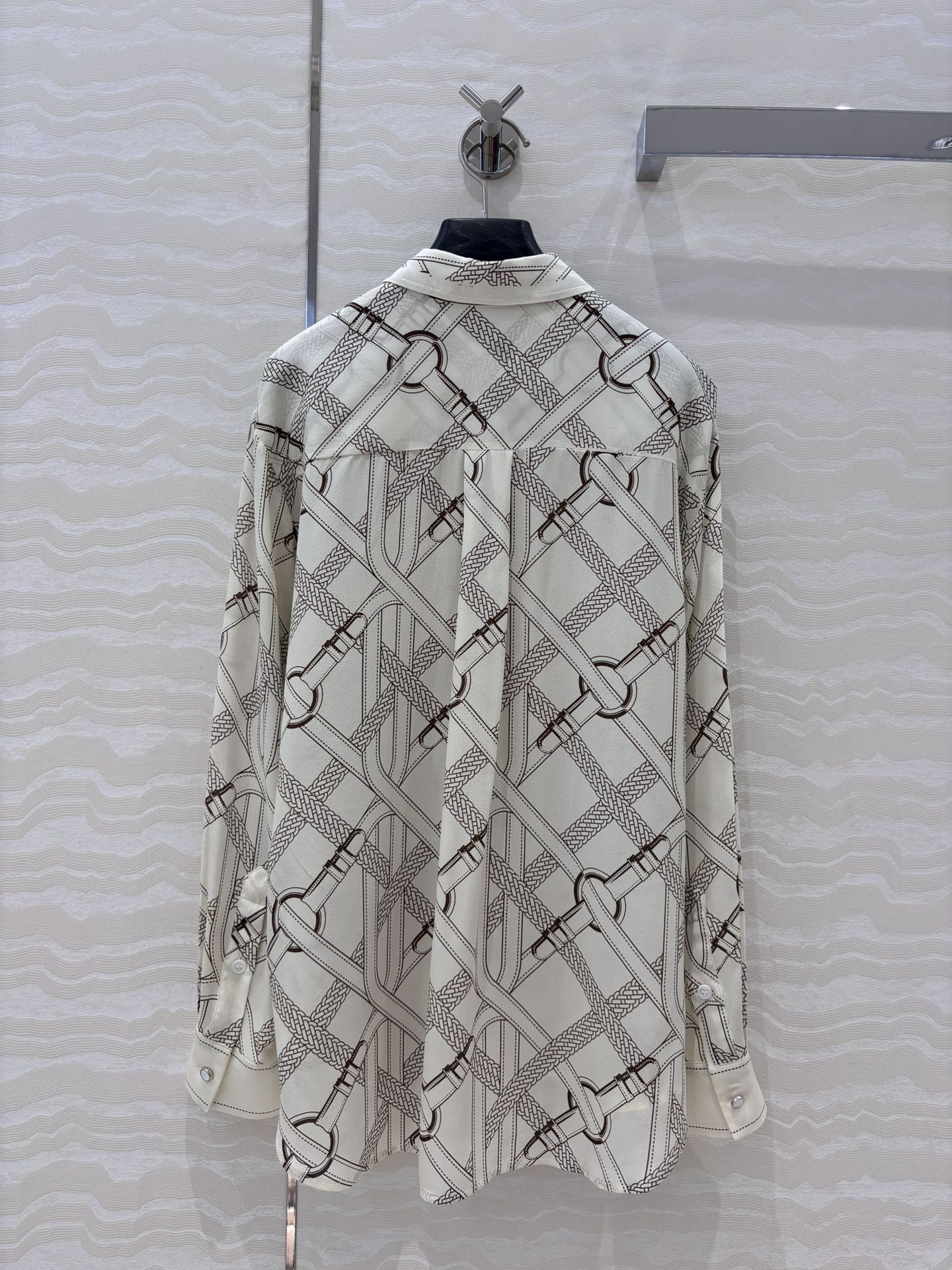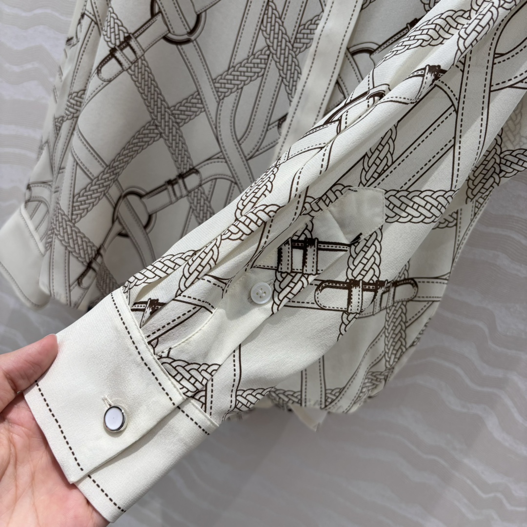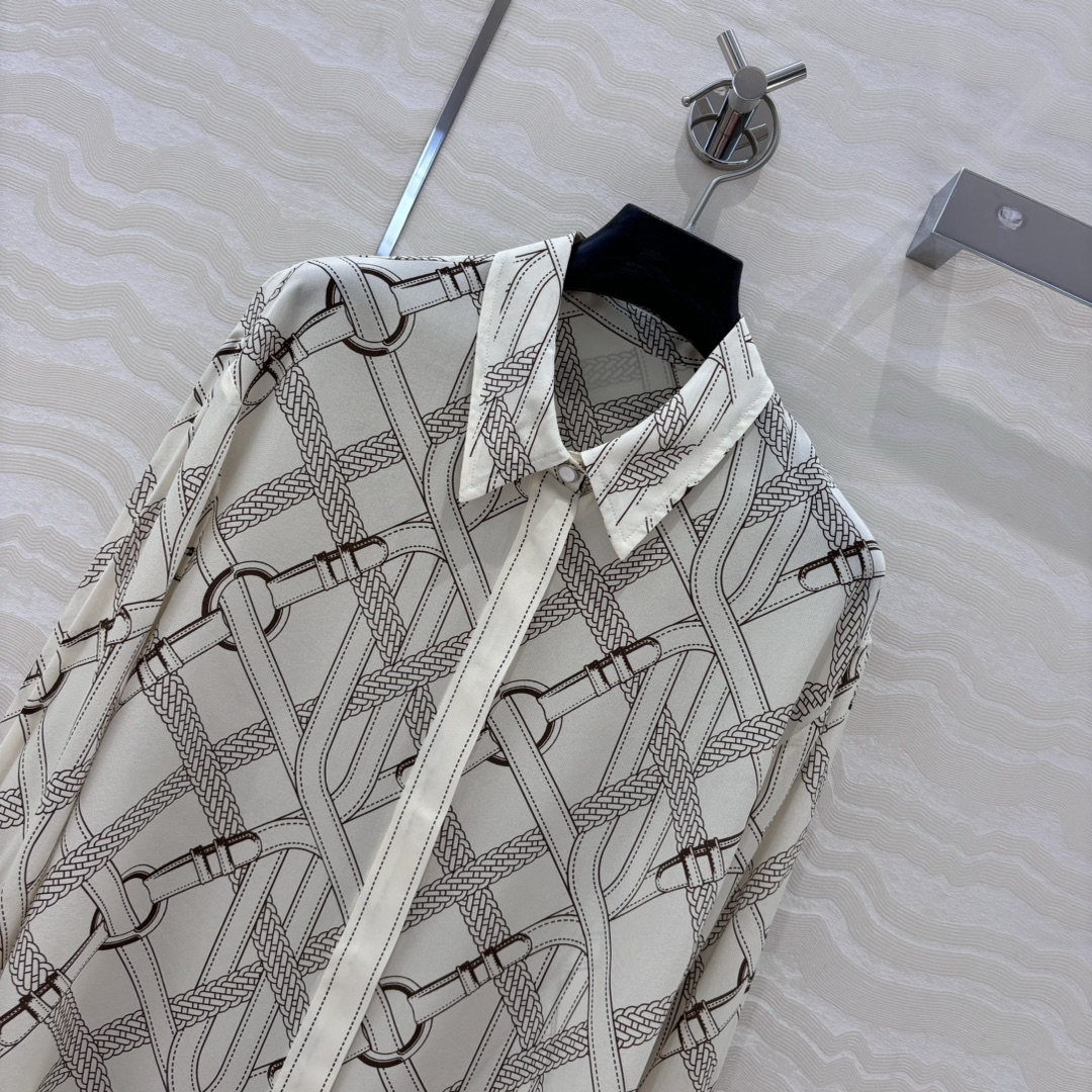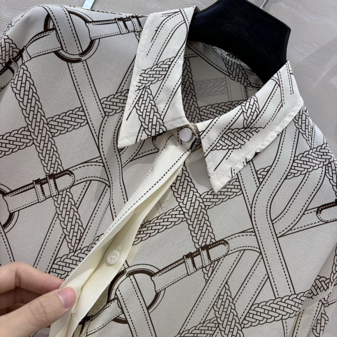 Elevate your style with this luxurious 100% silk blouse featuring a chic chain and buckle print. Perfect for a sophisticated, effortless look.