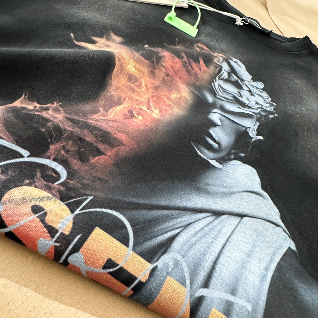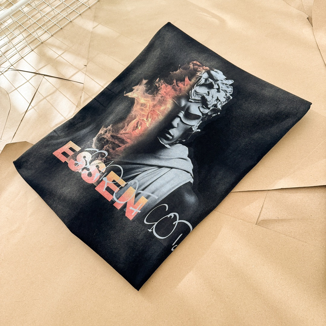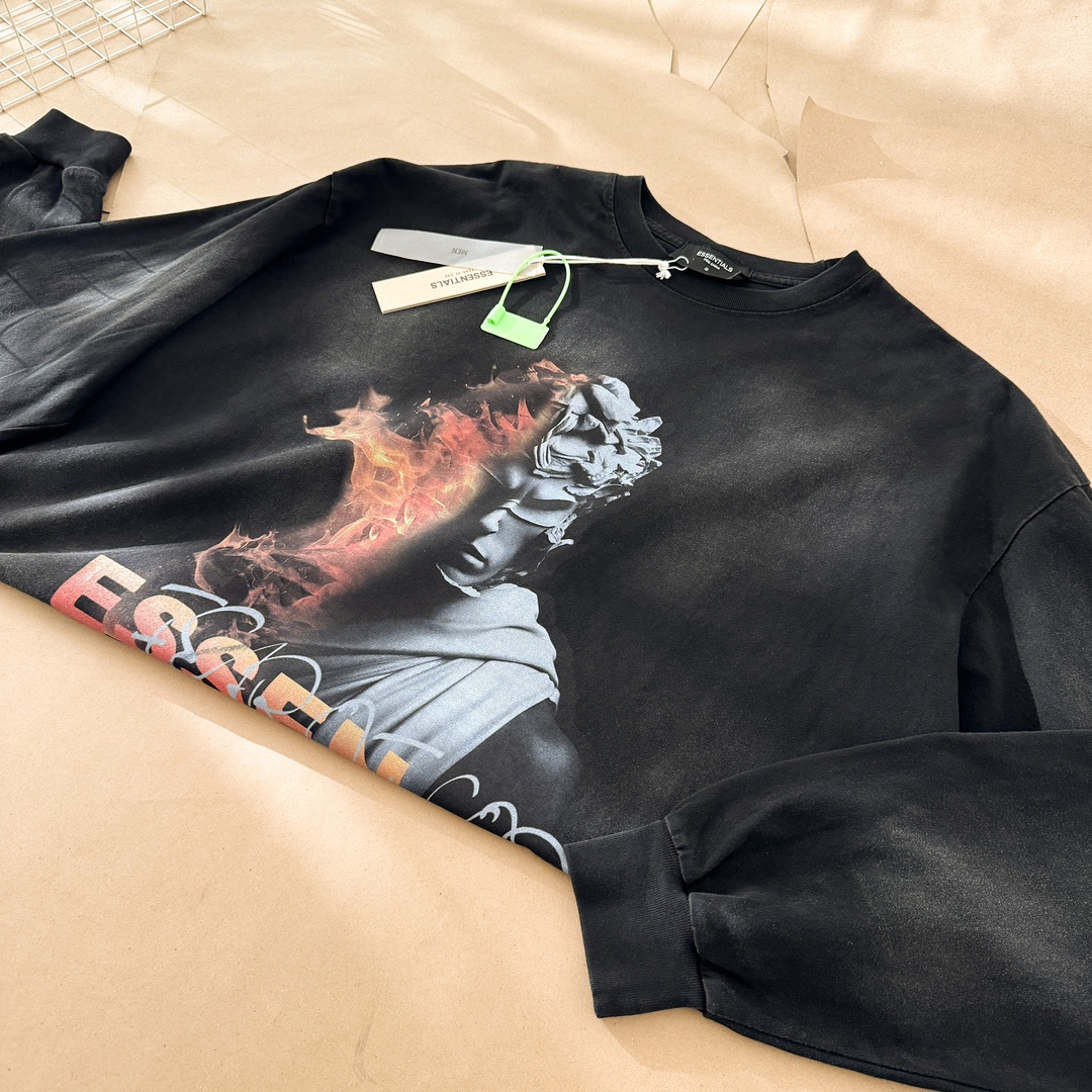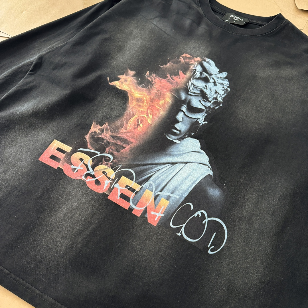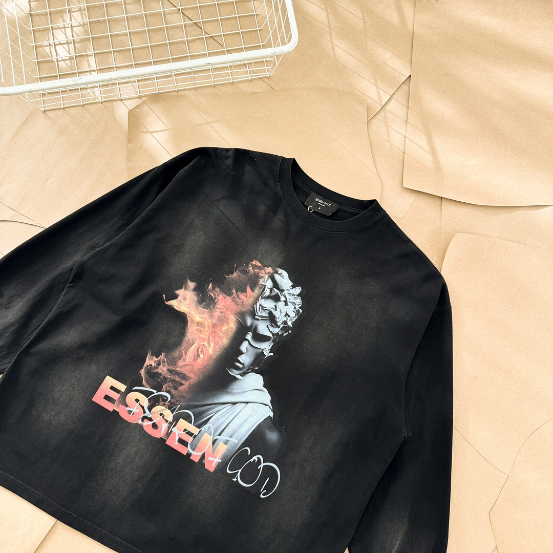 The Fear of God Essentials Flame Statue Long Sleeve T-Shirt is a standout piece that combines comfort with a unique artistic flair. It's perfect for those who appreciate streetwear with a touch of vintage aesthetics.