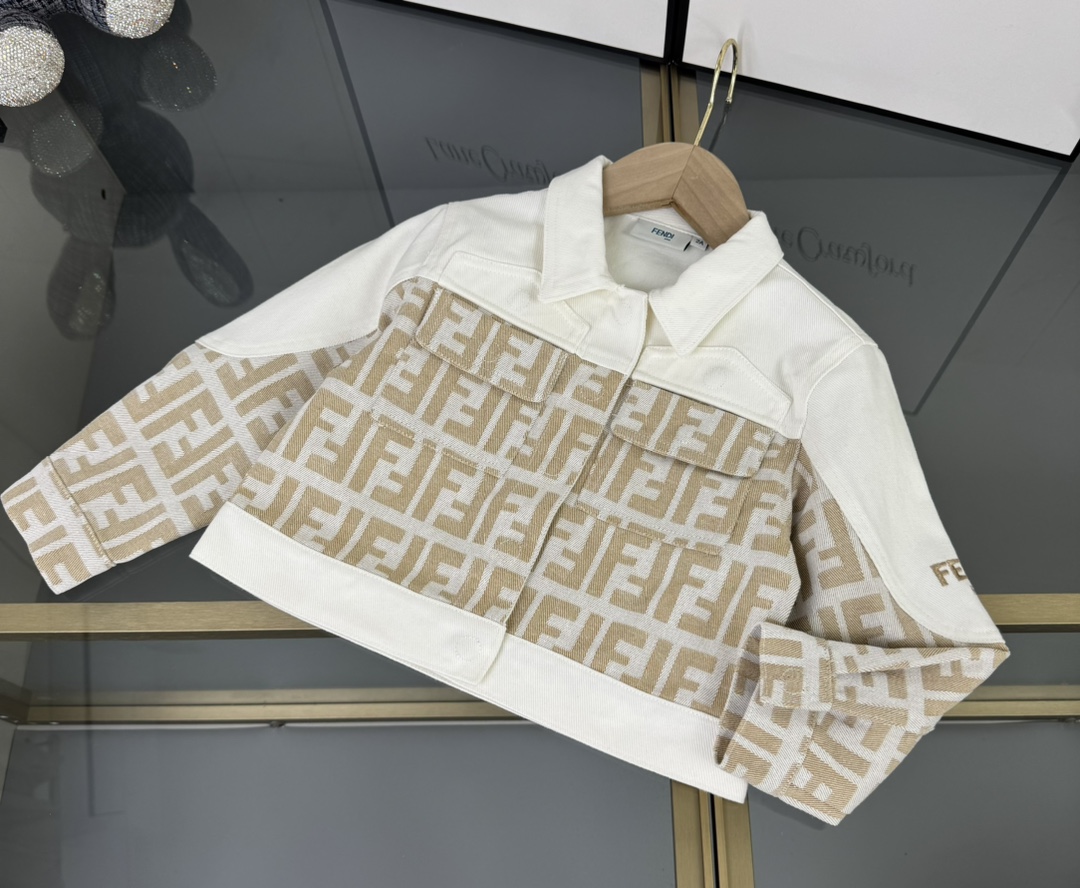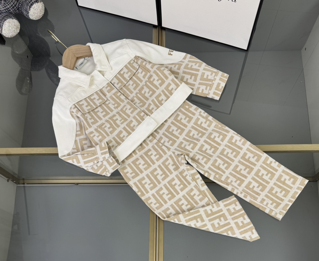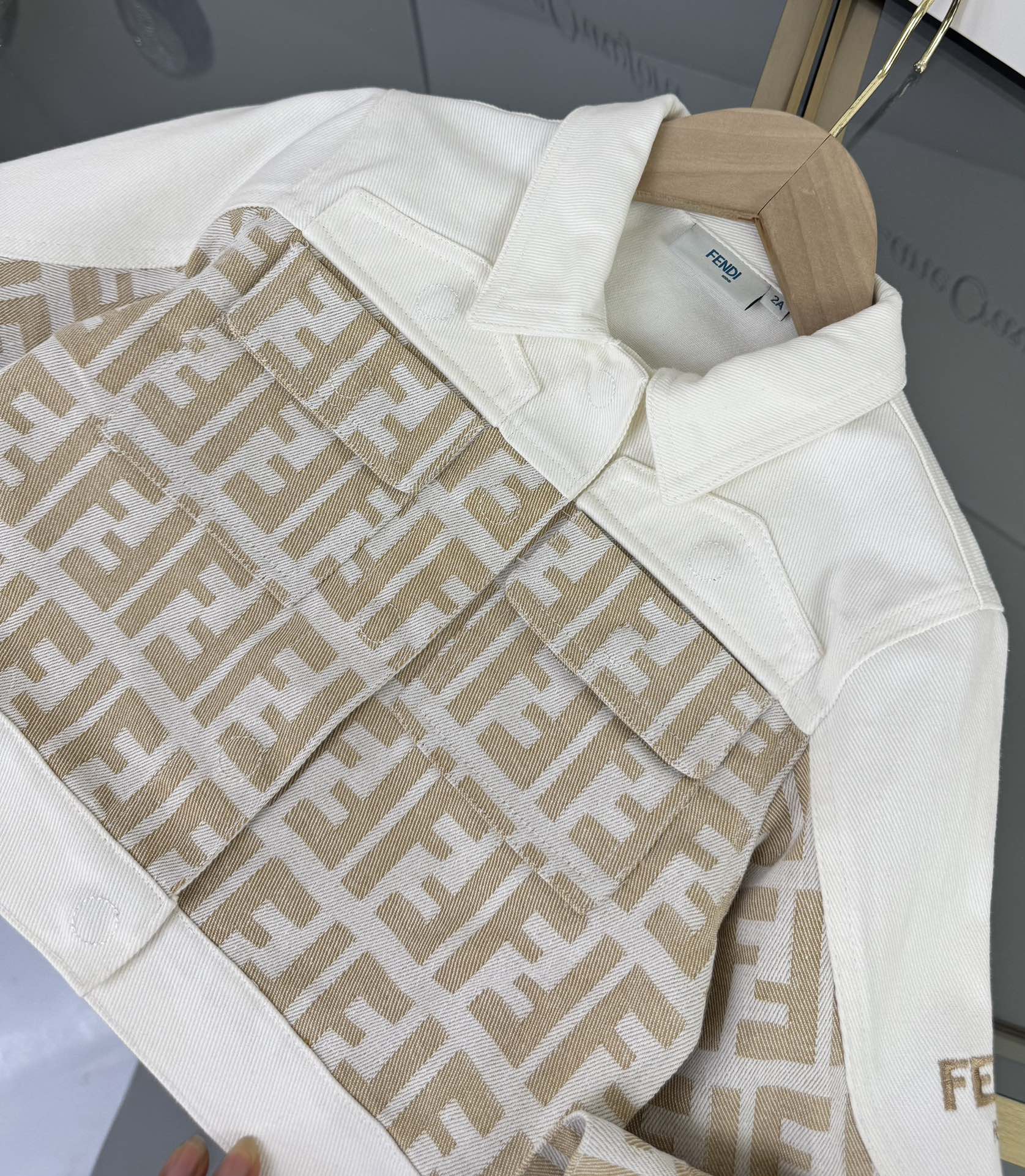 This Fendi kids' denim jacket and pants set combines luxury fashion with everyday wearability. The iconic FF jacquard pattern and quality craftsmanship ensure your child stands out in style.
