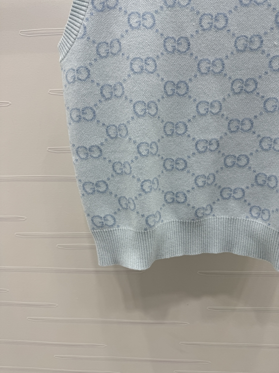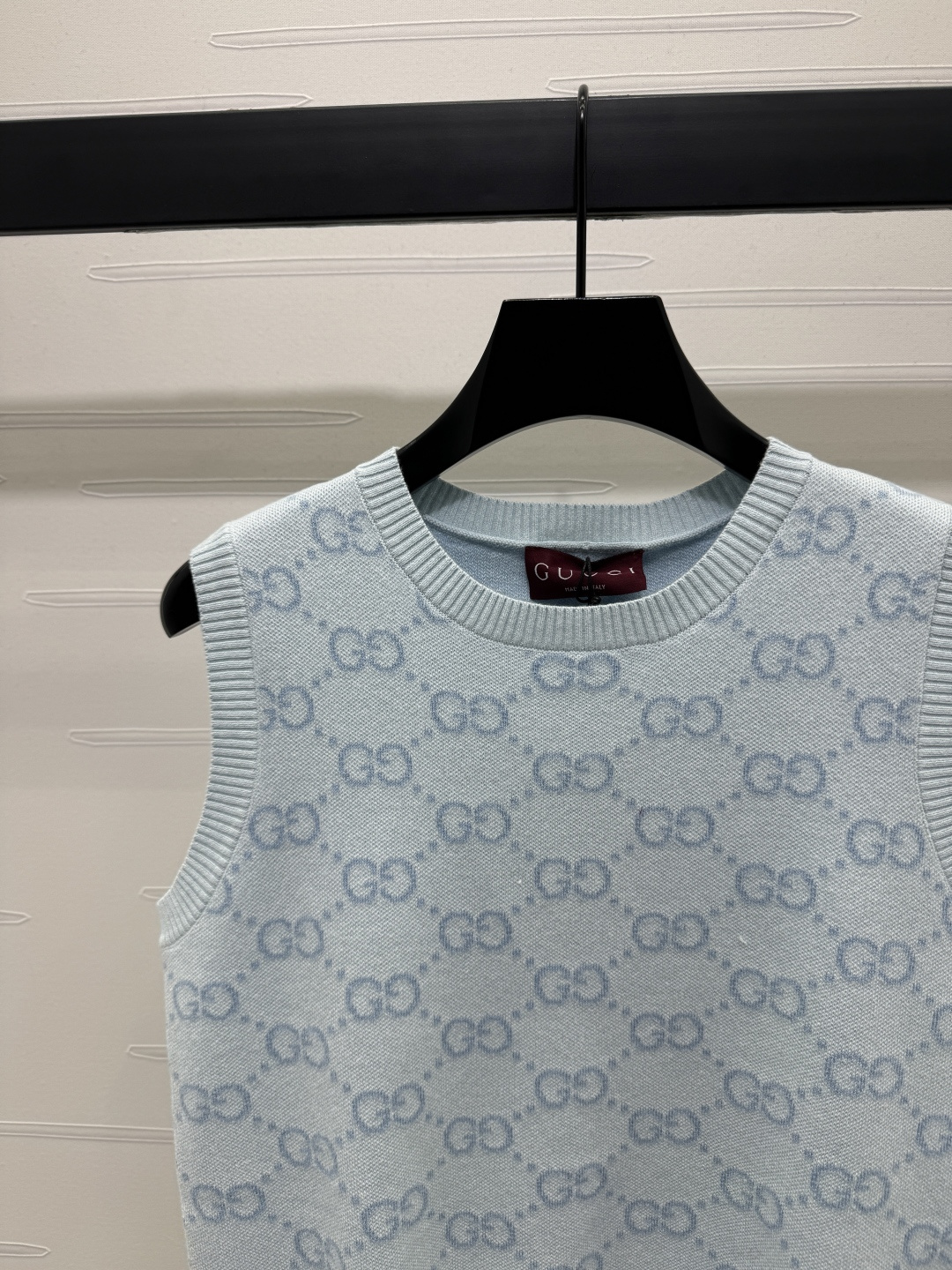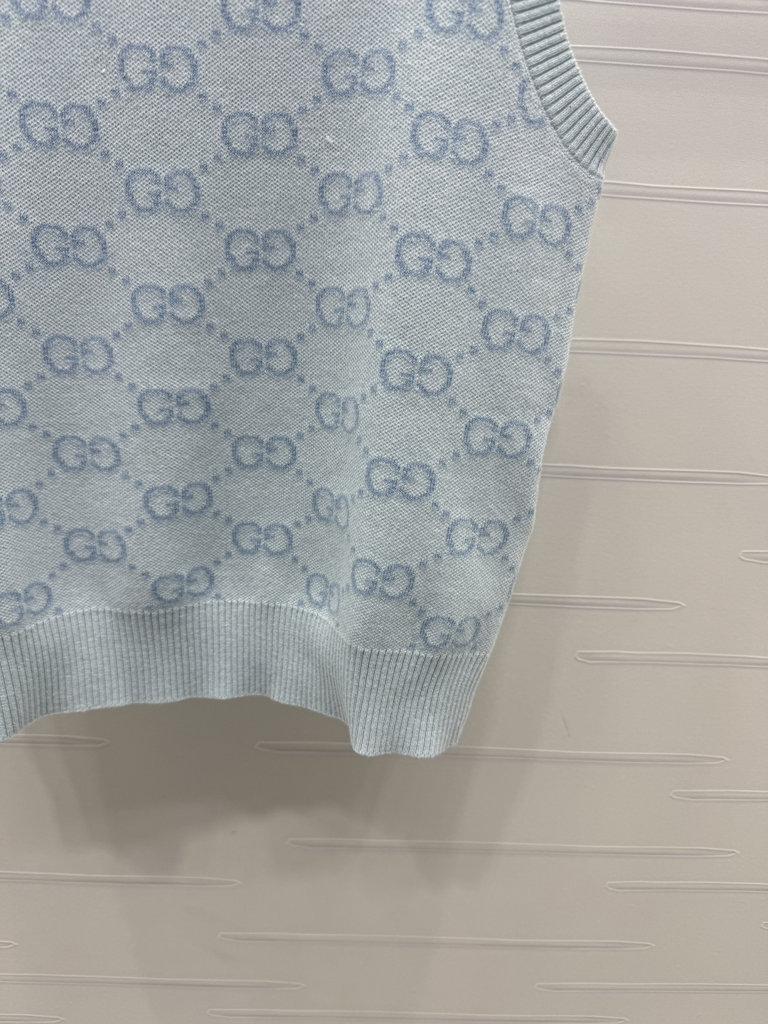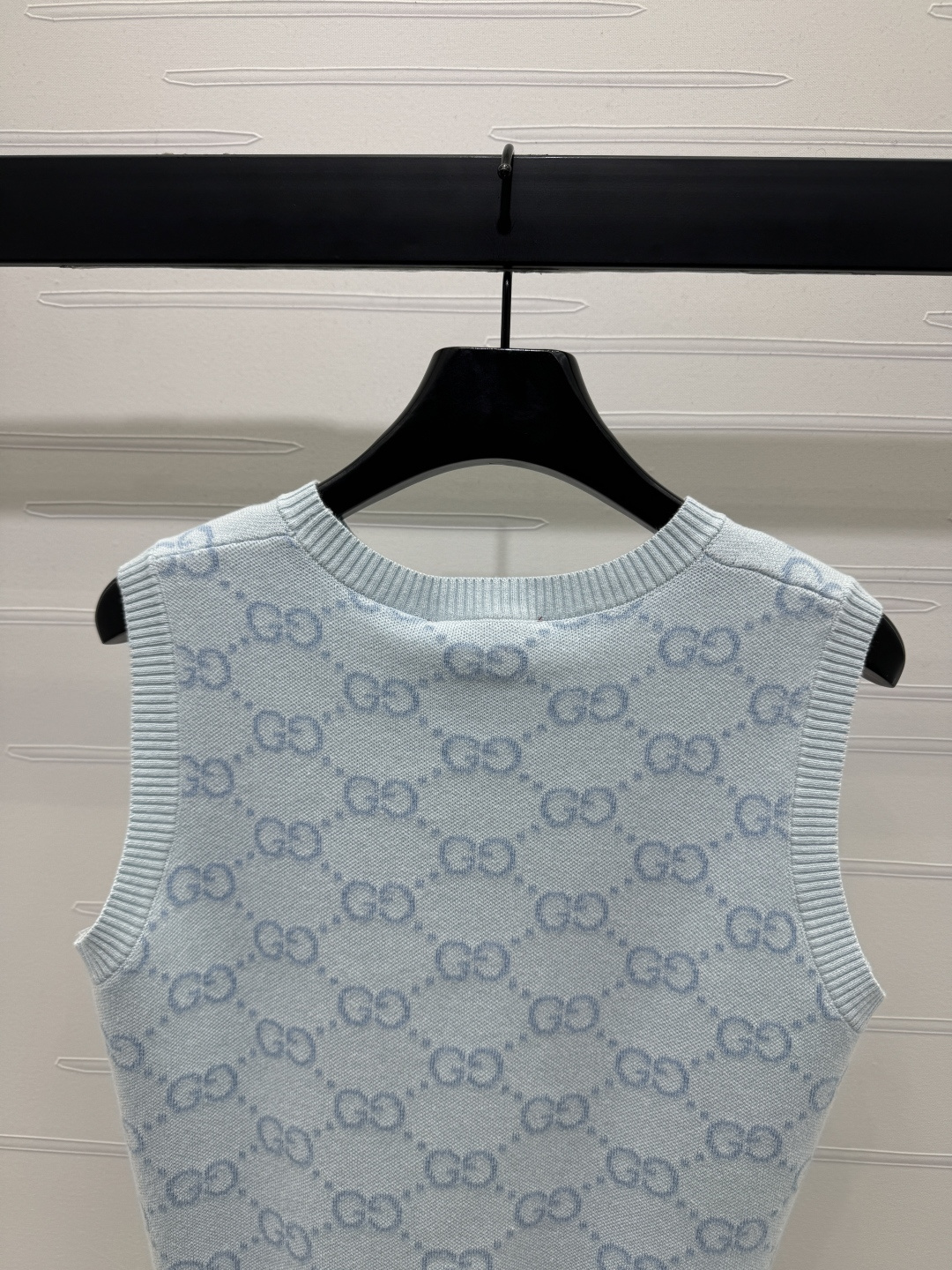 This Gucci knit vest is the perfect addition to your wardrobe. Crafted from high-quality wool, this vest features a unique jacquard design with the iconic GG logo, offering a blend of vintage charm and modern elegance. Its sleeveless design makes it ideal for layering, providing warmth without sacrificing style.