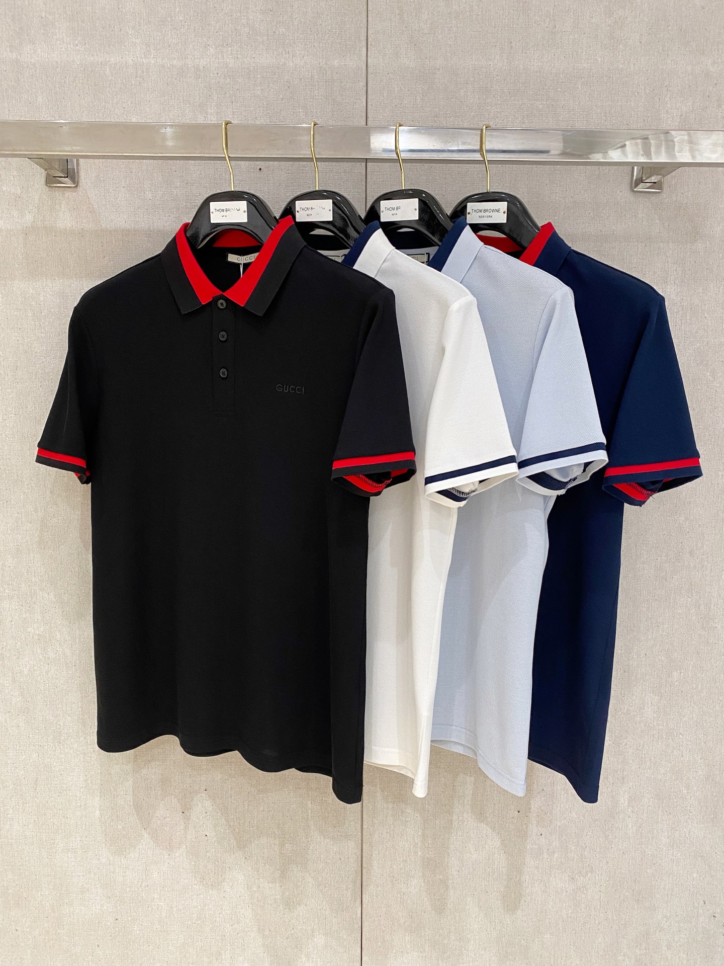 Elevate your style with this Gucci polo shirt. Crafted from breathable cotton with a red trim, it's perfect for a smart-casual look. Available in multiple colors and sizes.