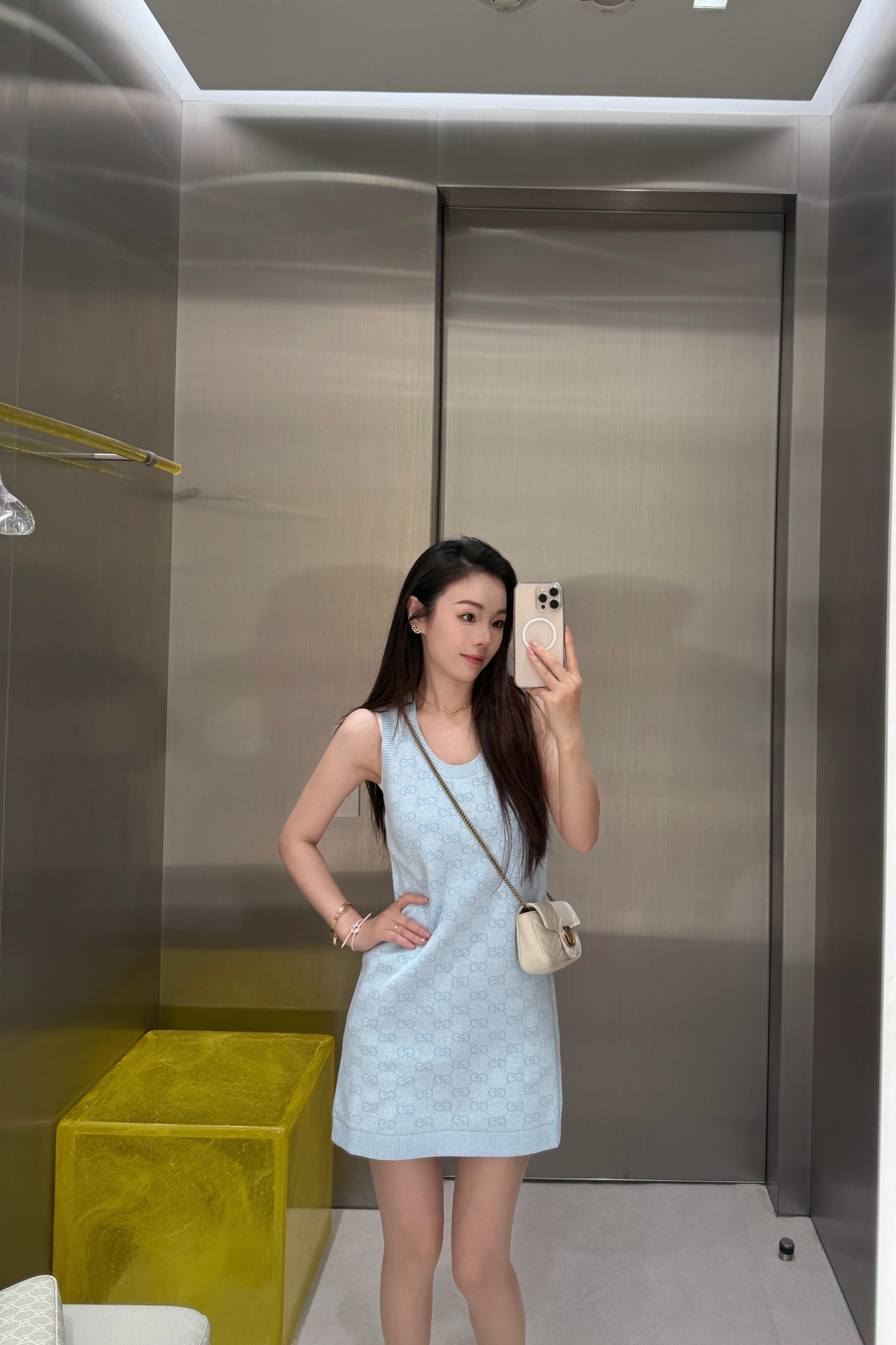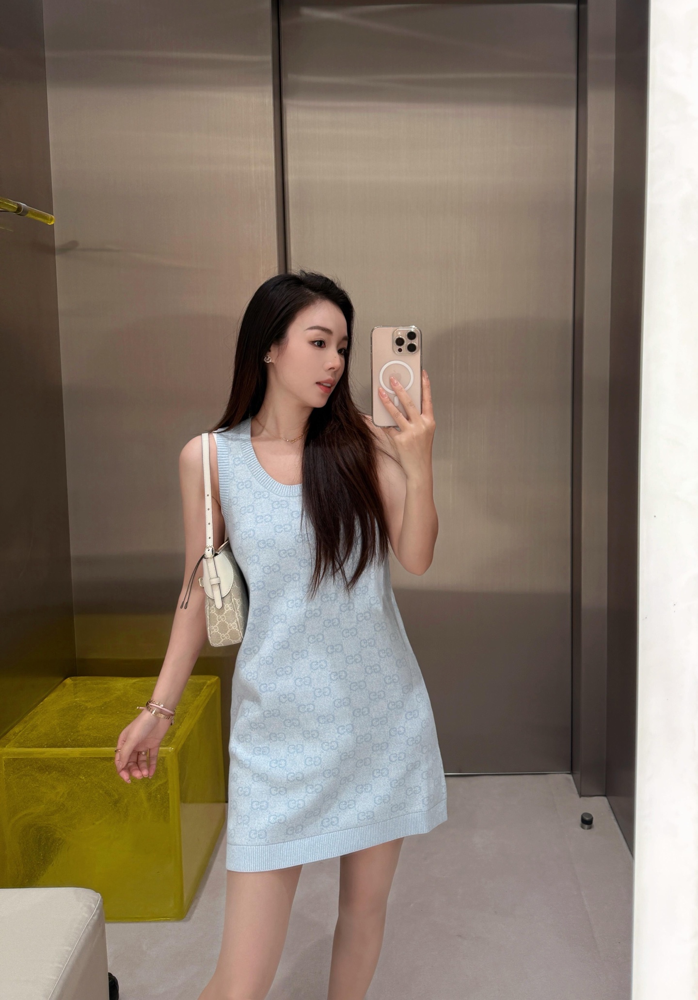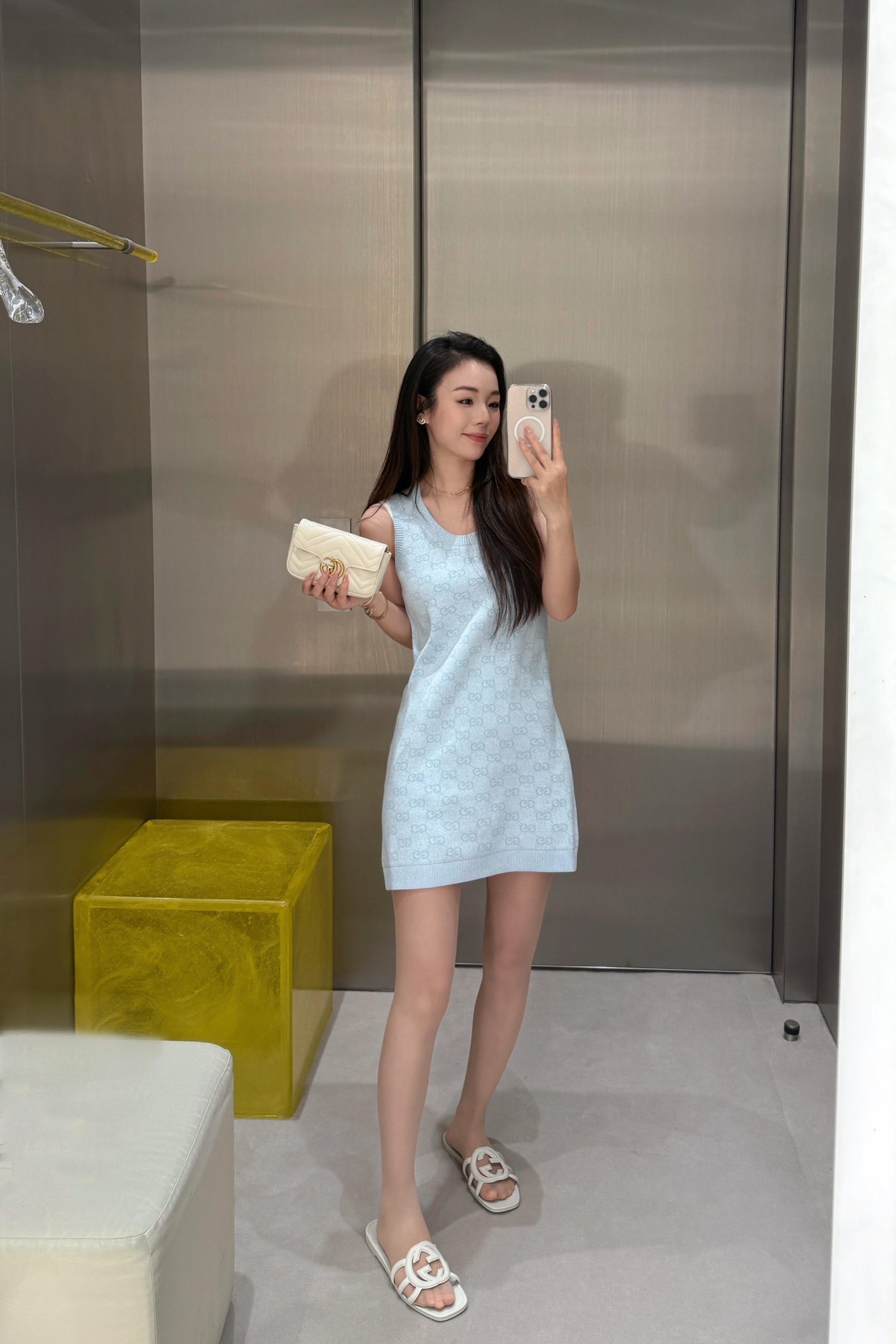 Introducing the epitome of subtle luxury, this Gucci sleeveless knit mini dress is designed for those who appreciate understated elegance. The dress features a delicate, all-over logo pattern that adds a touch of brand recognition without being overtly flashy. Perfect for both daytime outings and evening events, this dress is a versatile addition to any fashion-forward wardrobe.
