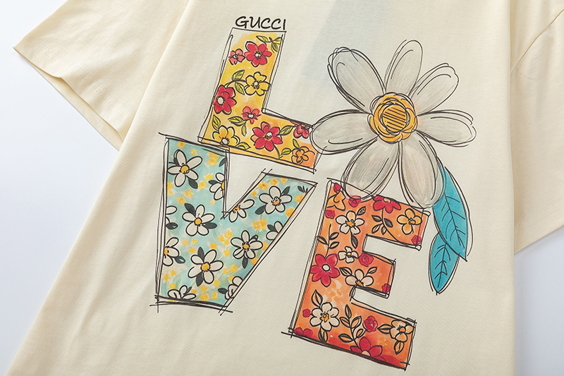 This Gucci T-shirt is crafted from comfortable cotton jersey and features a unique floral 'Love' print. Perfect for adding a touch of designer flair to your everyday wardrobe, this tee combines casual comfort with high-end style.