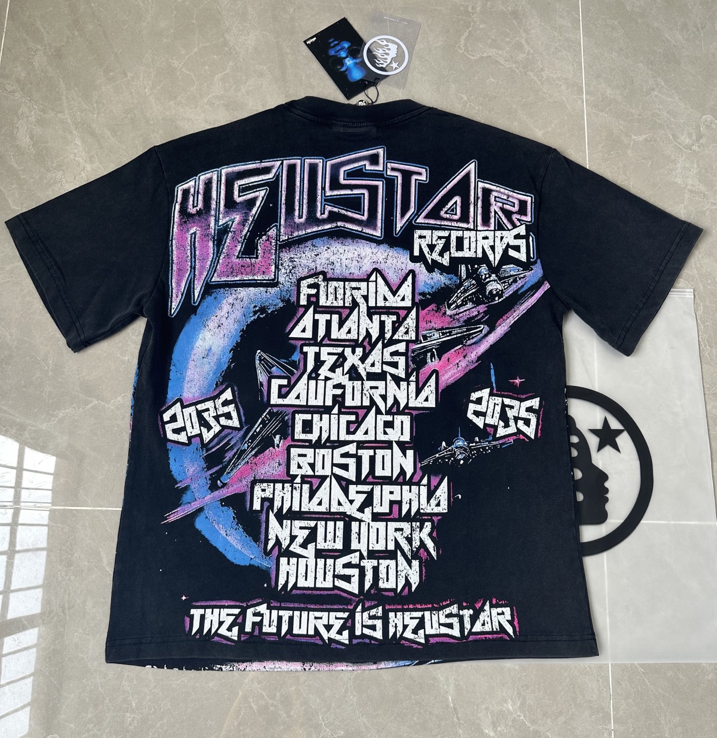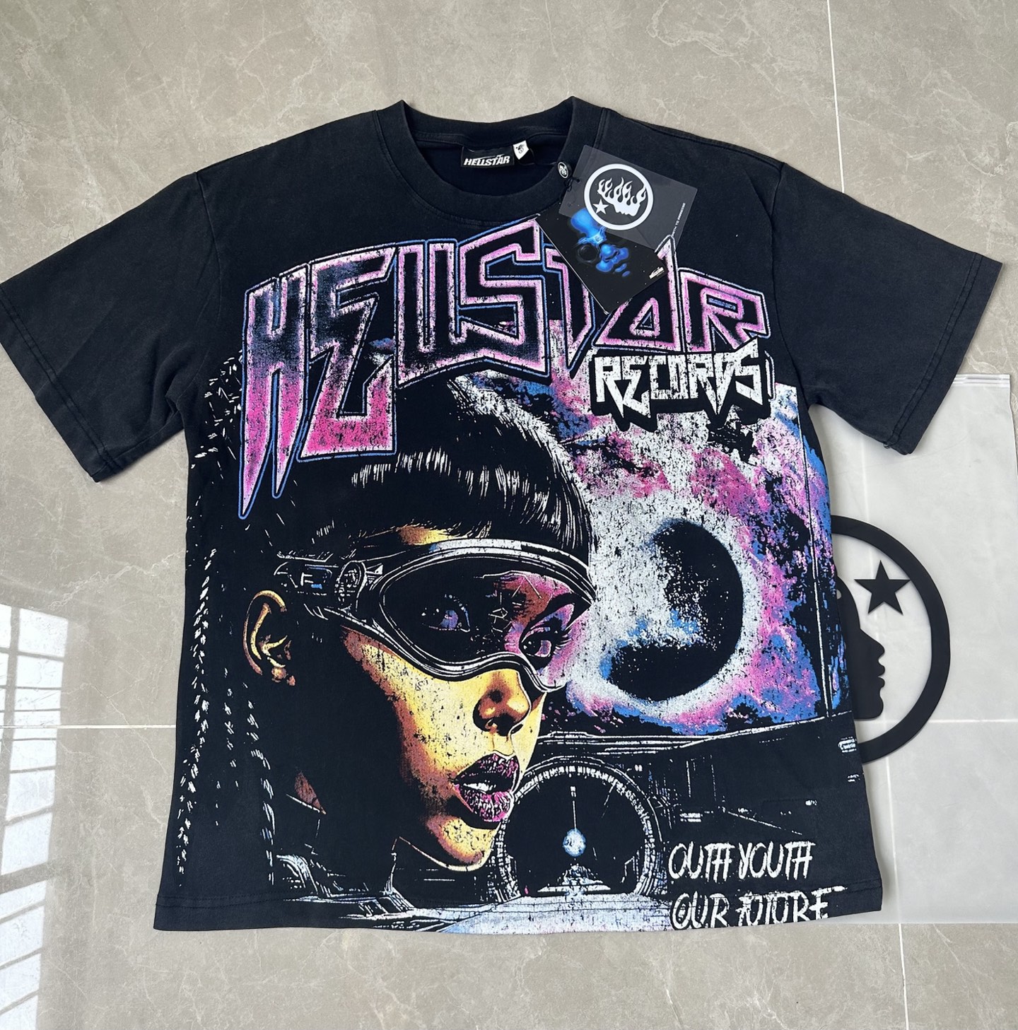 Elevate your streetwear with the Hellstar Records T-shirt, featuring a unique graphic design and comfortable washed cotton fabric. Available in sizes S-XL.