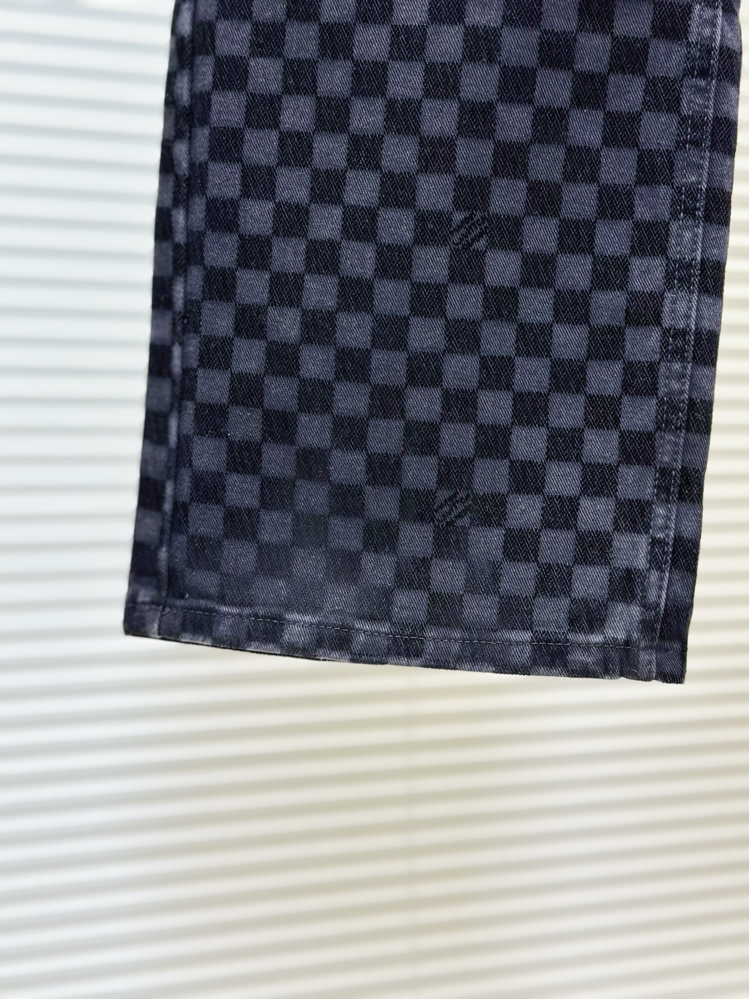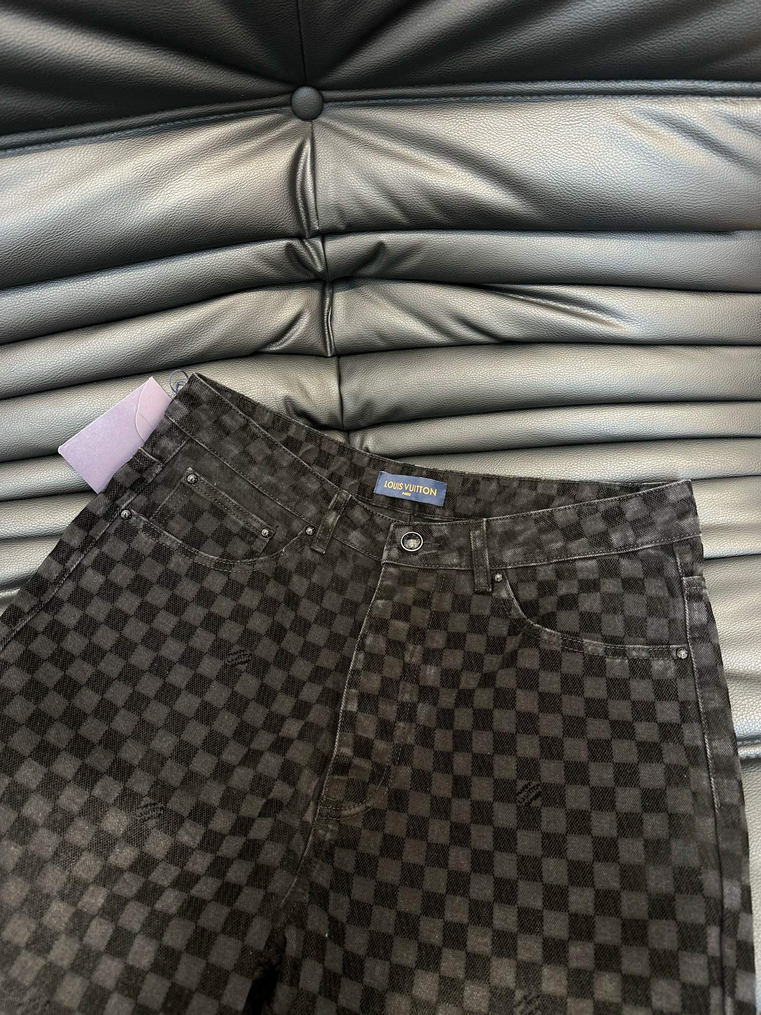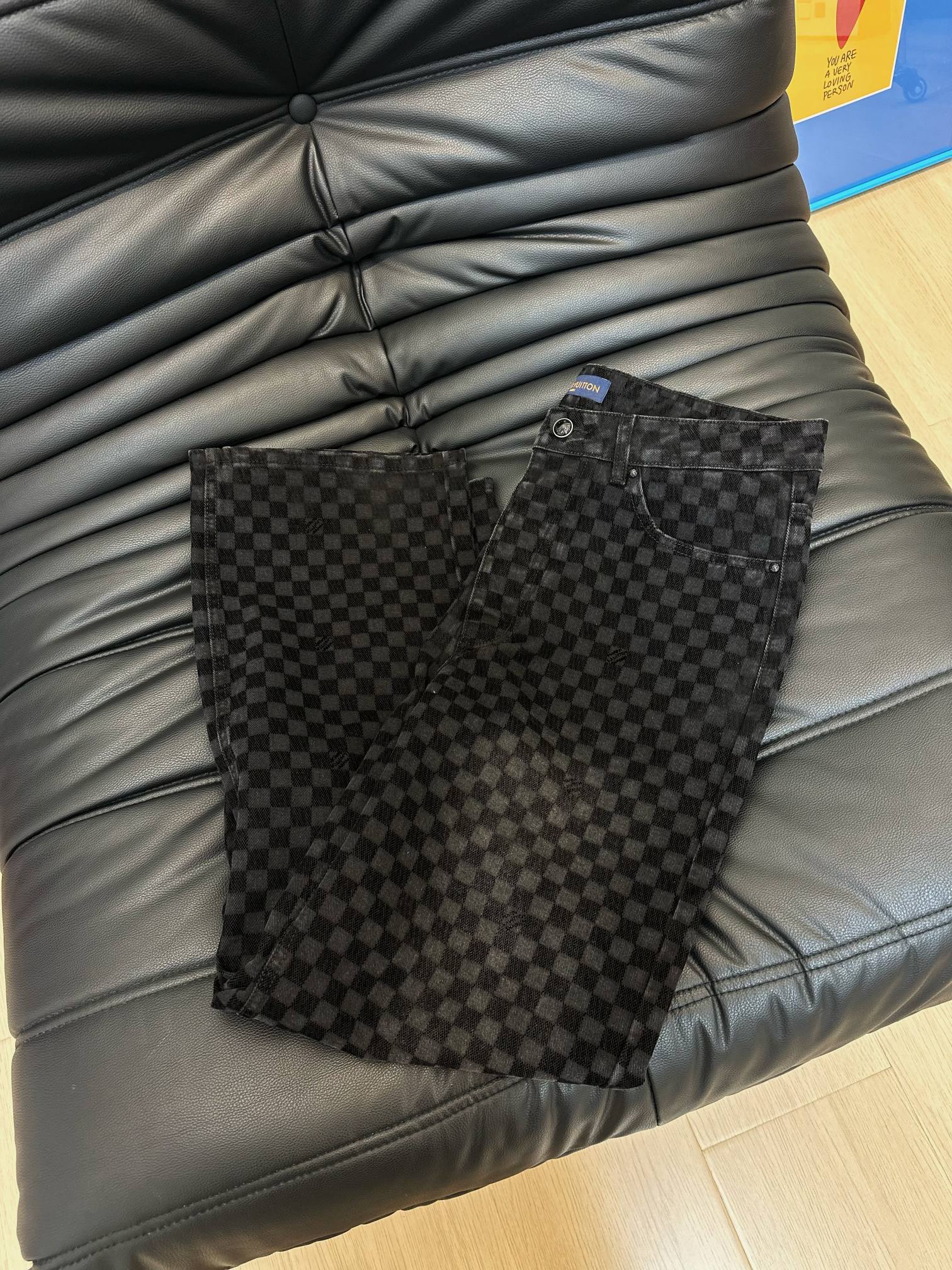 These Louis Vuitton 2025 checkered flocked denim pants are a stylish addition to any wardrobe, offering both comfort and a unique design.