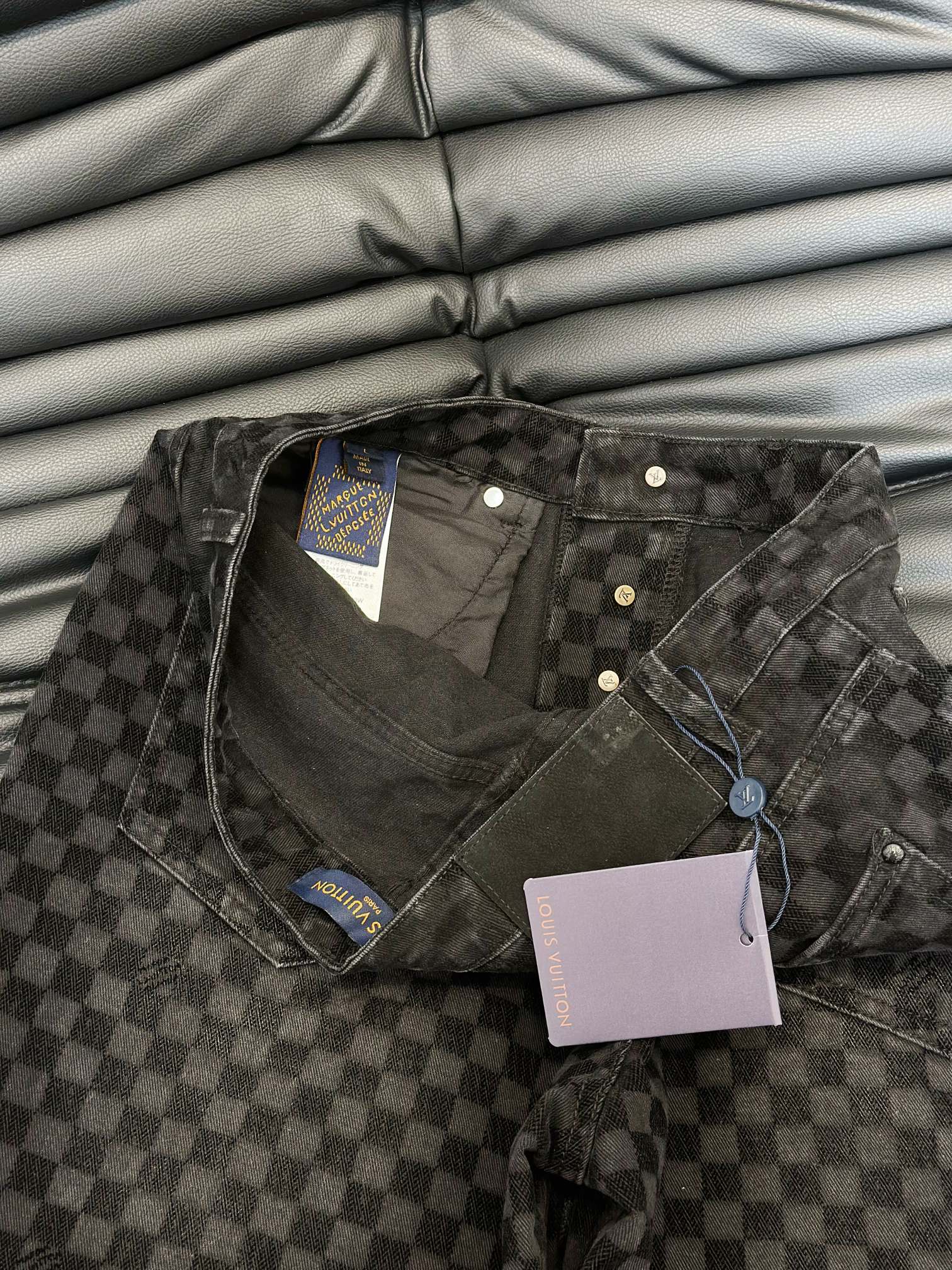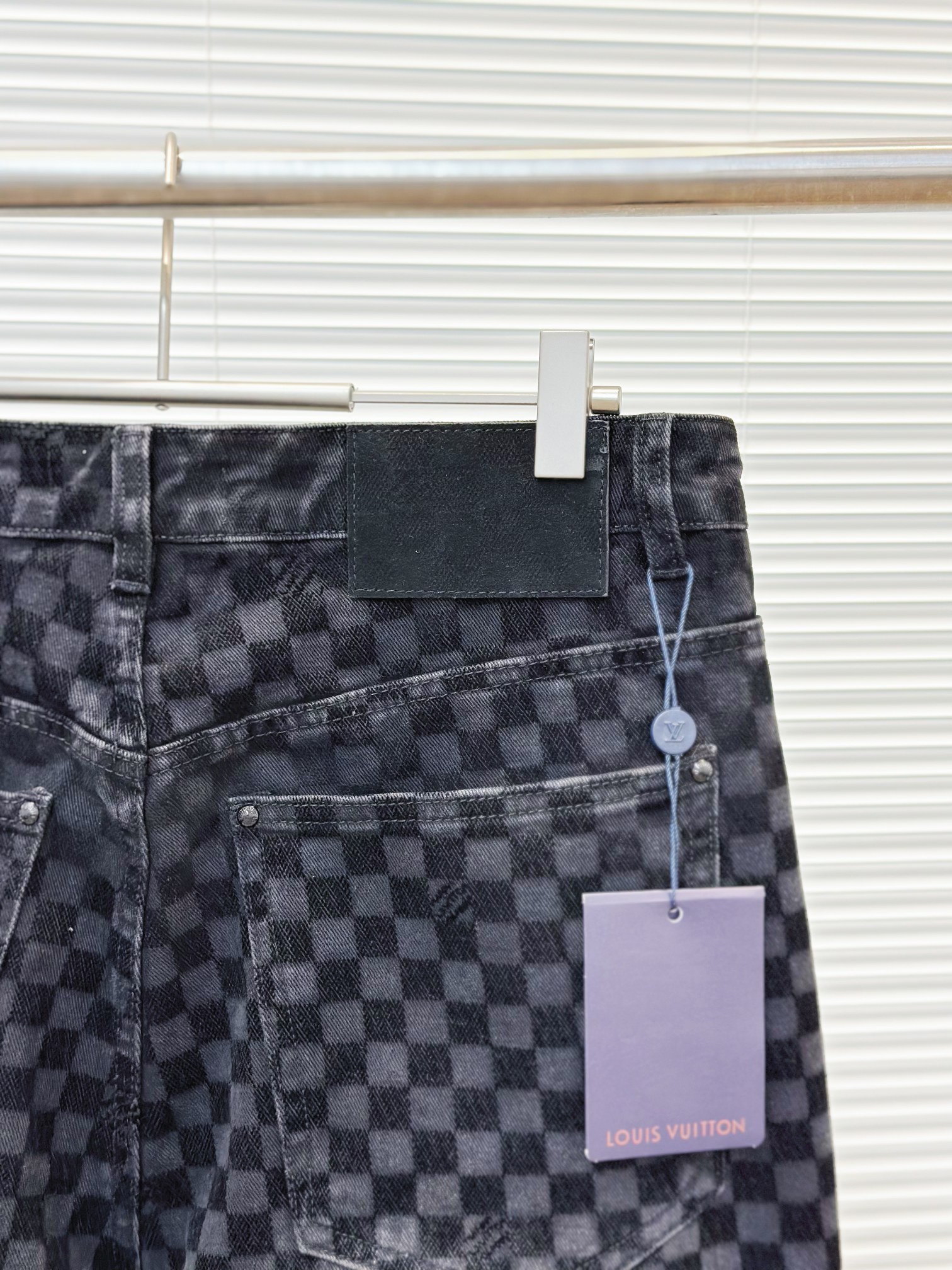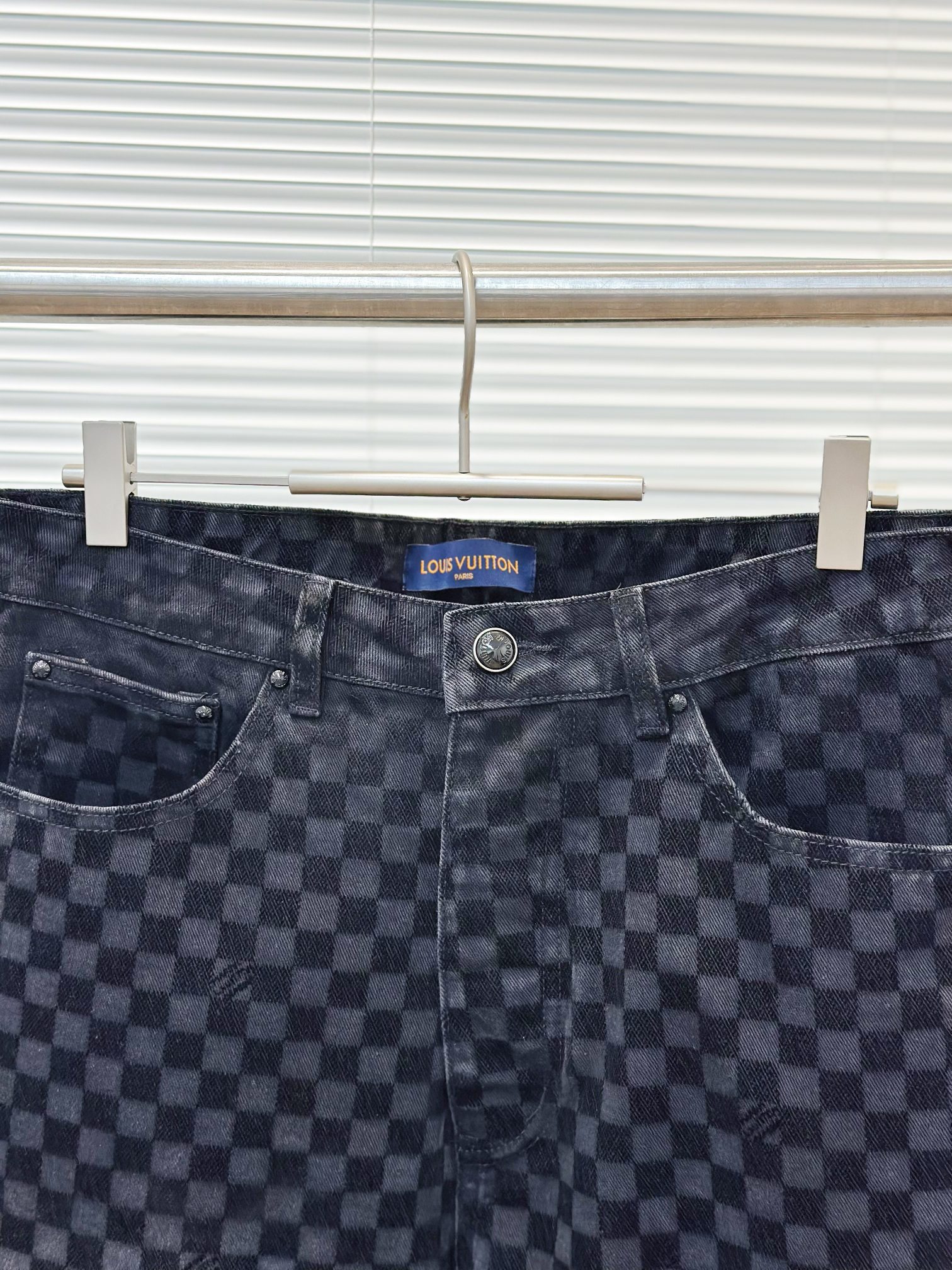These Louis Vuitton 2025 checkered flocked denim pants are a stylish addition to any wardrobe, offering both comfort and a unique design.