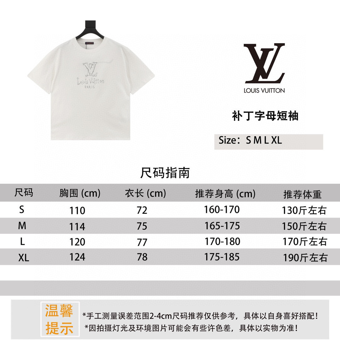 Experience luxury with this Louis Vuitton T-shirt featuring custom cotton fabric and a unique patch letter design. Available in sizes S-XL.