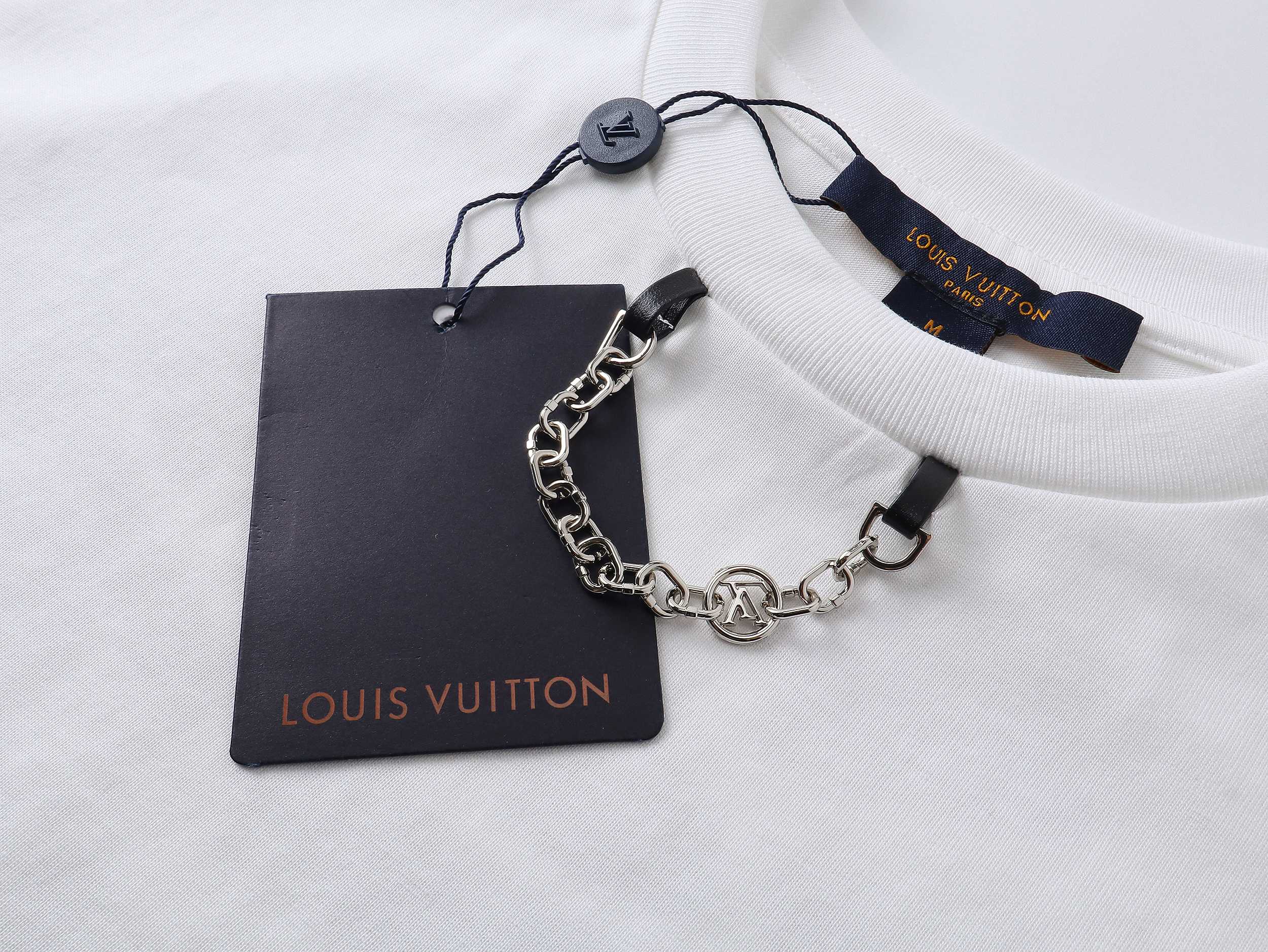 Elevate your casual look with this Louis Vuitton white T-shirt. Features chain detail, premium cotton, and a comfortable, relaxed fit. Perfect for everyday wear.