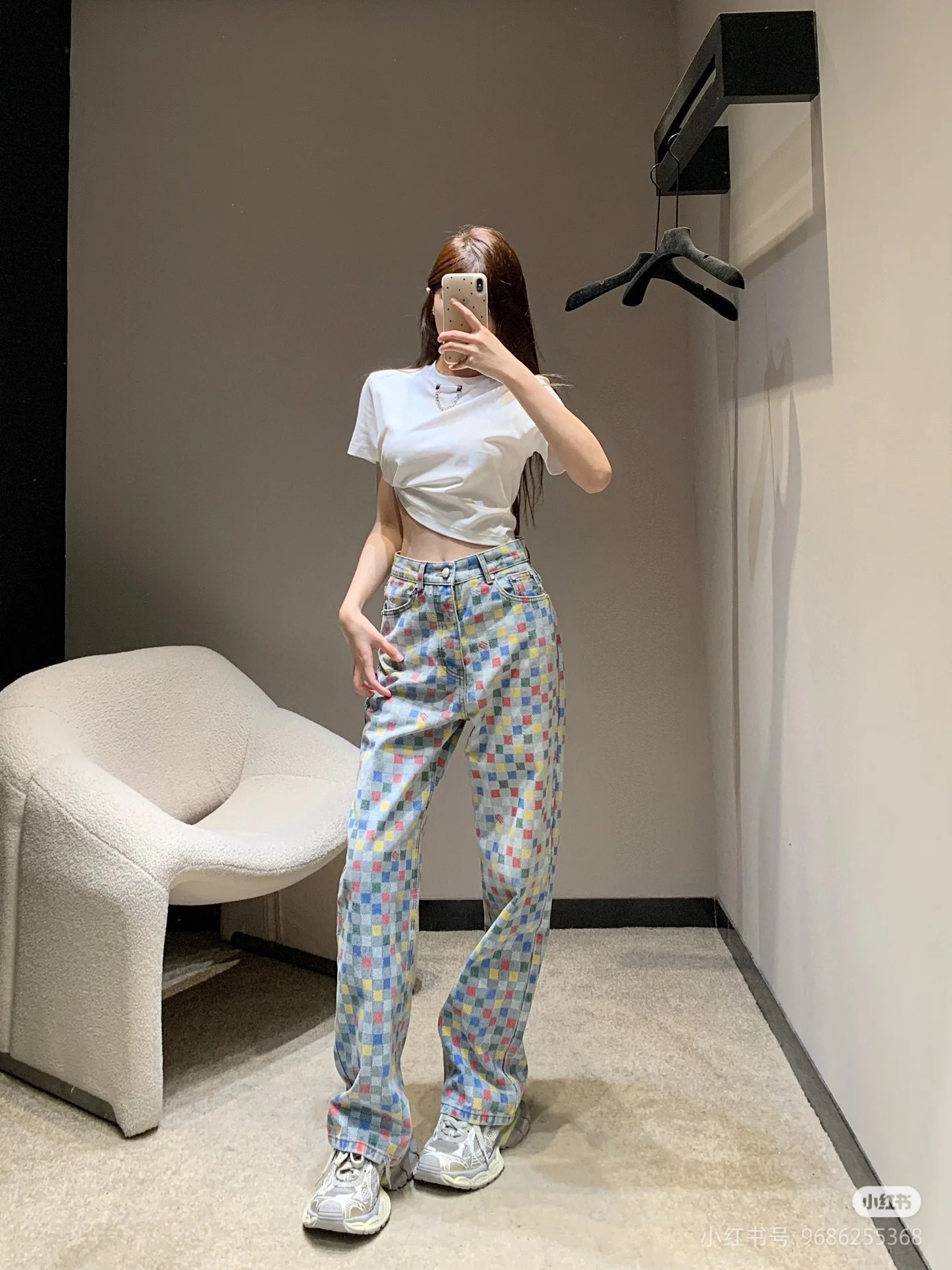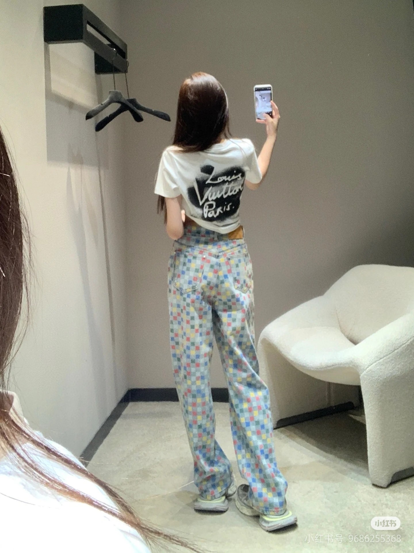 Elevate your wardrobe with these modern Louis Vuitton jeans. Featuring a unique colorful checkered pattern and premium denim, they offer both style and comfort.