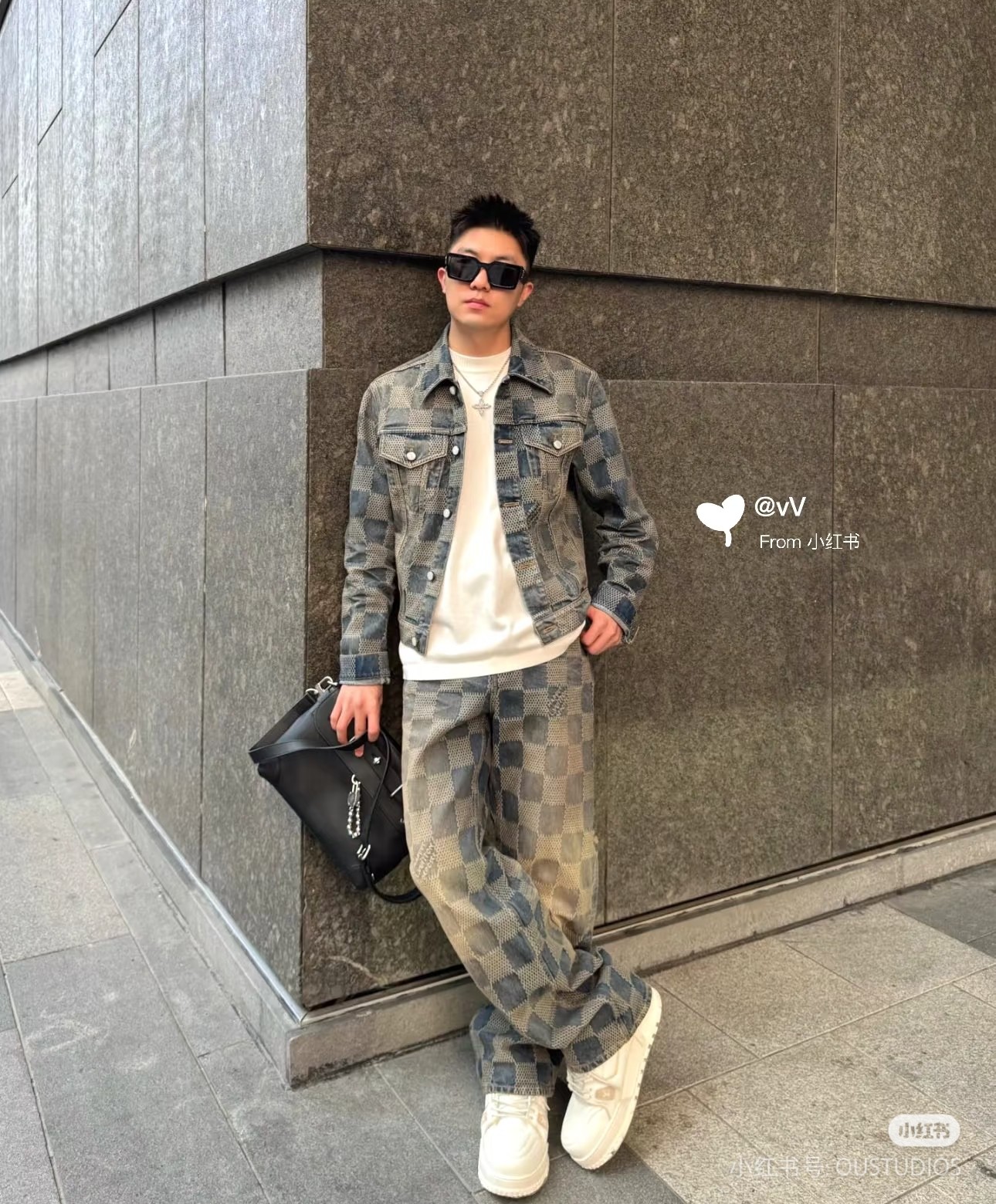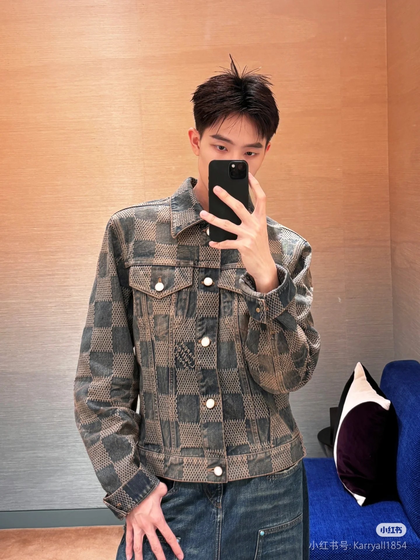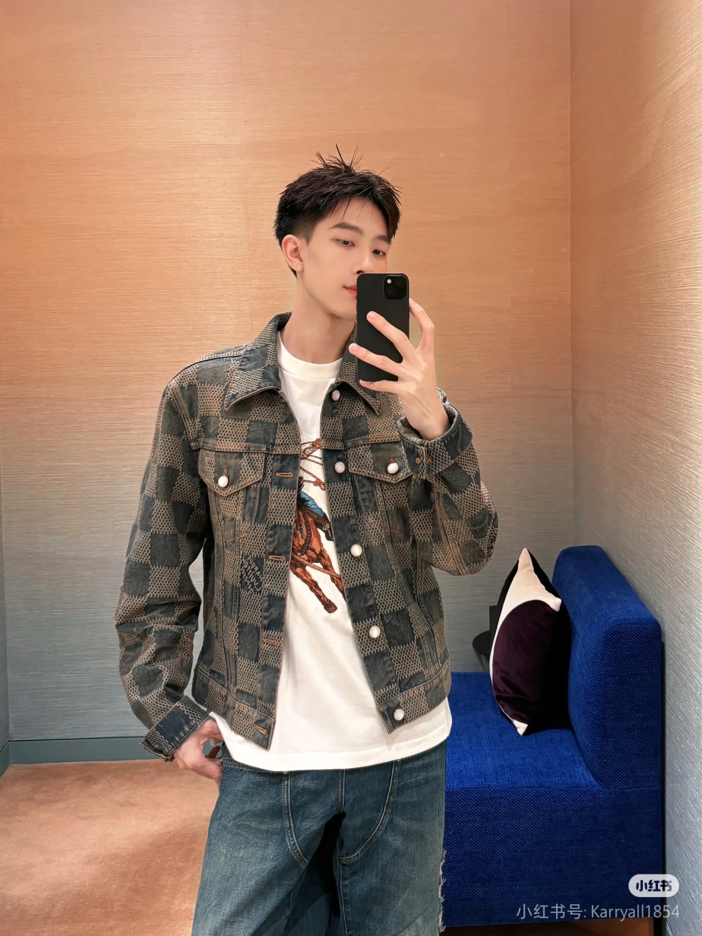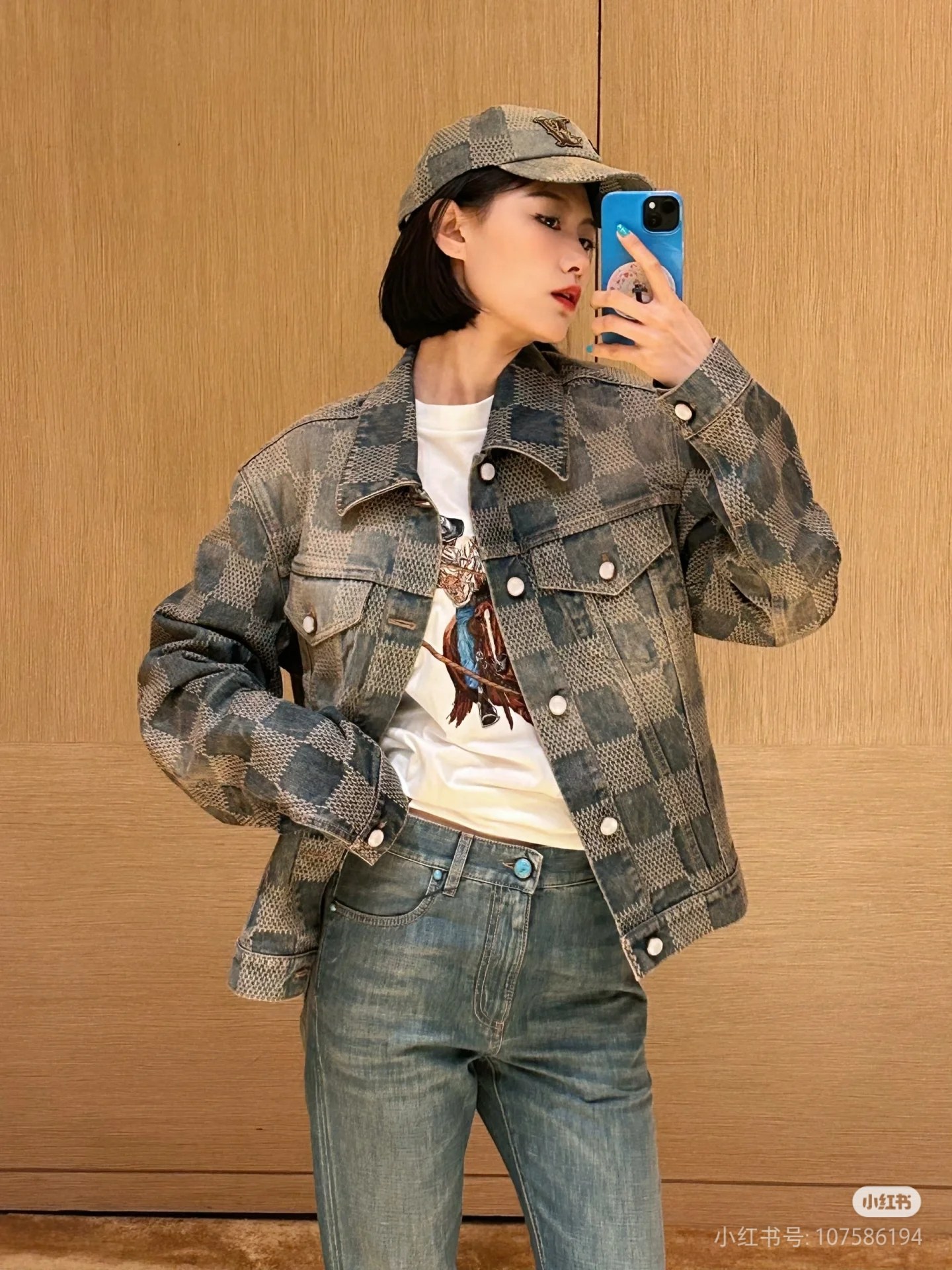 Louis Vuitton Inspired Vintage Denim Jacket with 3D Damier Pattern
