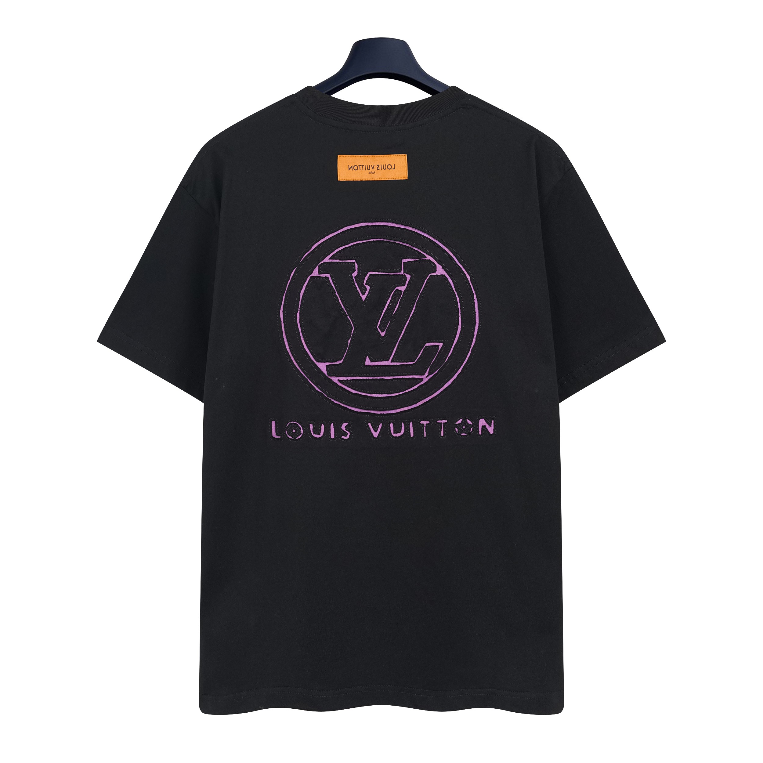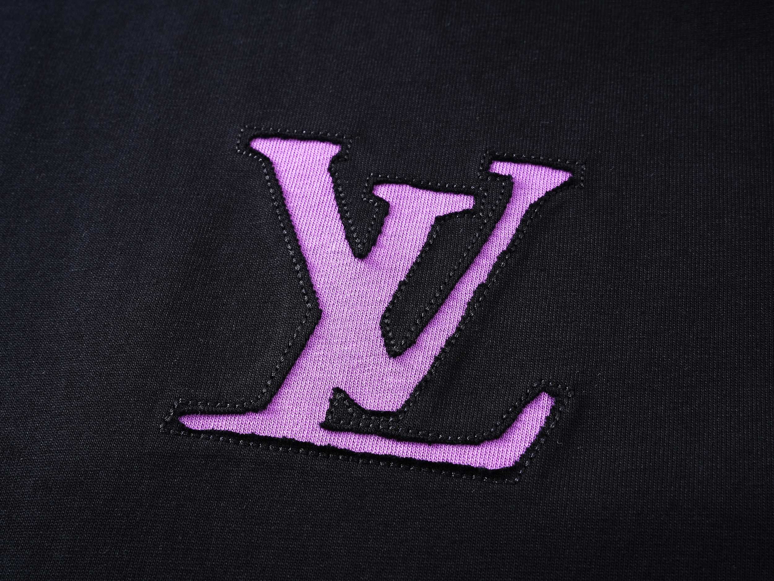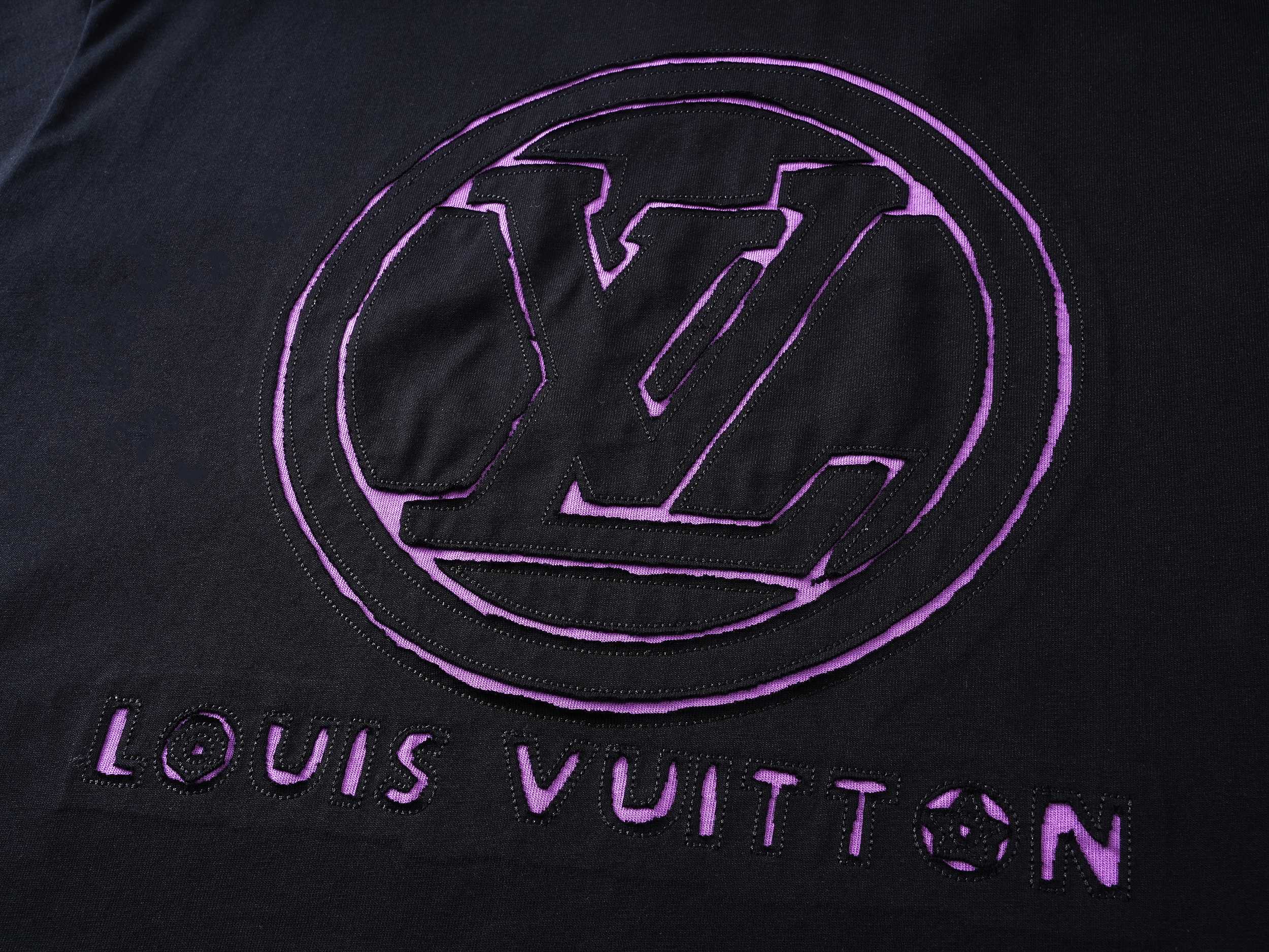 Elevate your style with this Louis Vuitton black T-shirt featuring a purple logo. Made with high-quality cotton for ultimate comfort.
