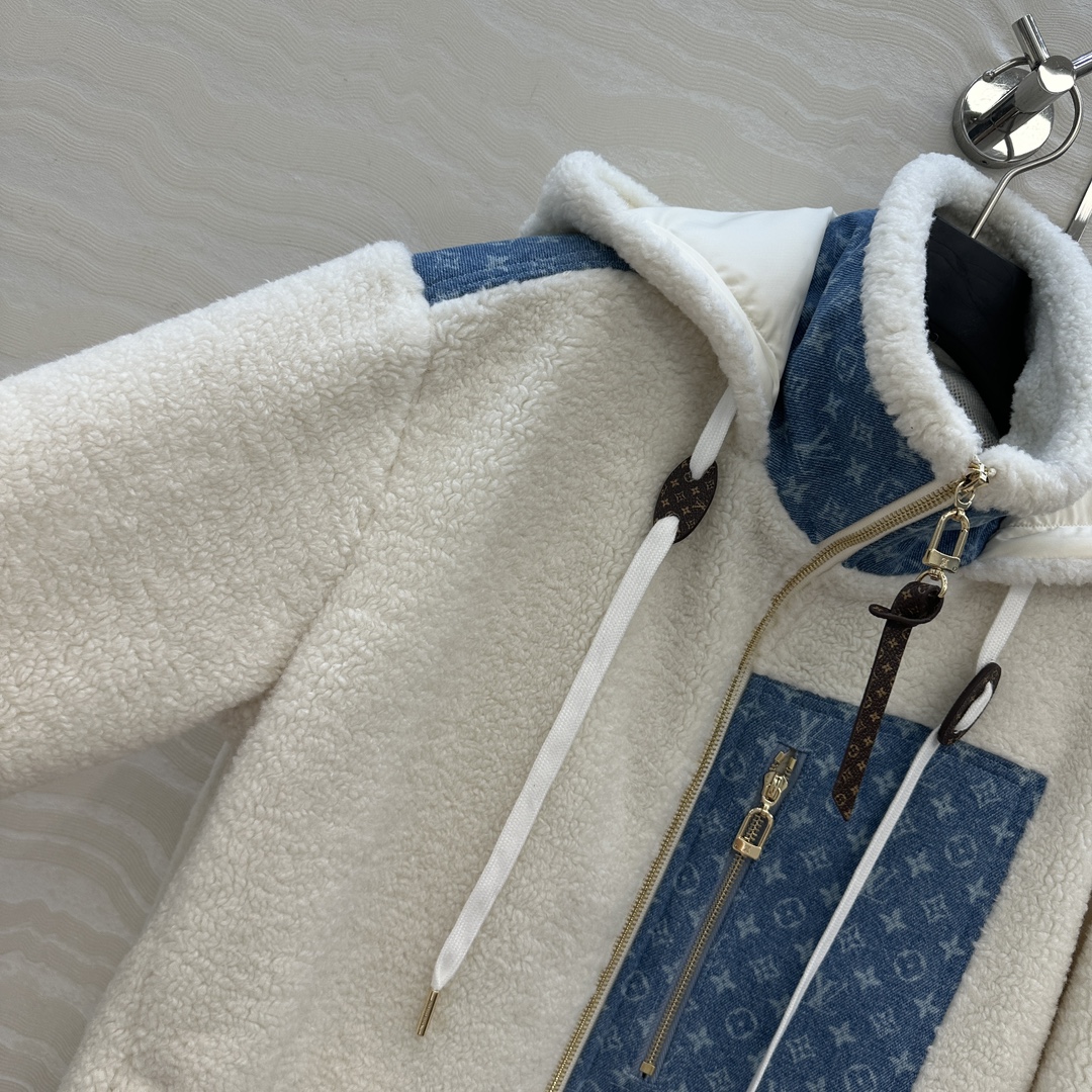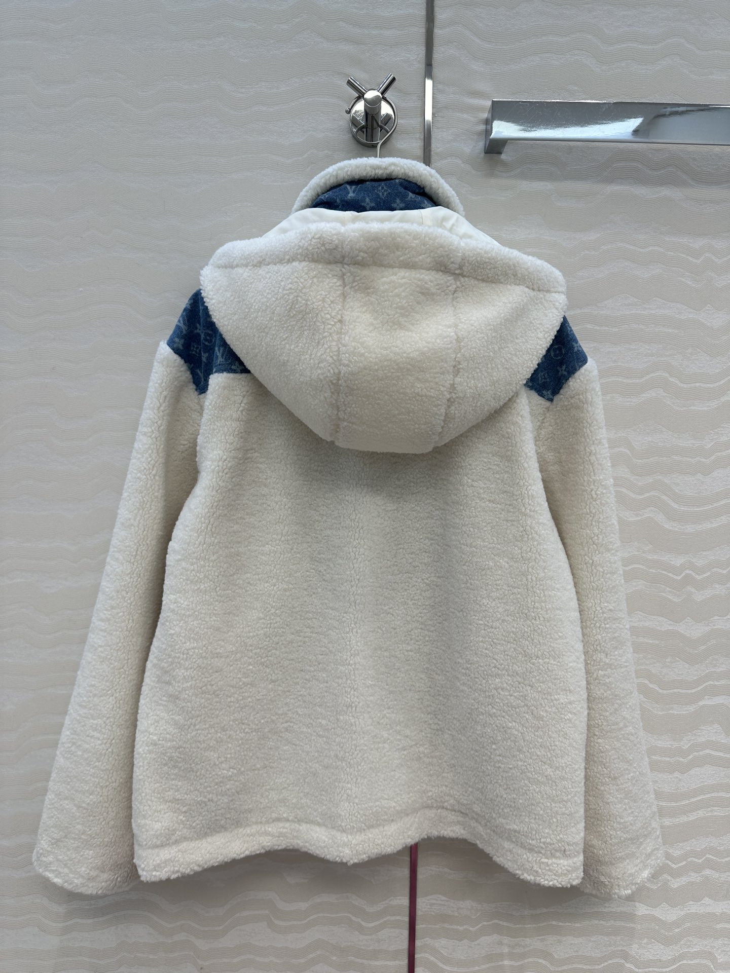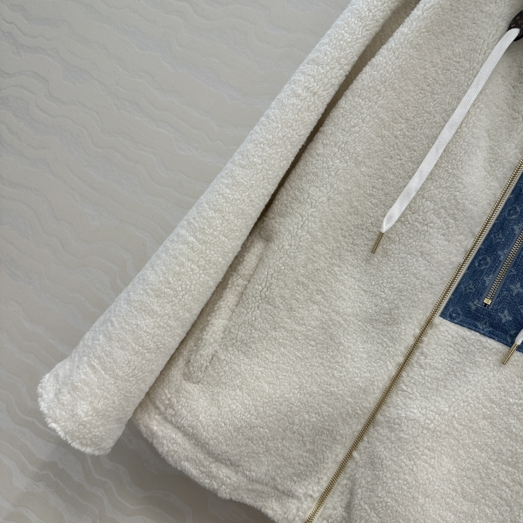 Stay cozy in this Louis Vuitton Monogram teddy fleece jacket. Features a hood, zipper closure, and stylish denim accents. Perfect for a chic, youthful look!