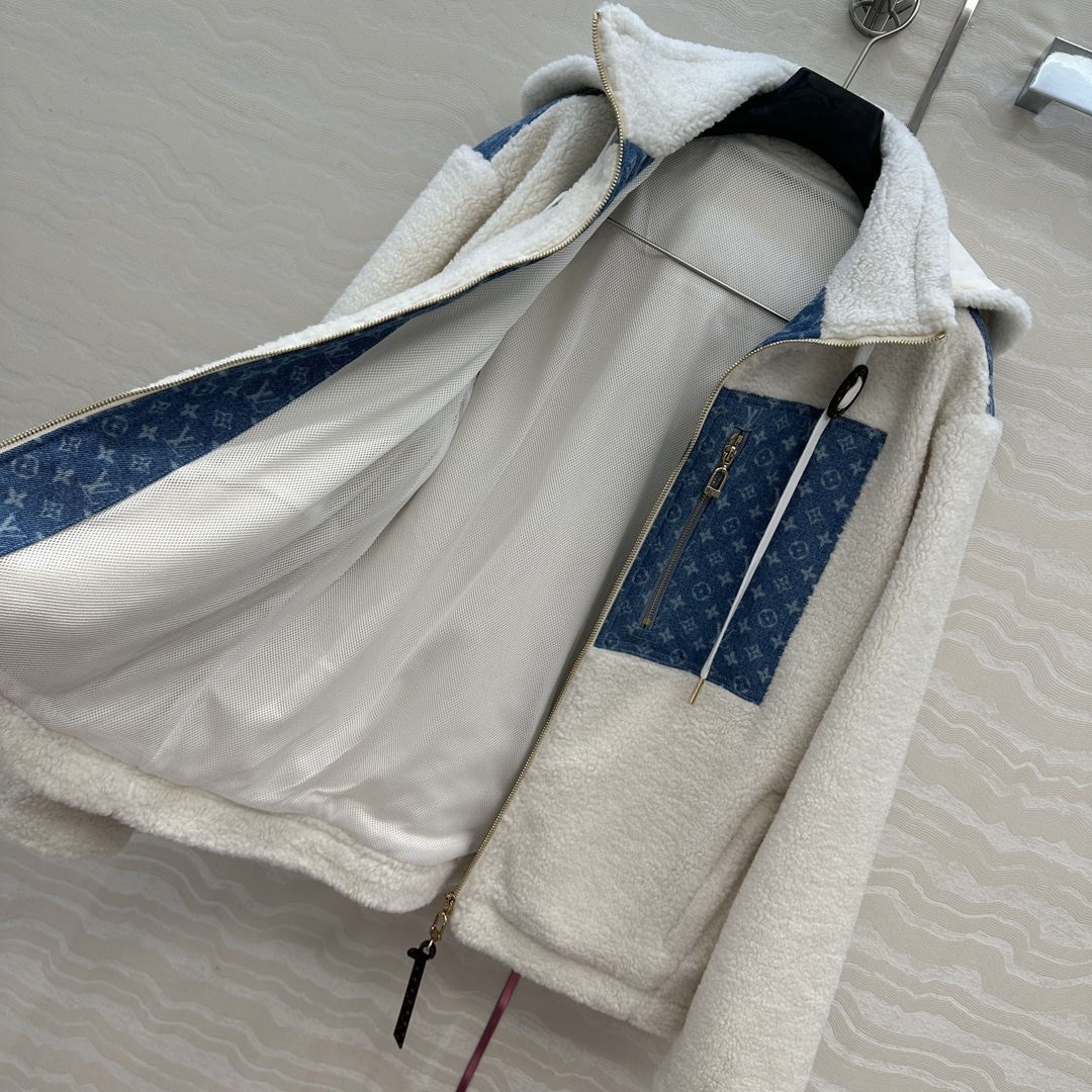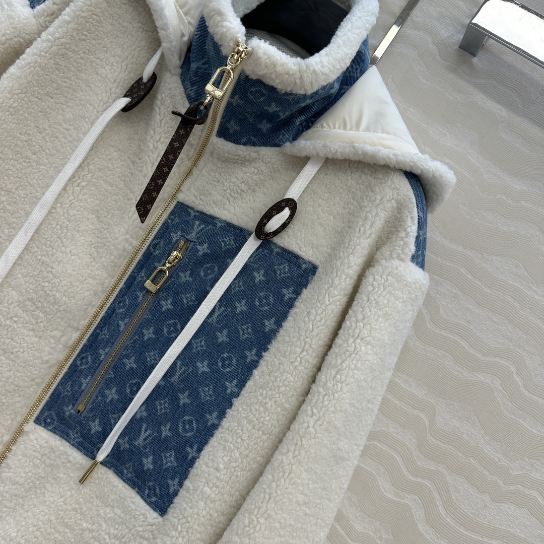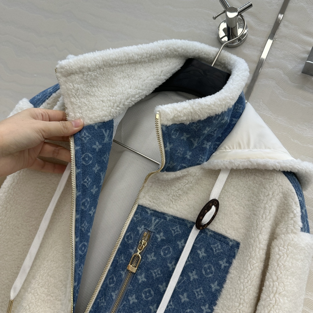 Stay cozy in this Louis Vuitton Monogram teddy fleece jacket. Features a hood, zipper closure, and stylish denim accents. Perfect for a chic, youthful look!