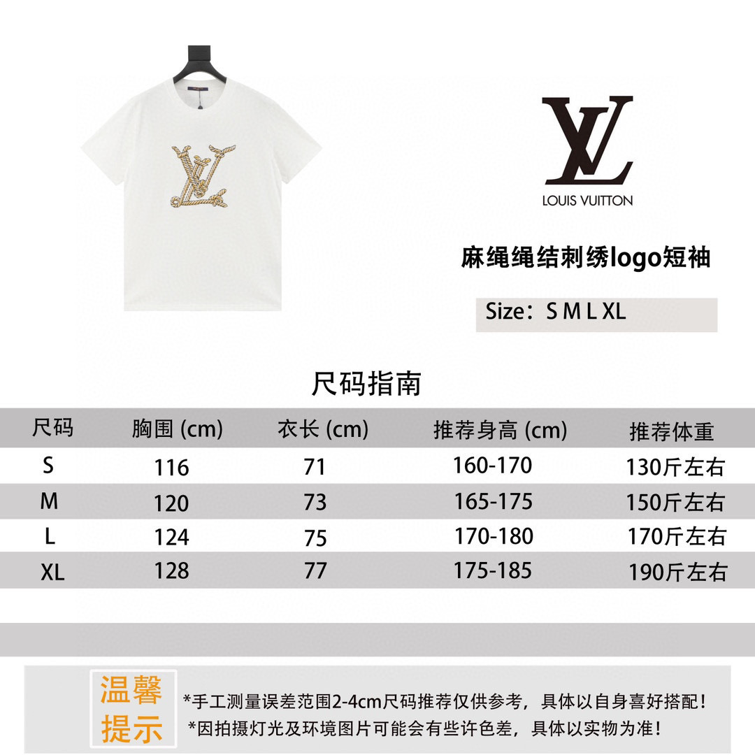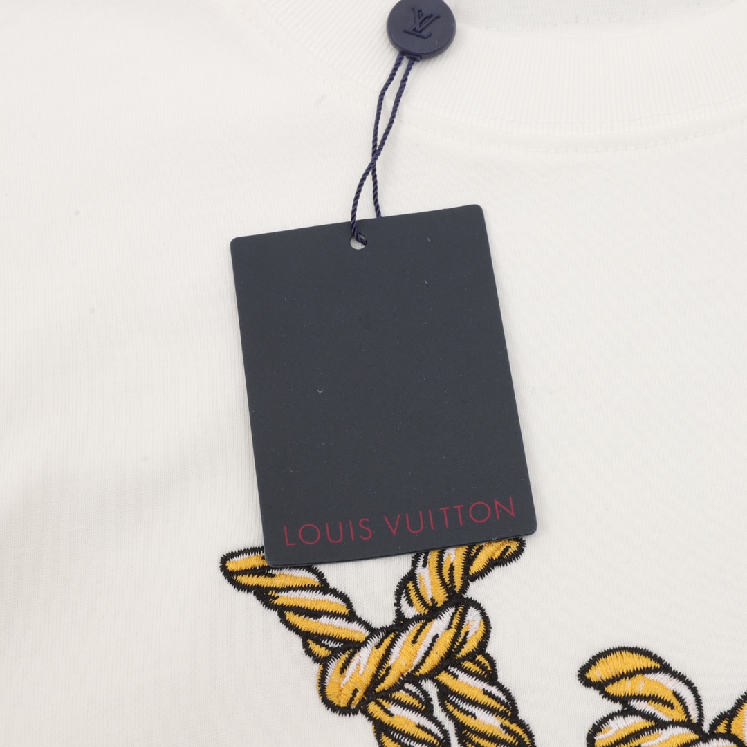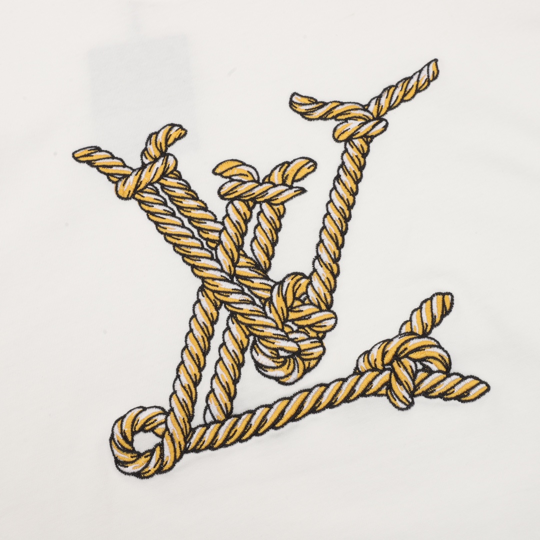 This Louis Vuitton T-shirt is a stylish and comfortable addition to any wardrobe. Made from high-quality cotton, it features a unique rope knot embroidery of the iconic LV logo, making it a standout piece.