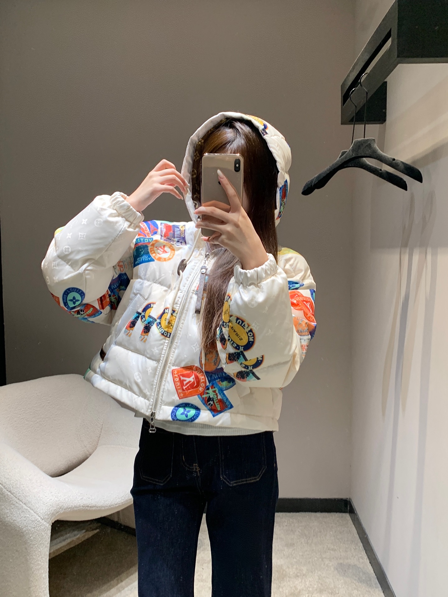 Stay warm and stylish in this white Louis Vuitton down jacket. Features a playful flying stamp print, hooded design, and flattering short cut.