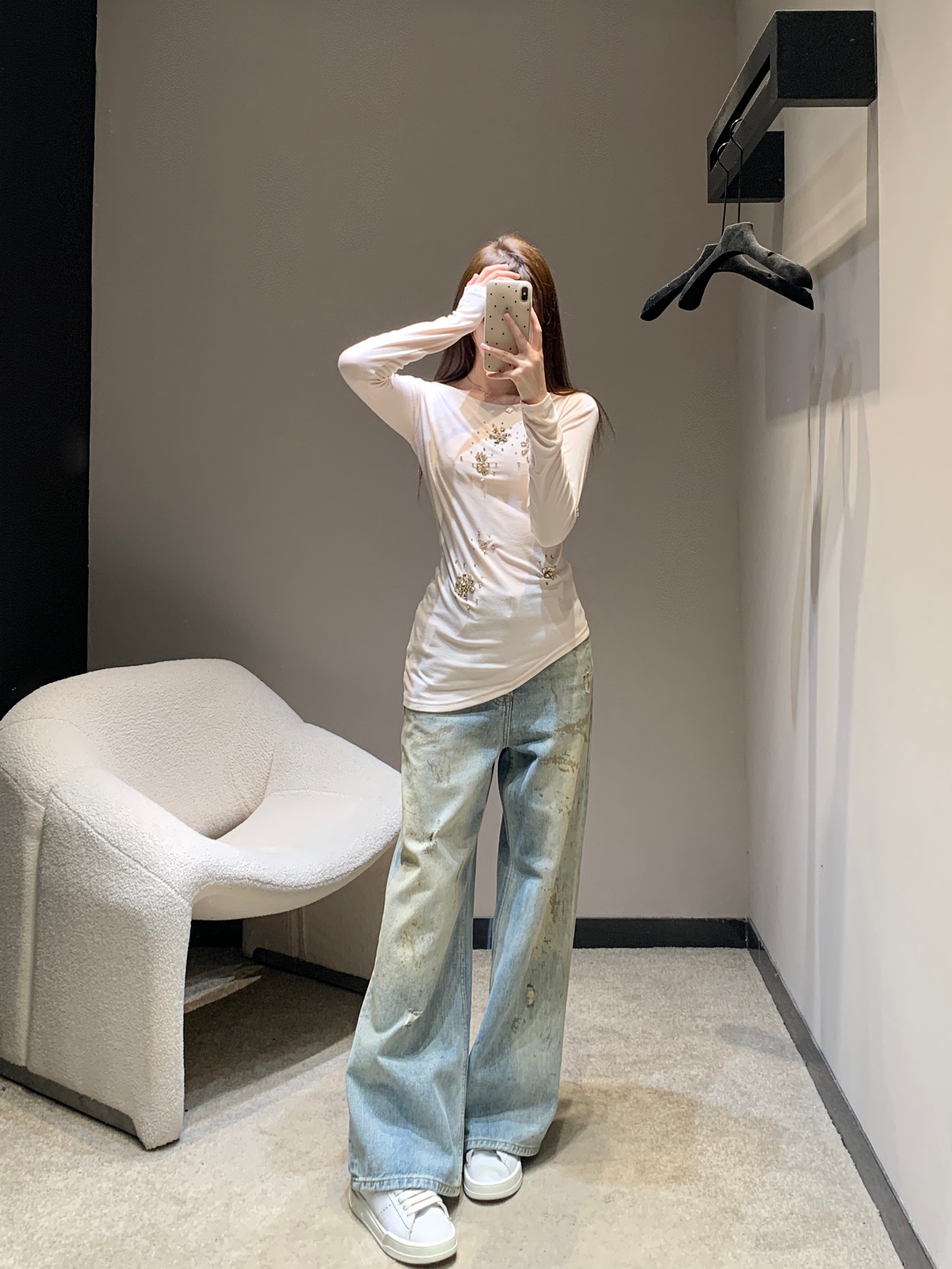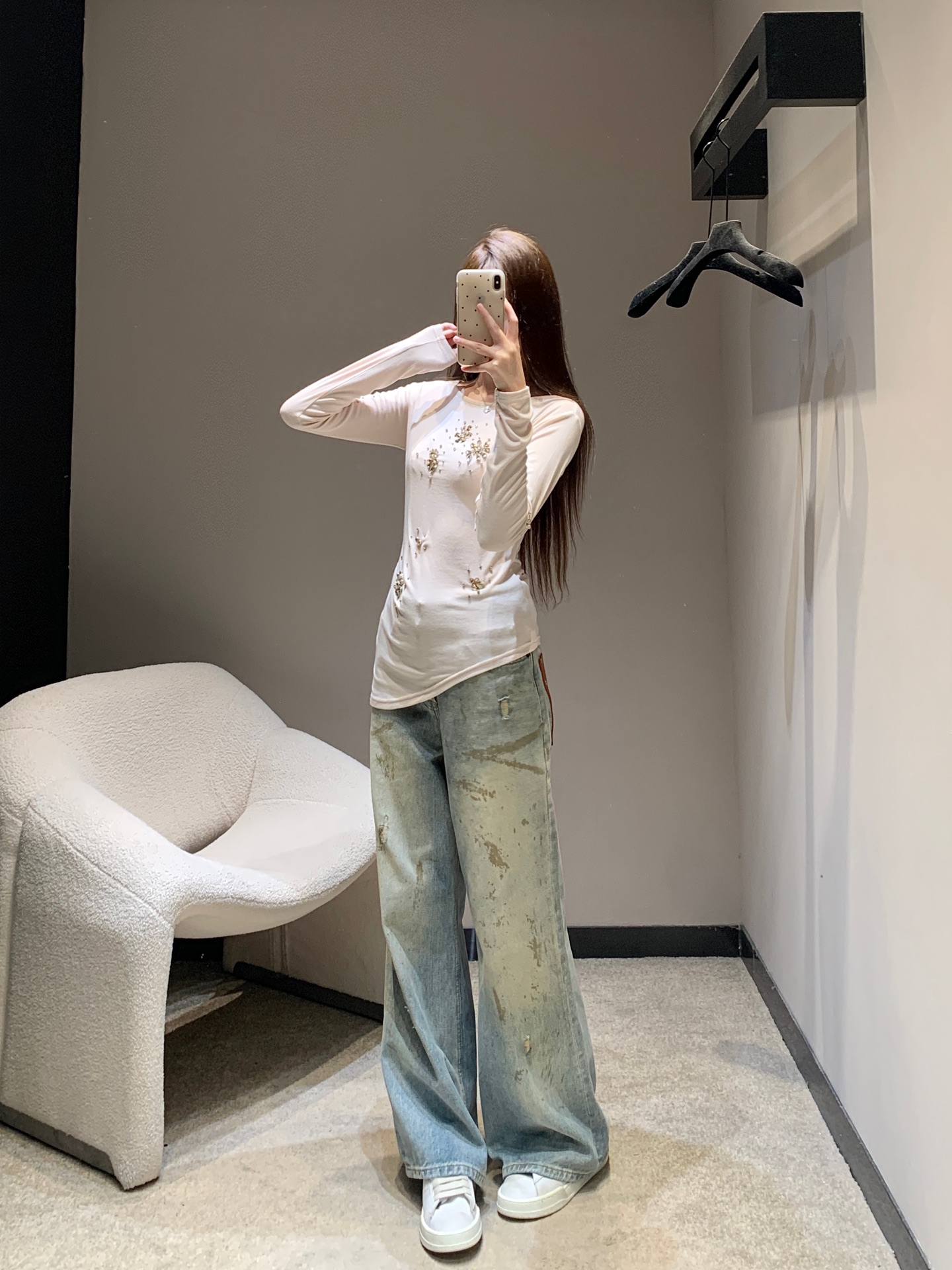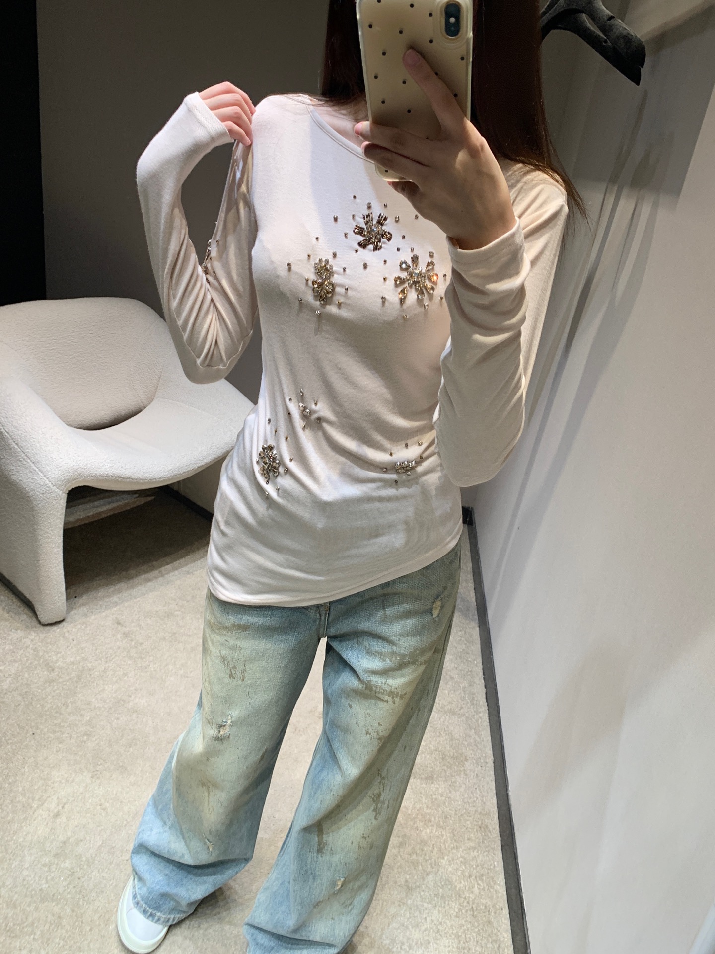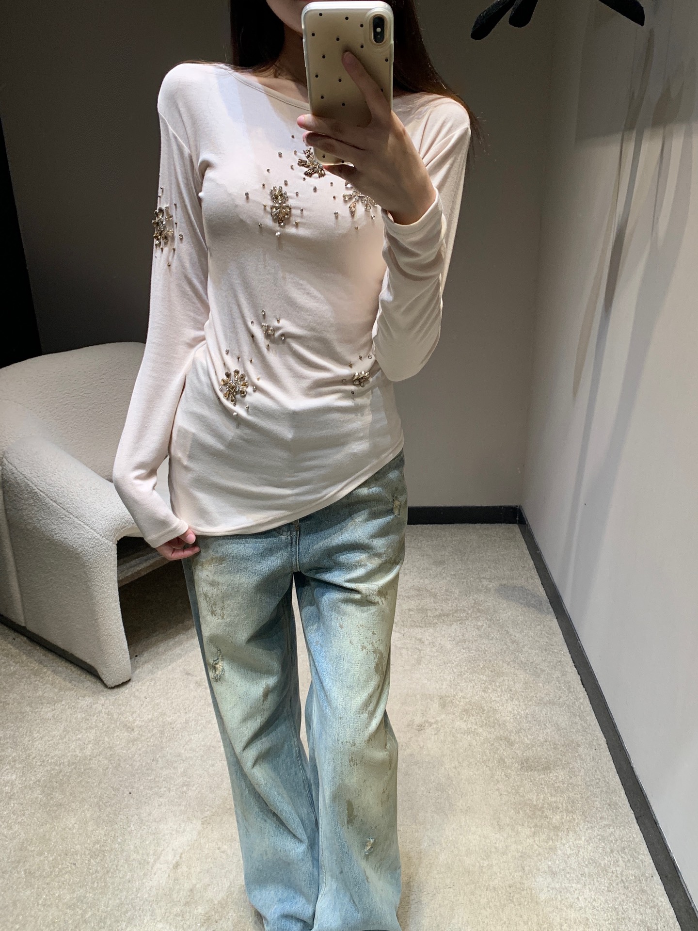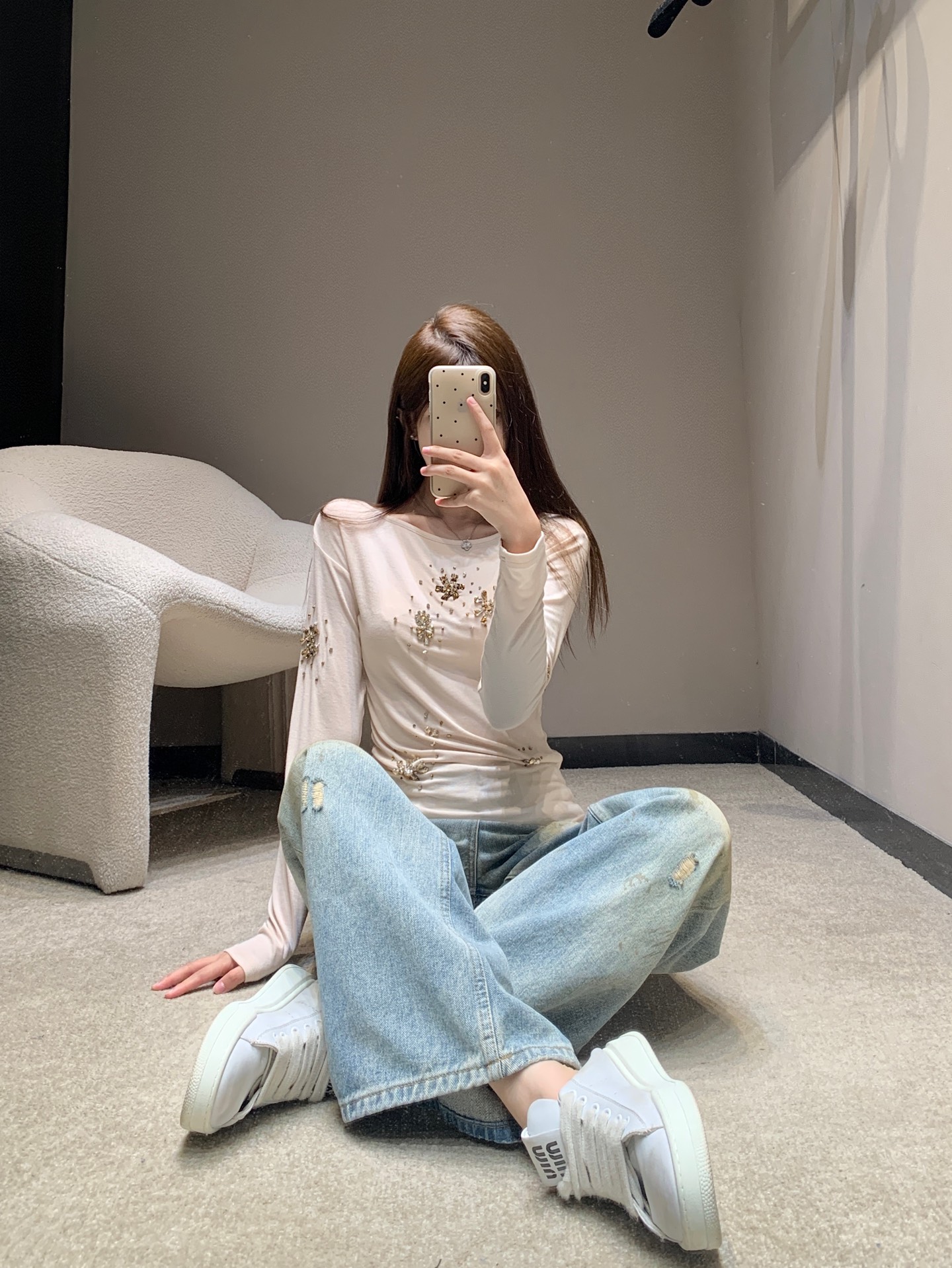 This Miu Miu long-sleeve top is a must-have for those who appreciate a blend of comfort and high fashion. Adorned with meticulously placed rhinestones, this piece adds a subtle yet striking sparkle to your wardrobe. It’s versatile enough to be dressed up for an evening out or worn casually during the day.