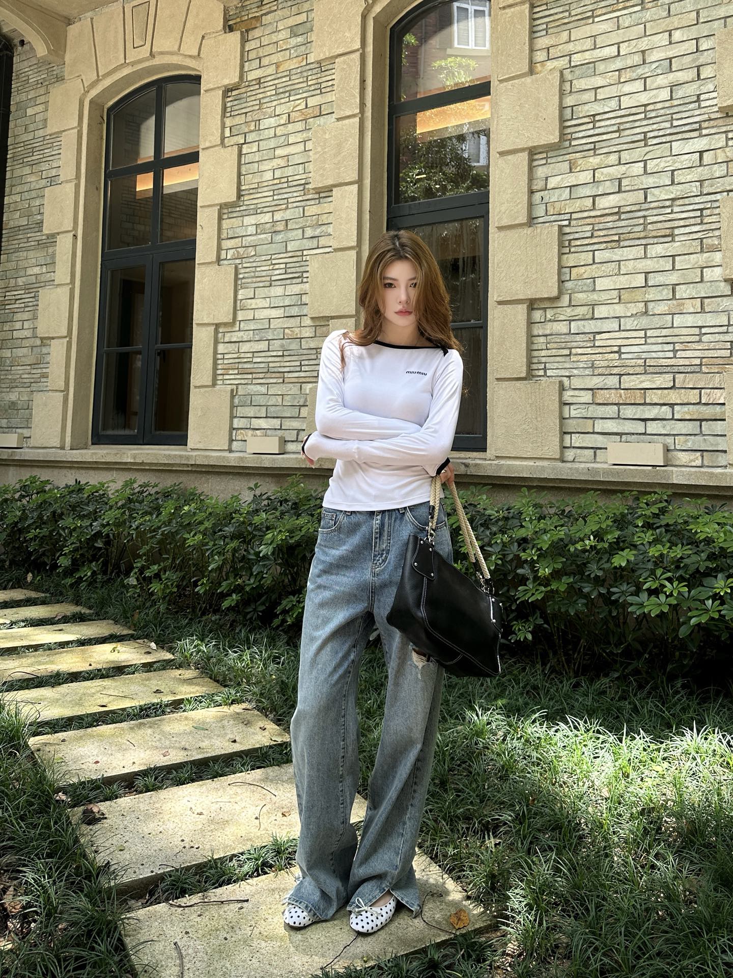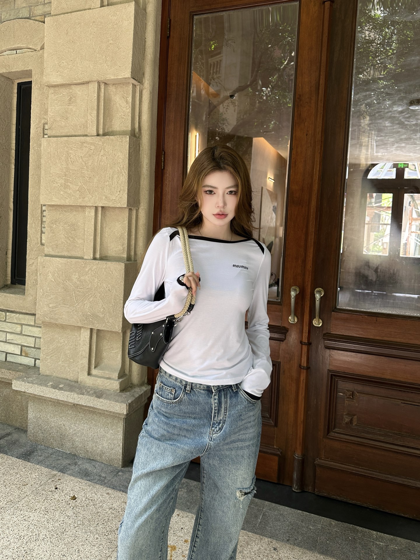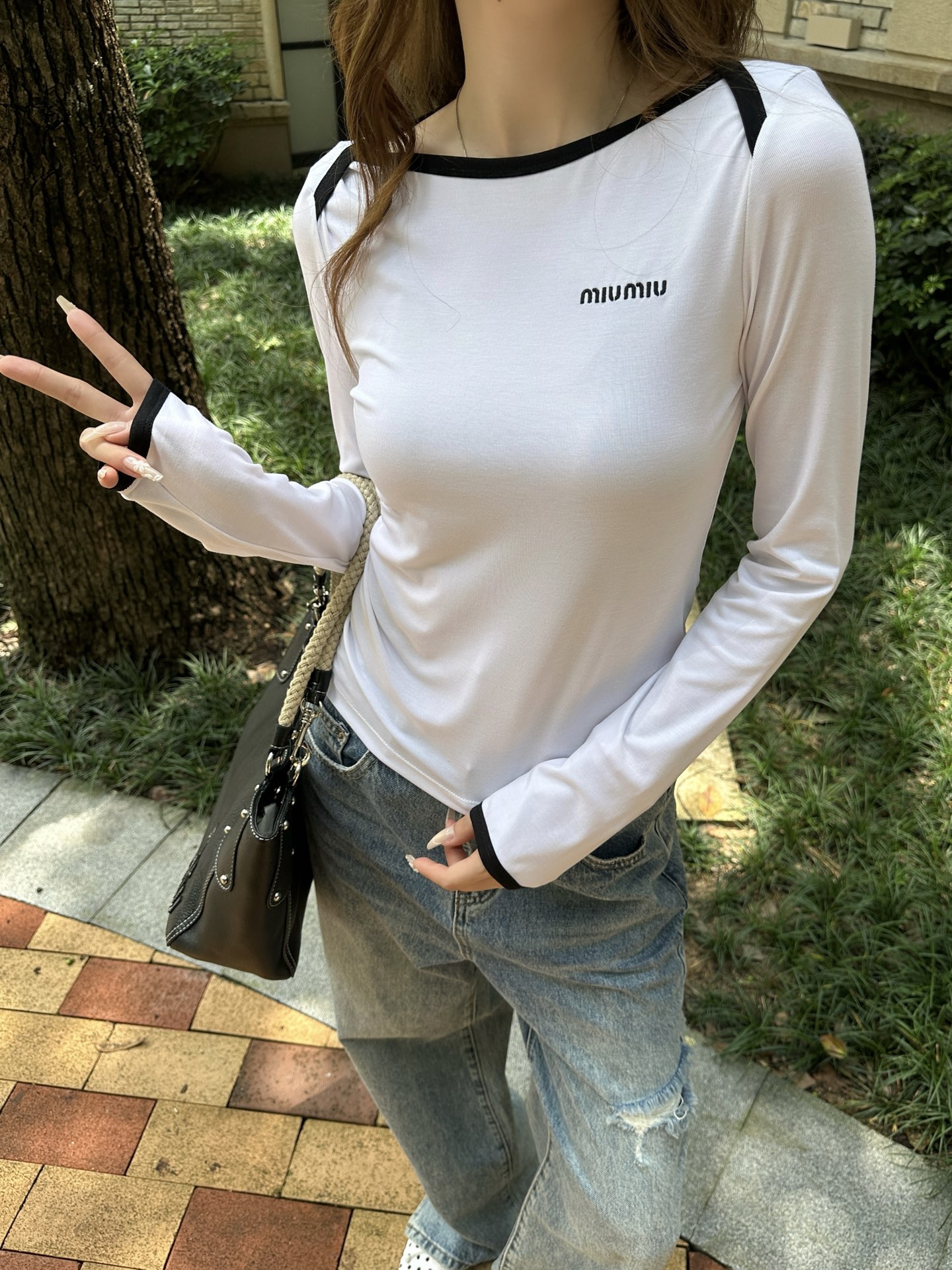 This Miu Miu long-sleeve T-shirt will quickly become a favorite in your wardrobe. Its combination of comfort, quality, and designer flair makes it a must-have for any fashion-conscious individual.